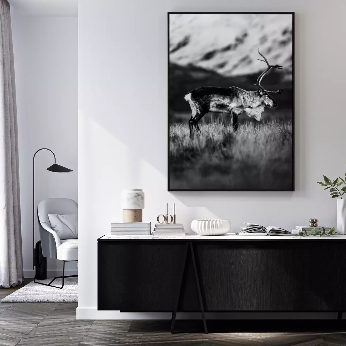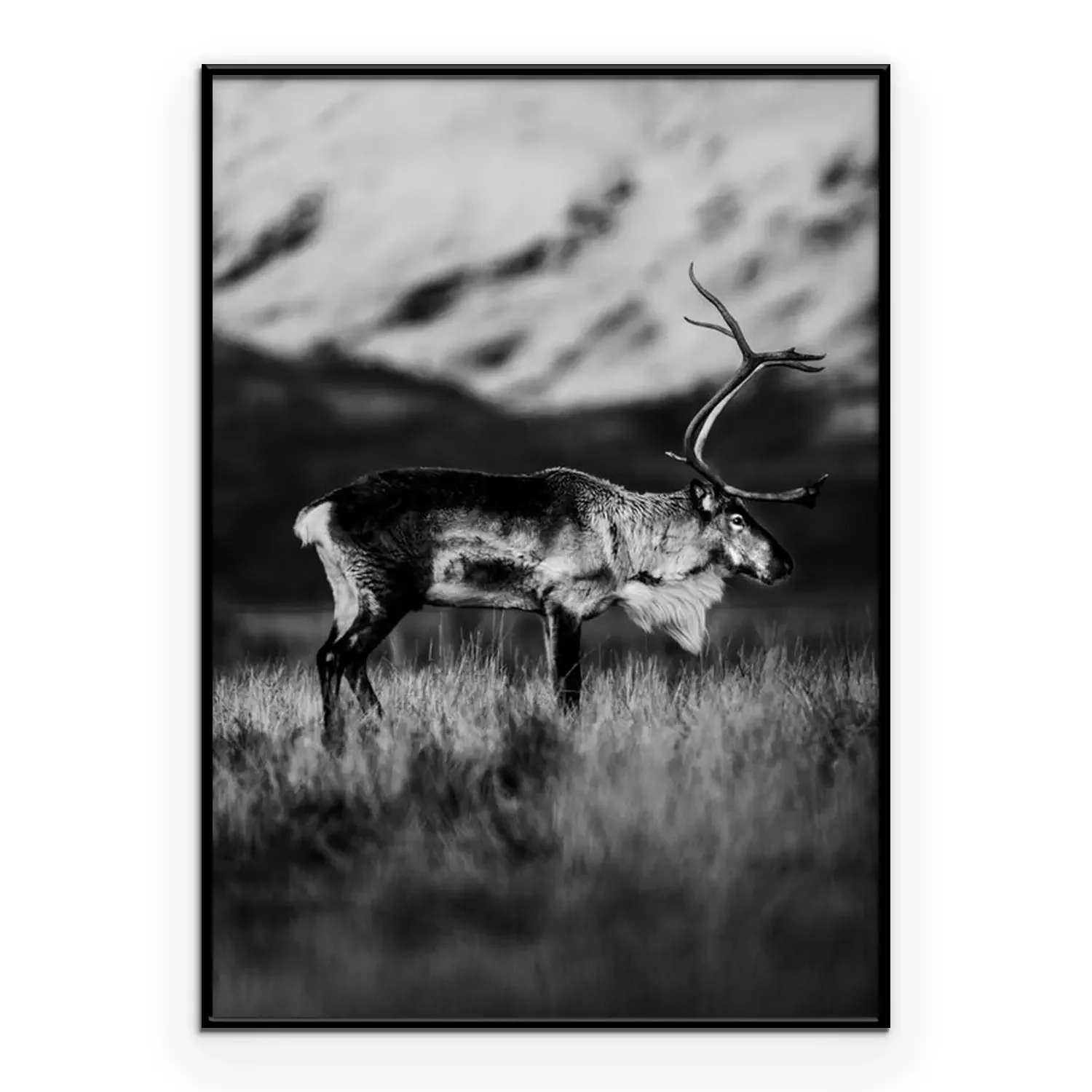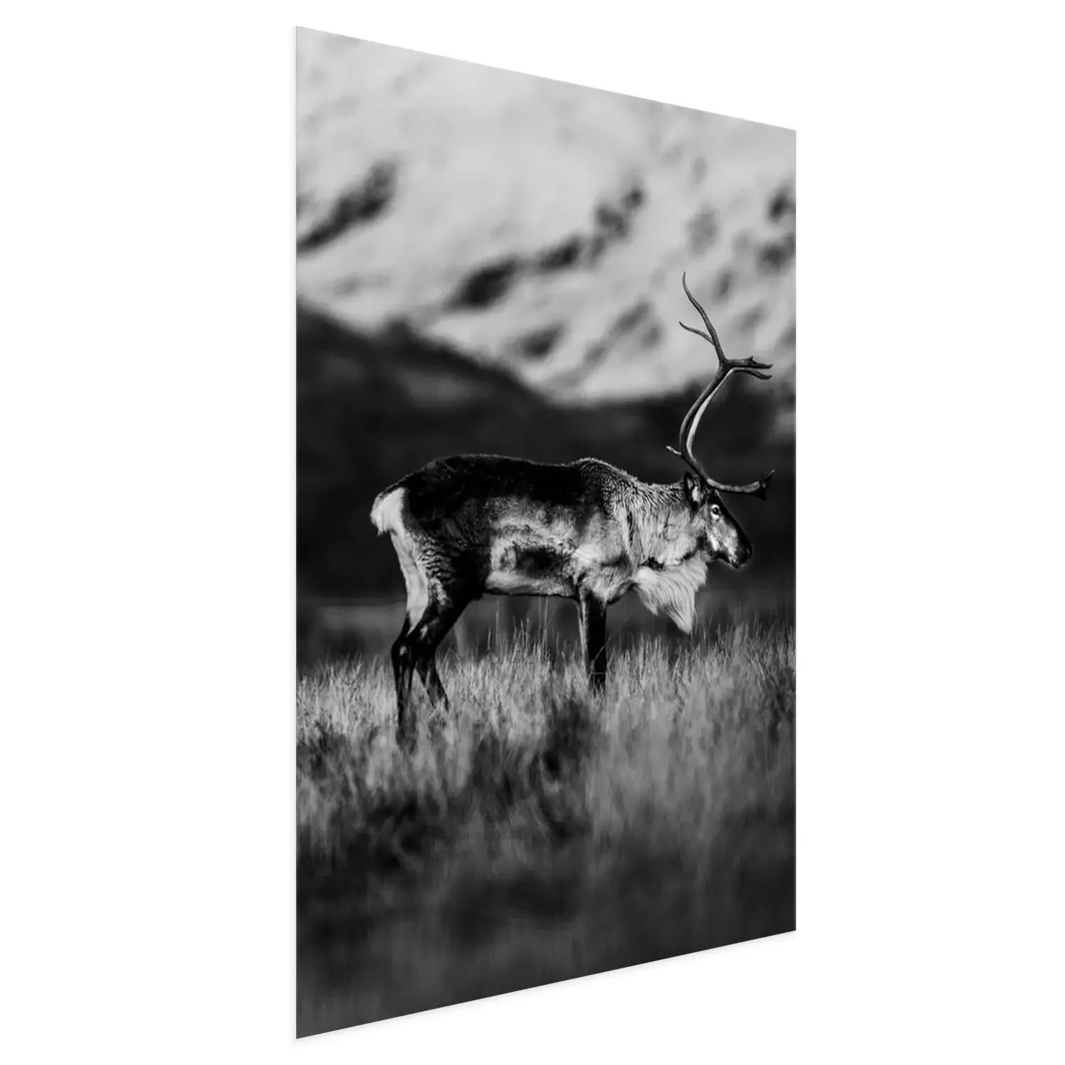 Poster: Schwarz-Weiß-Aufnahme eines Rentieres auf einer Bergwiese