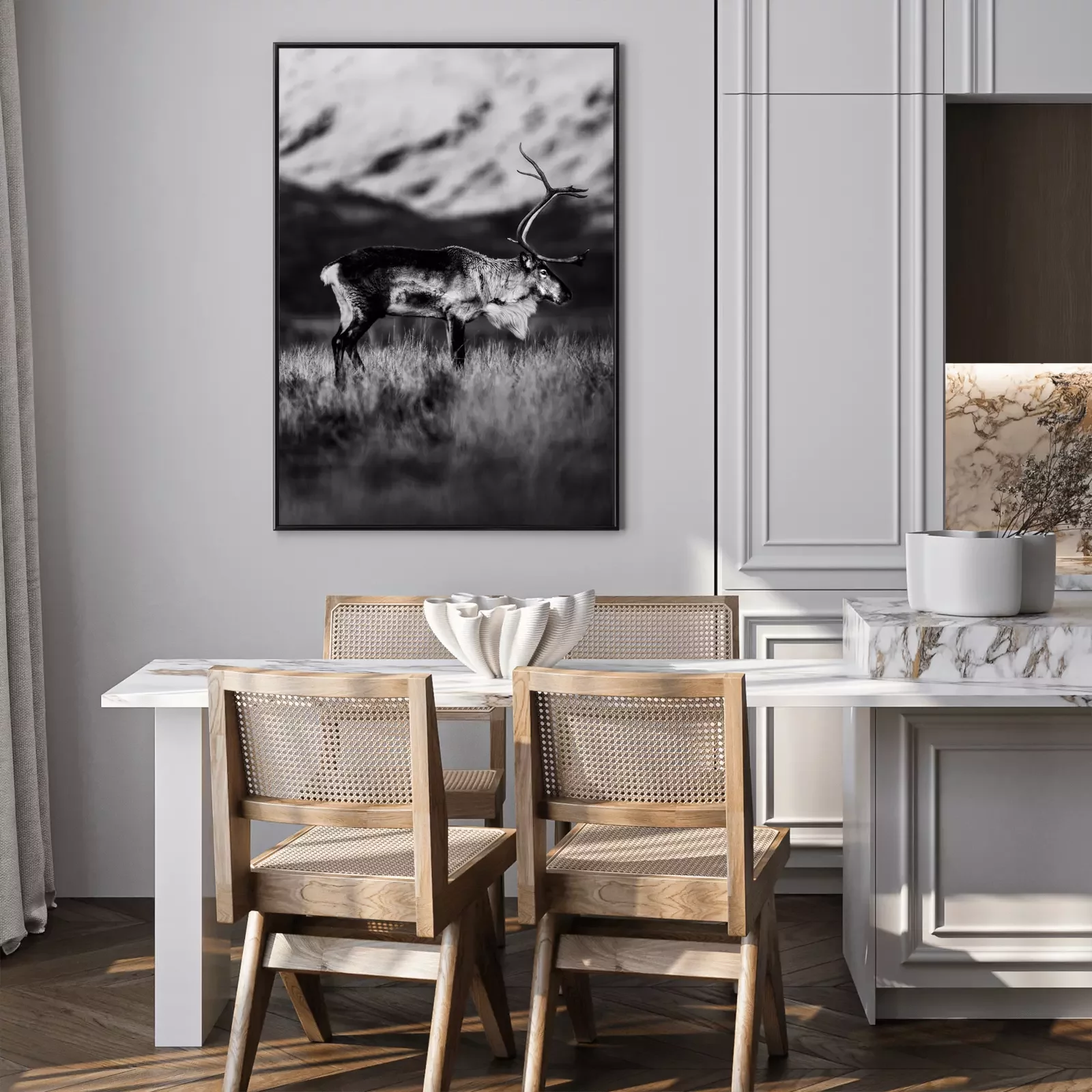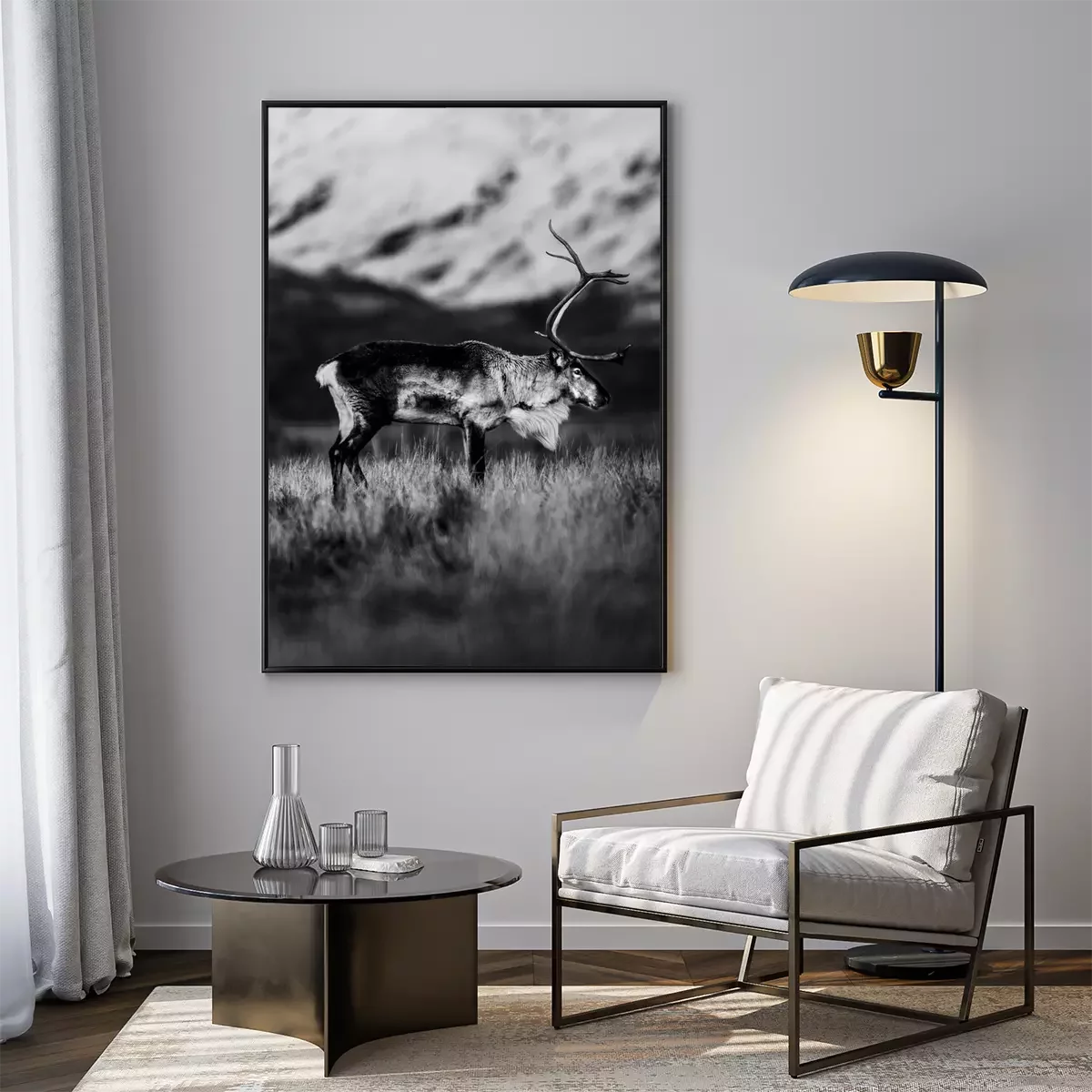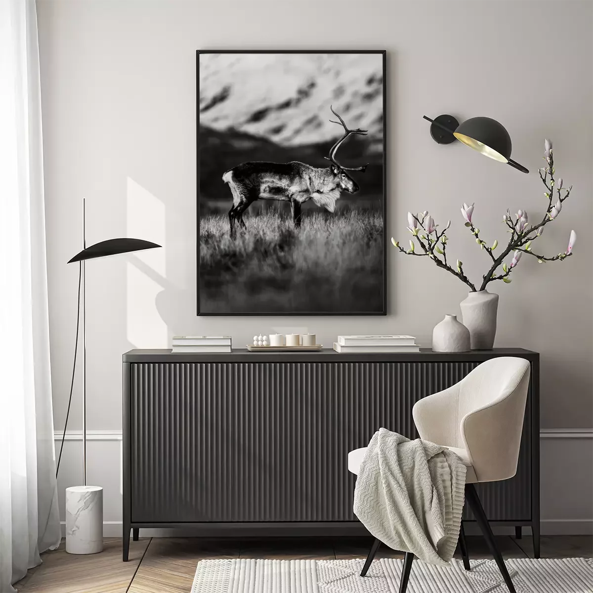 Poster: Schwarz-Weiß-Aufnahme eines Rentieres auf einer Bergwiese