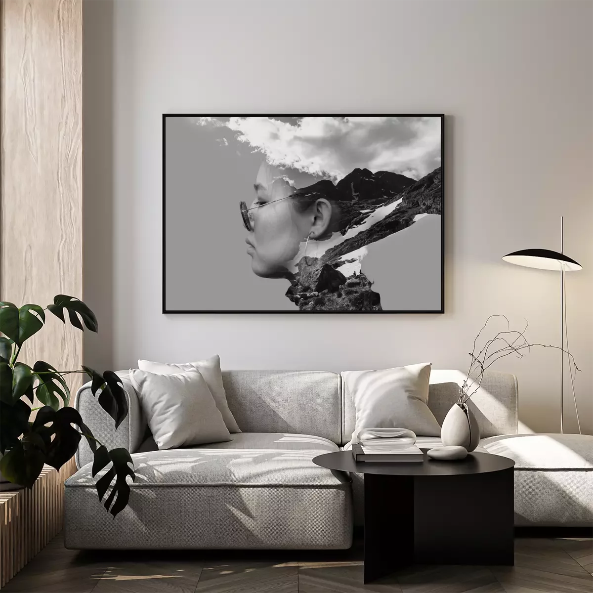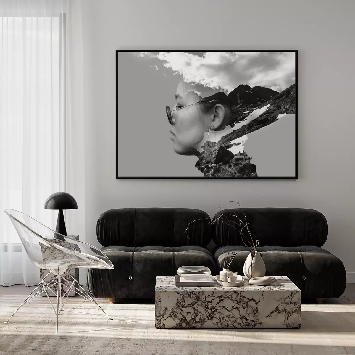 Poster: Schwarz-Weiß-Installation: Berge und Frau