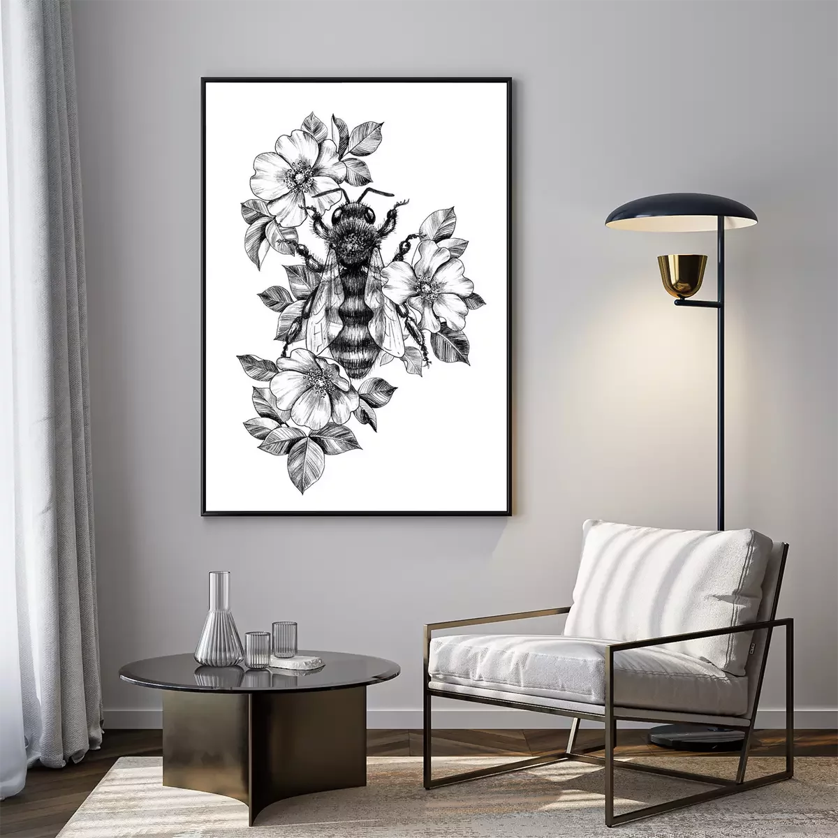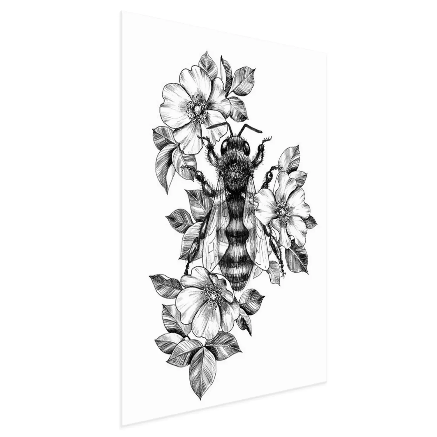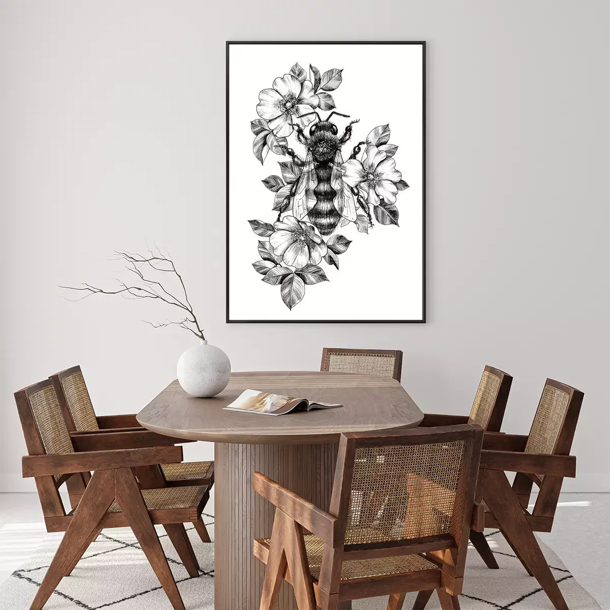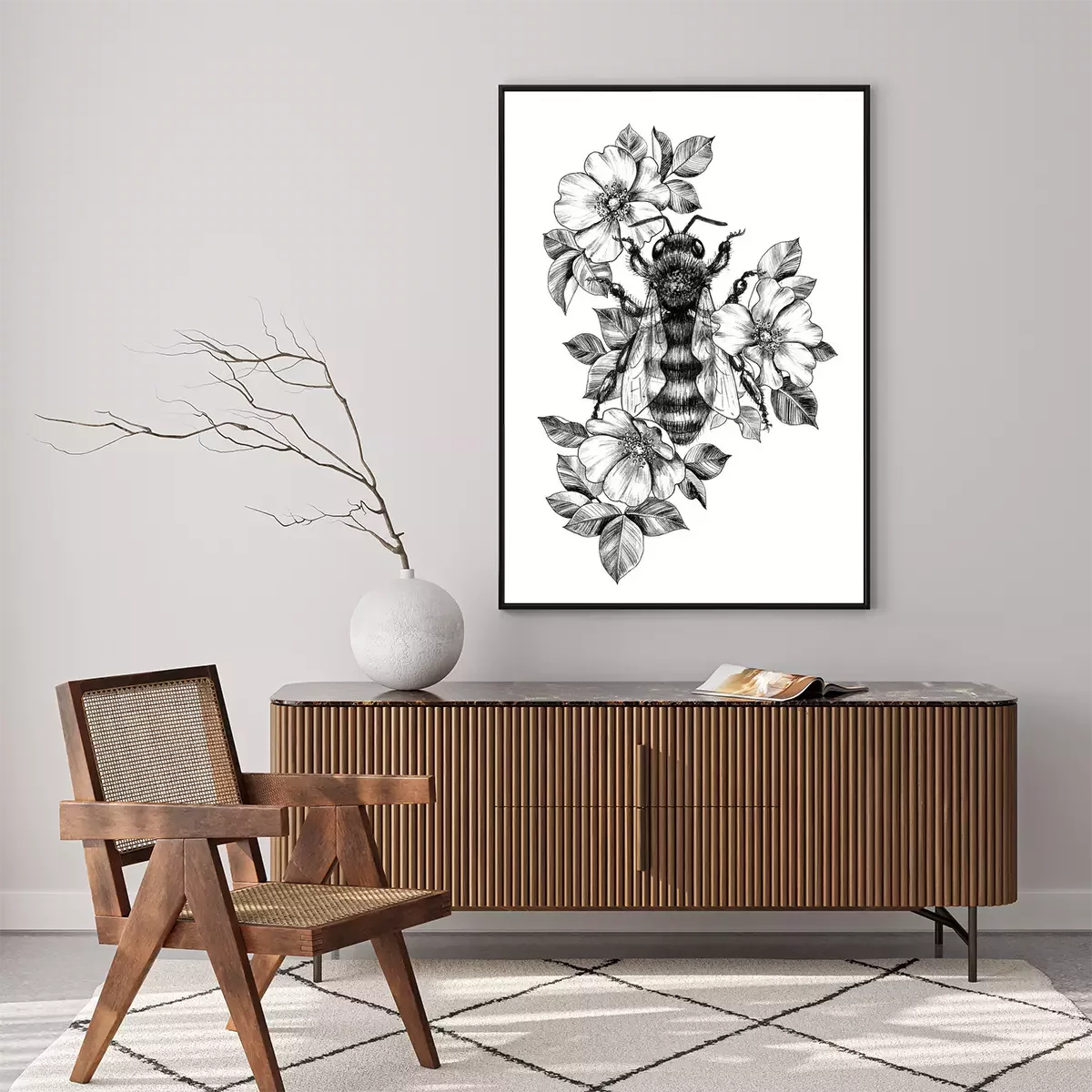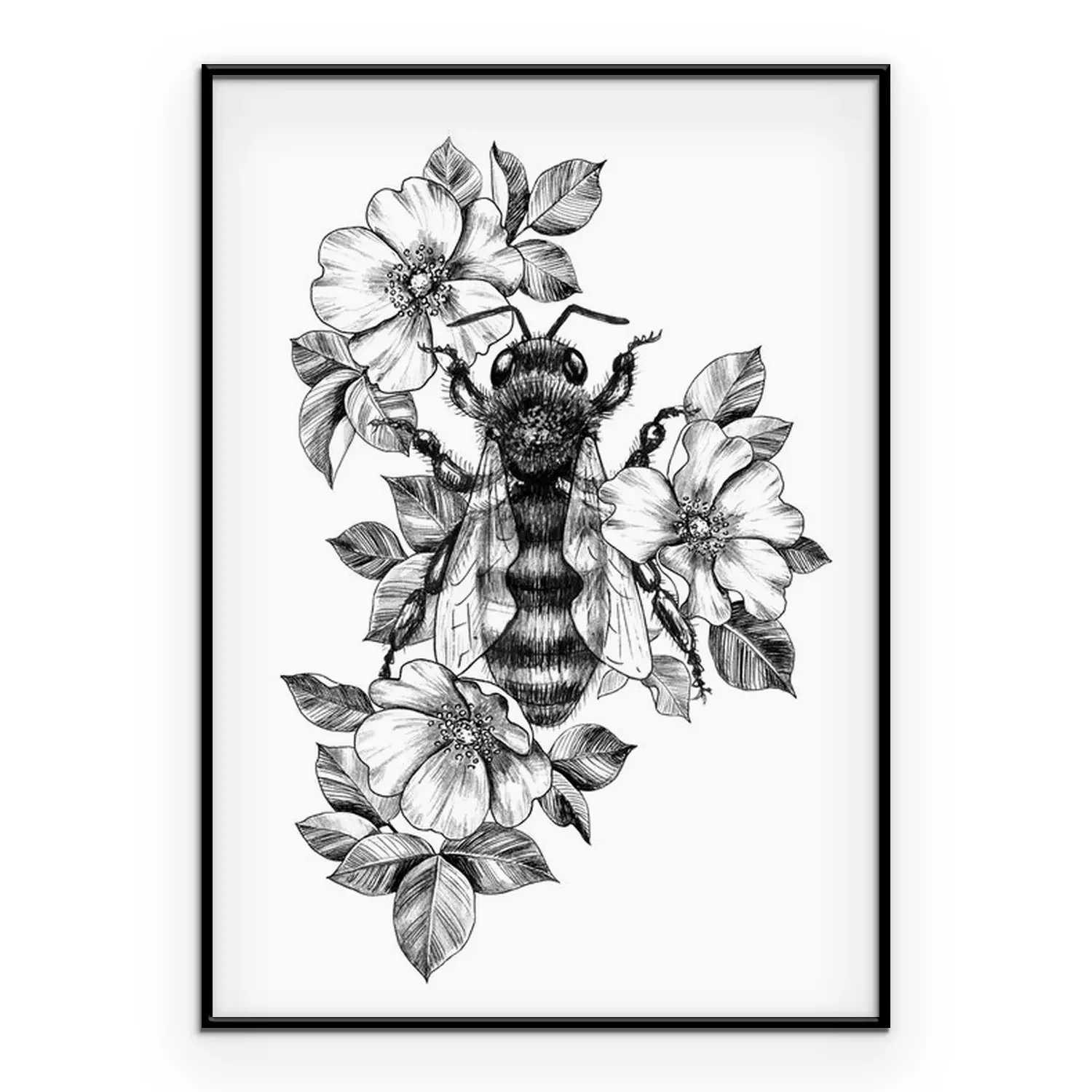 Poster: Schwarz-weiße Biene auf einer Wildrosenblüte