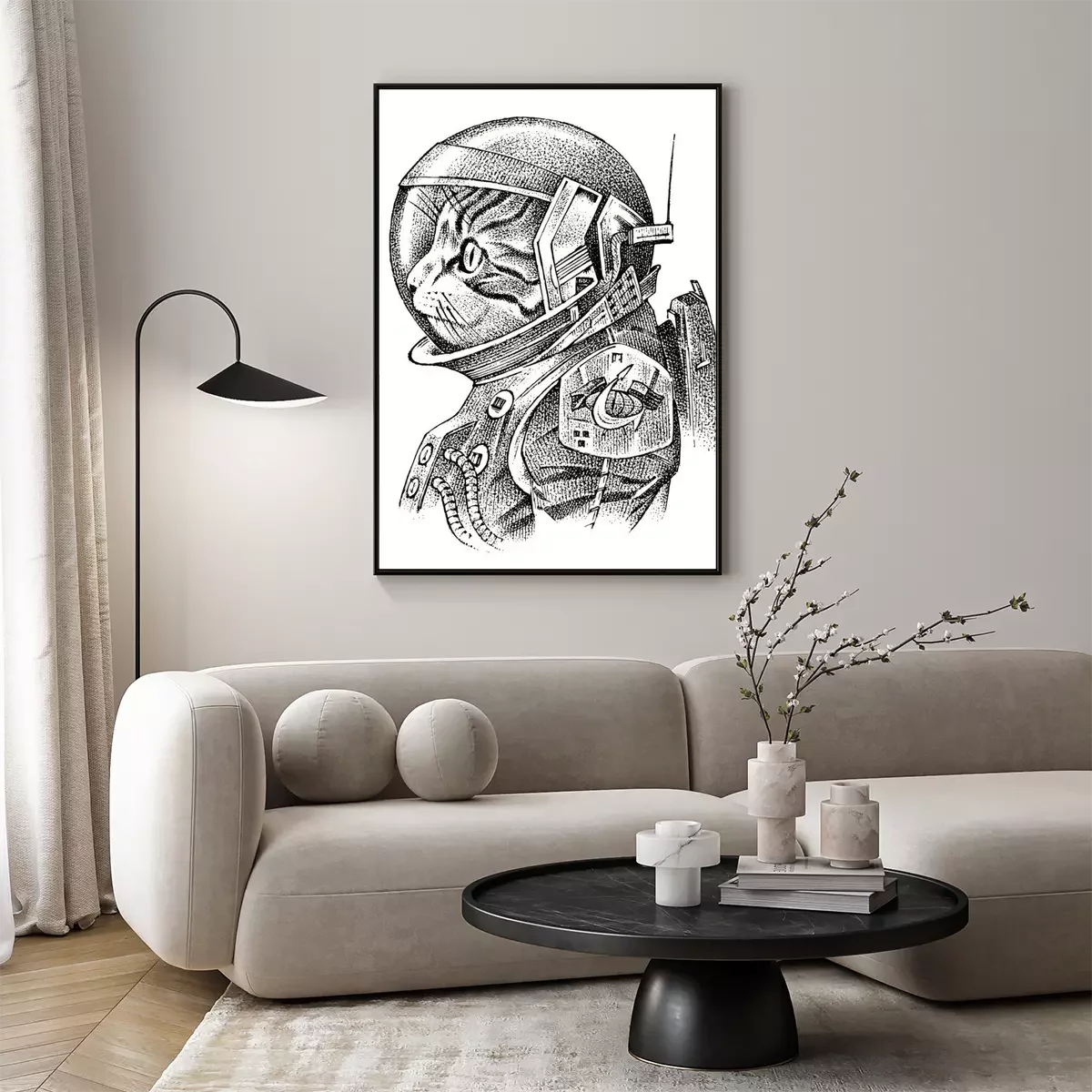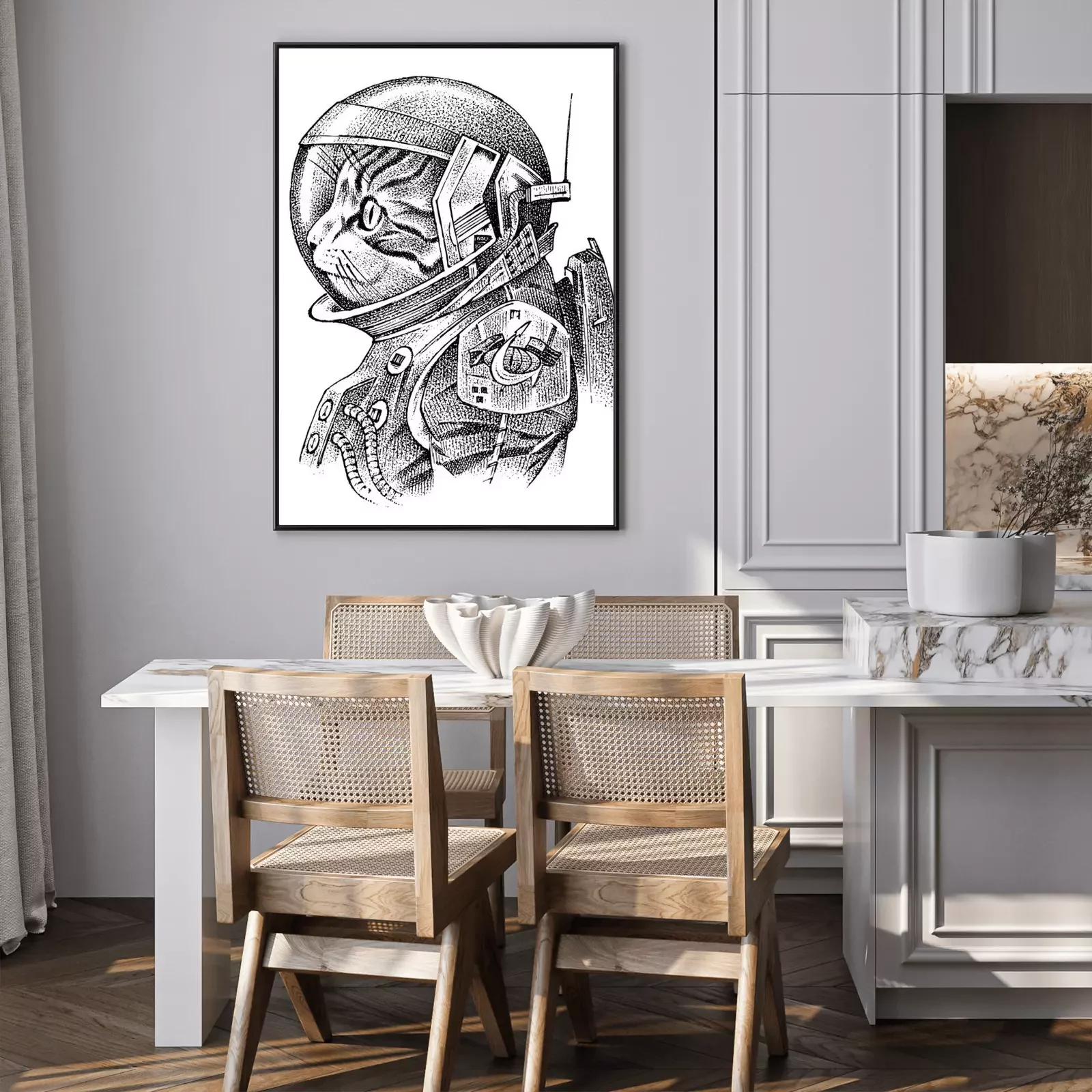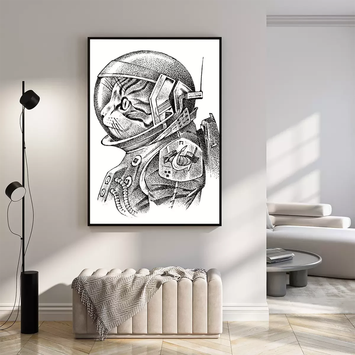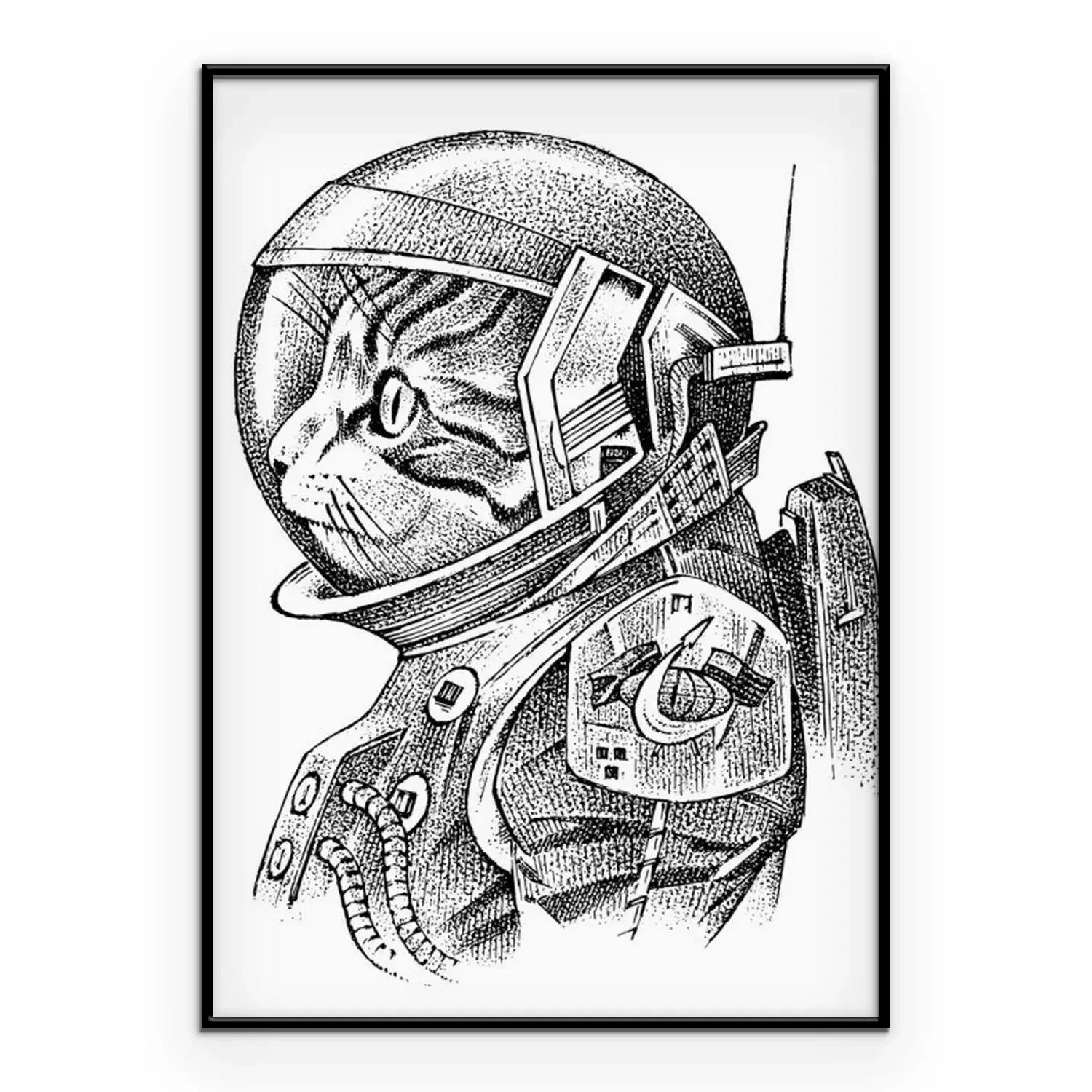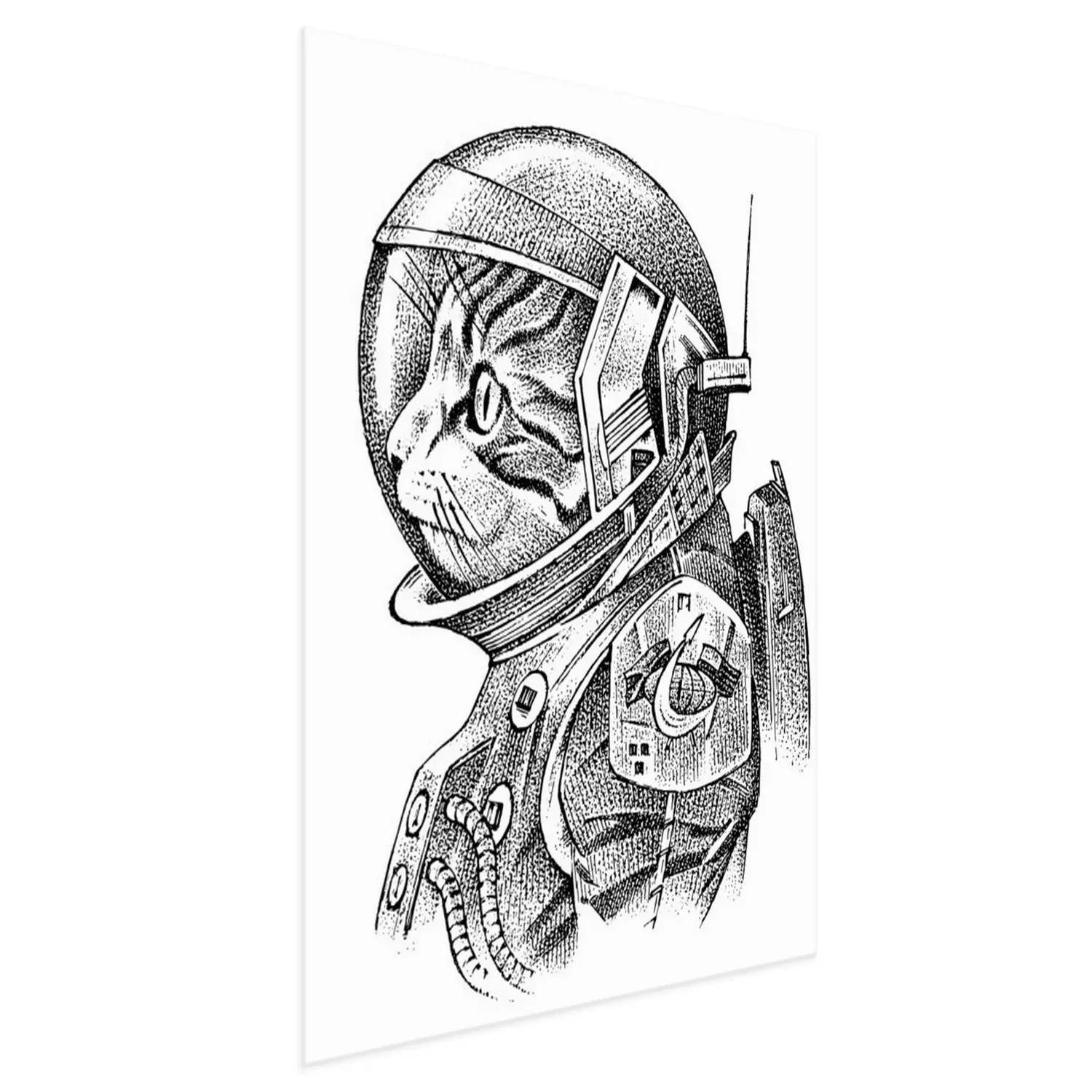 Poster: Schwarz-weiße Katze in einem Kosmonautenanzug