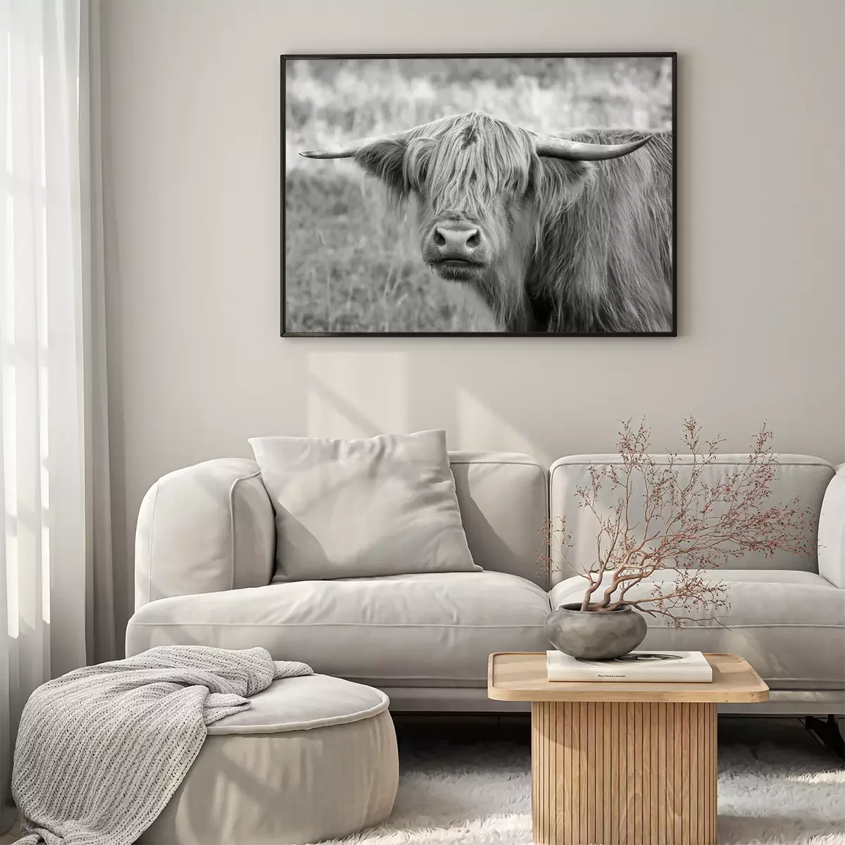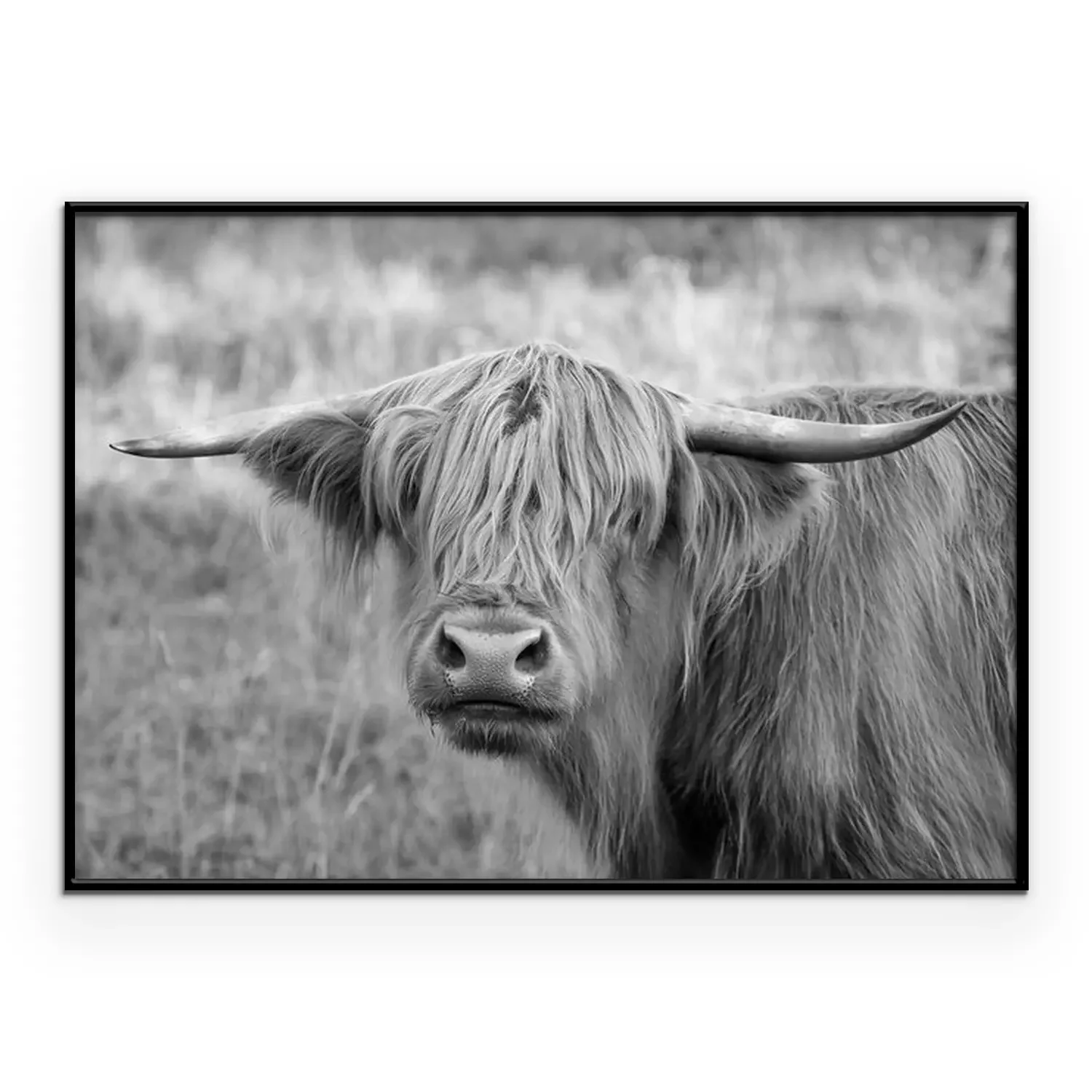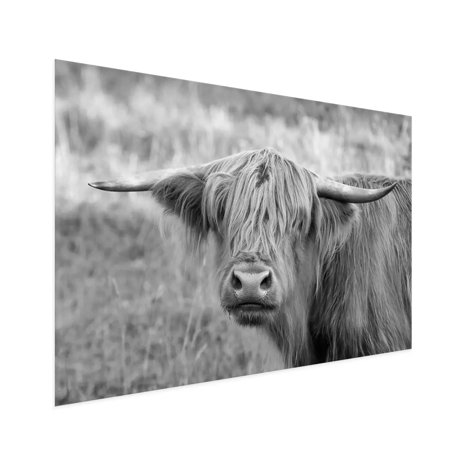 Poster: Schwarz-weiße Kuh mit langem Fell