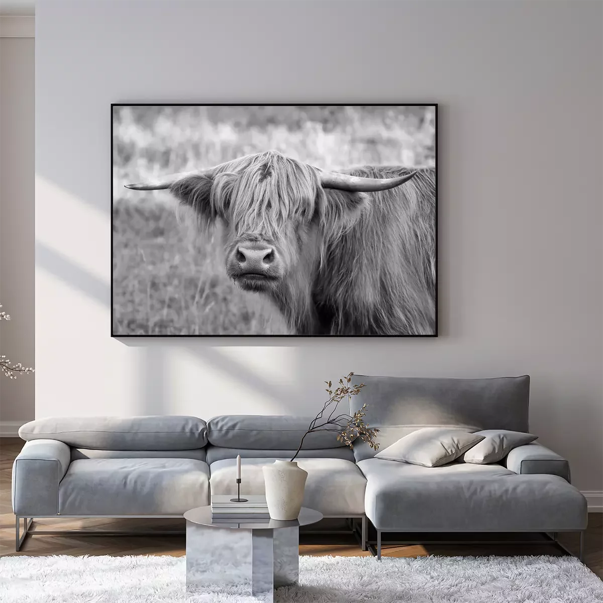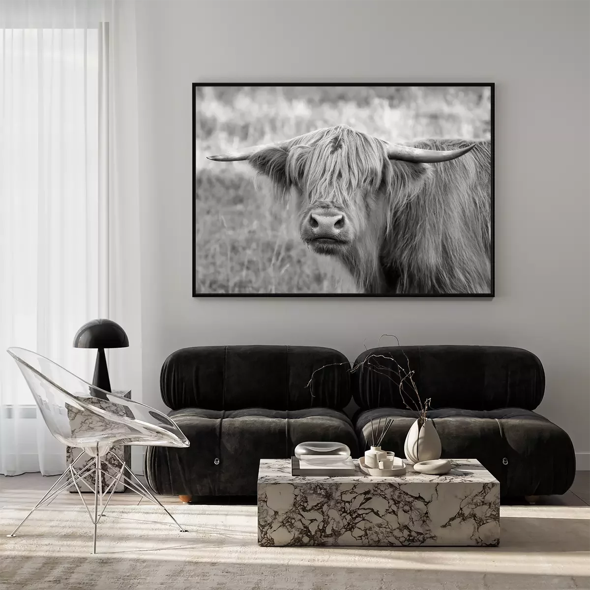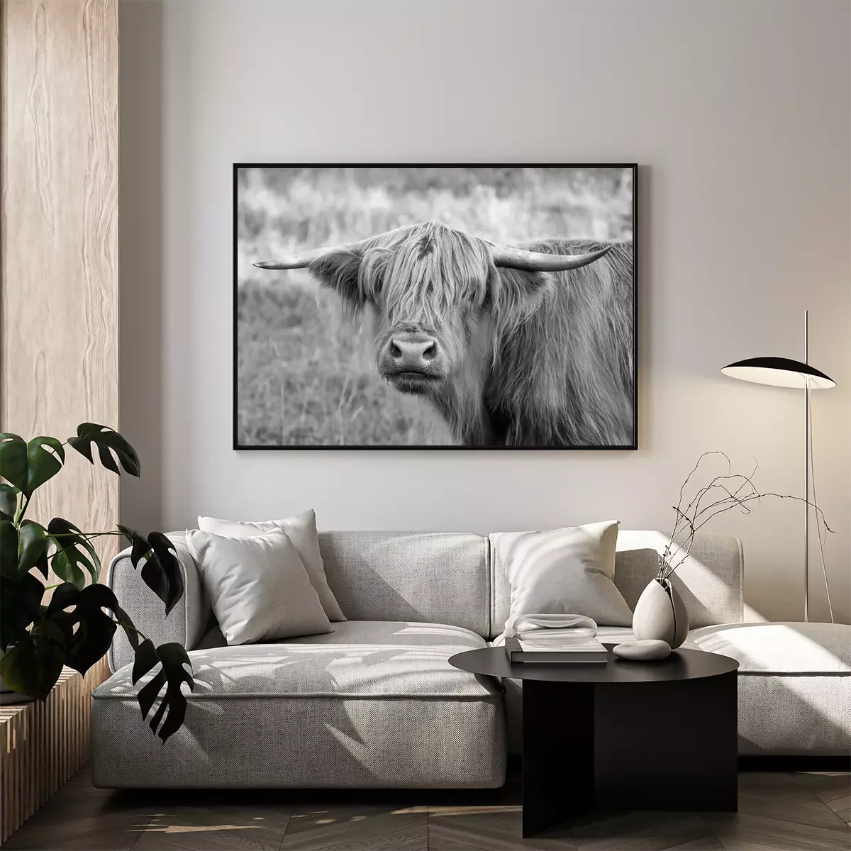 Poster: Schwarz-weiße Kuh mit langem Fell