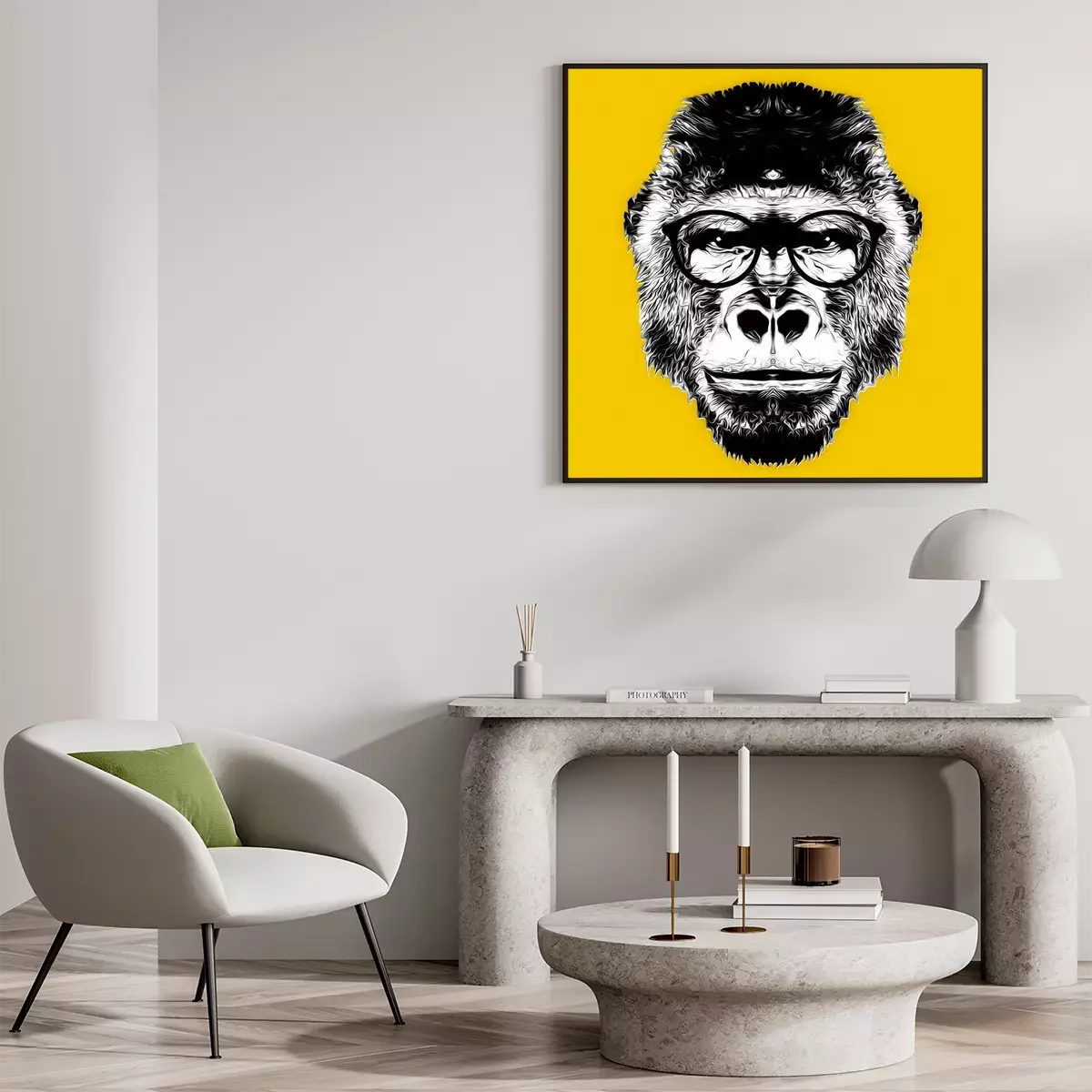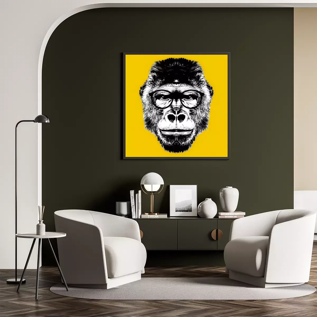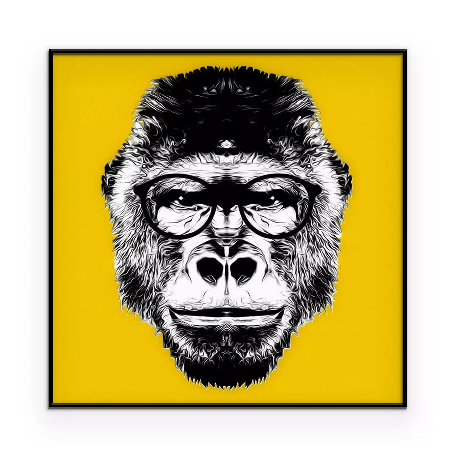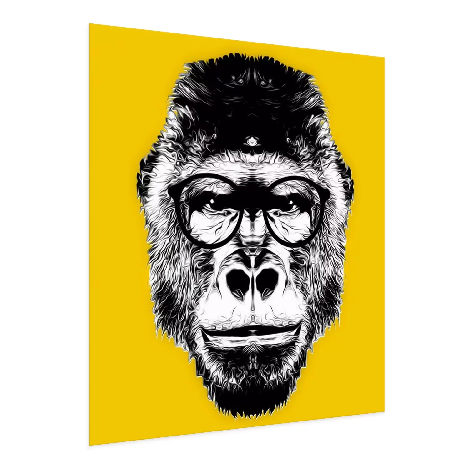 Poster: Schwarz-weißer Affenkopf mit Brille auf gelbem Hintergrund