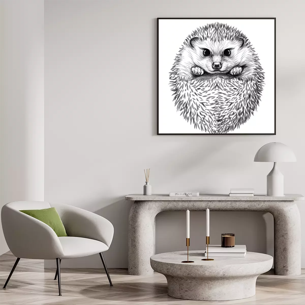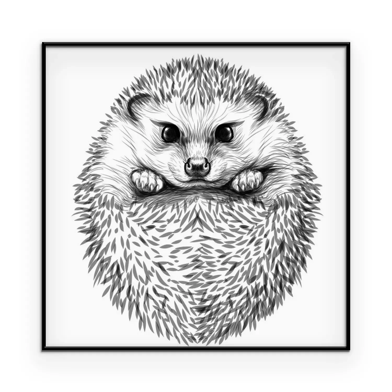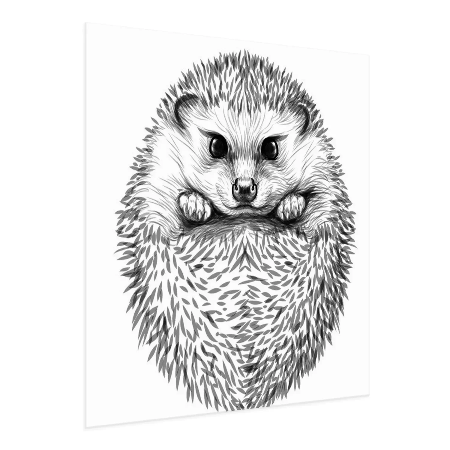Poster: Schwarz-weißer Igel, zusammengerollt in einer Kugel