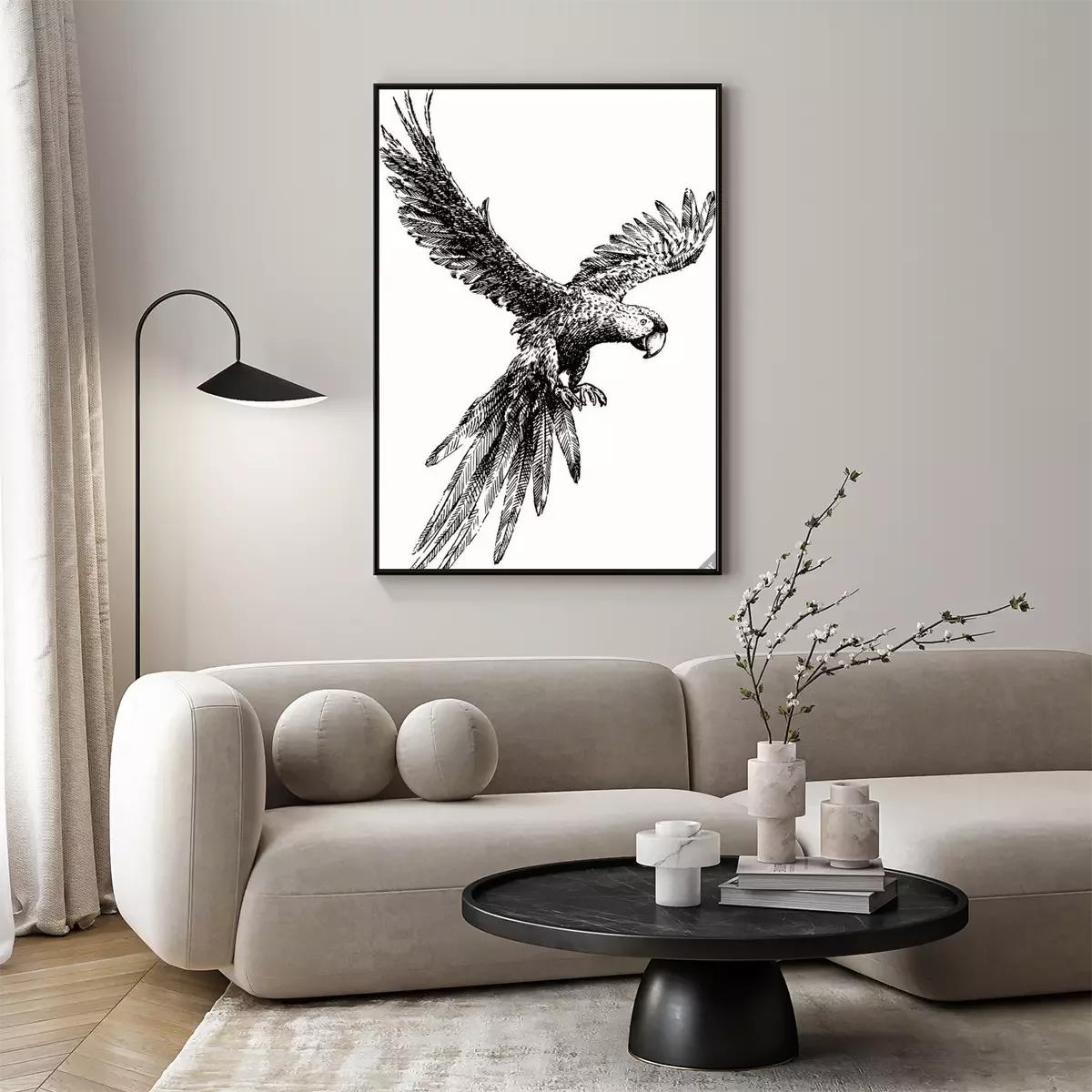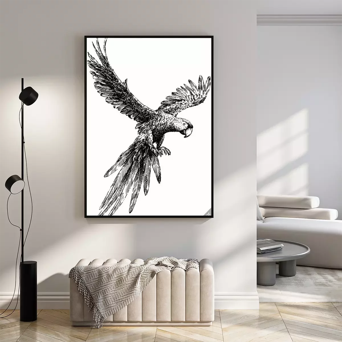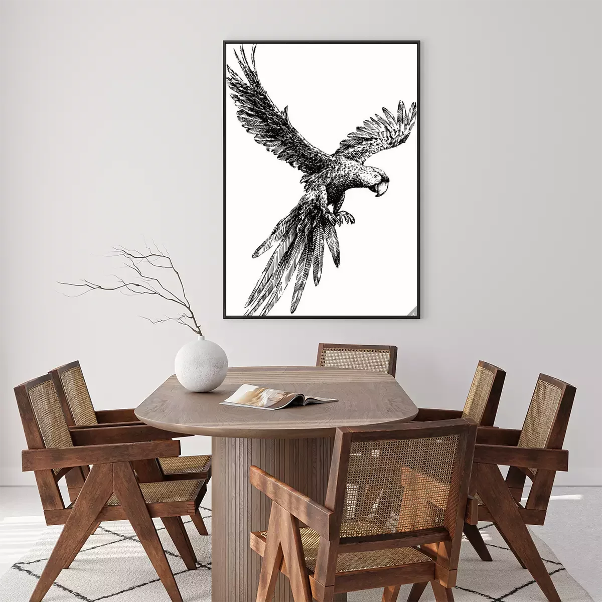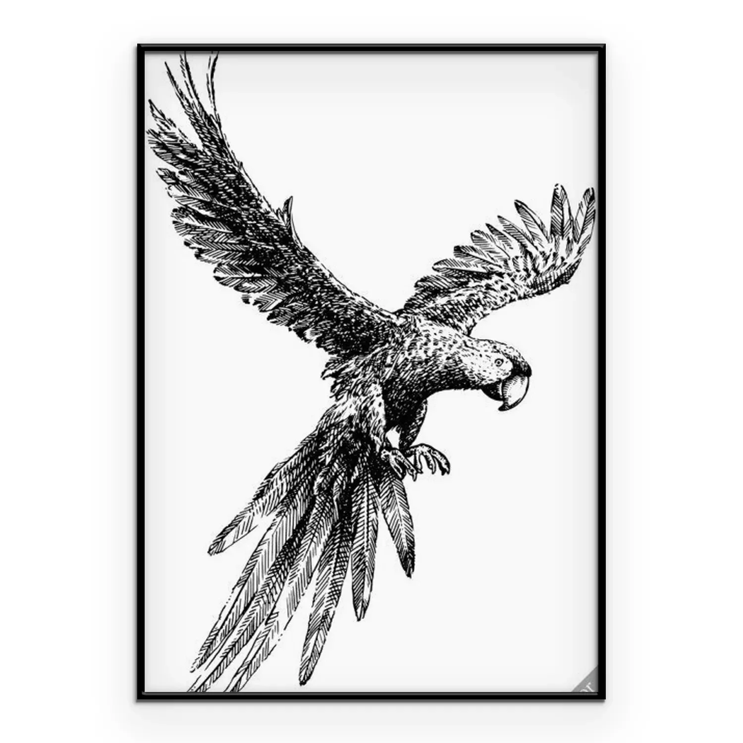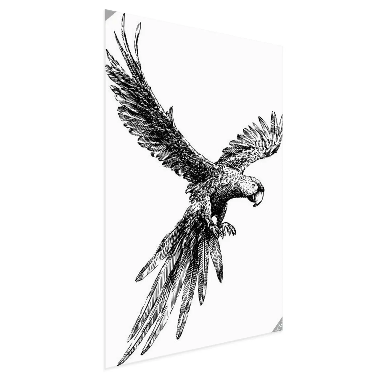 Poster: Schwarz-weißer Papagei im Flug