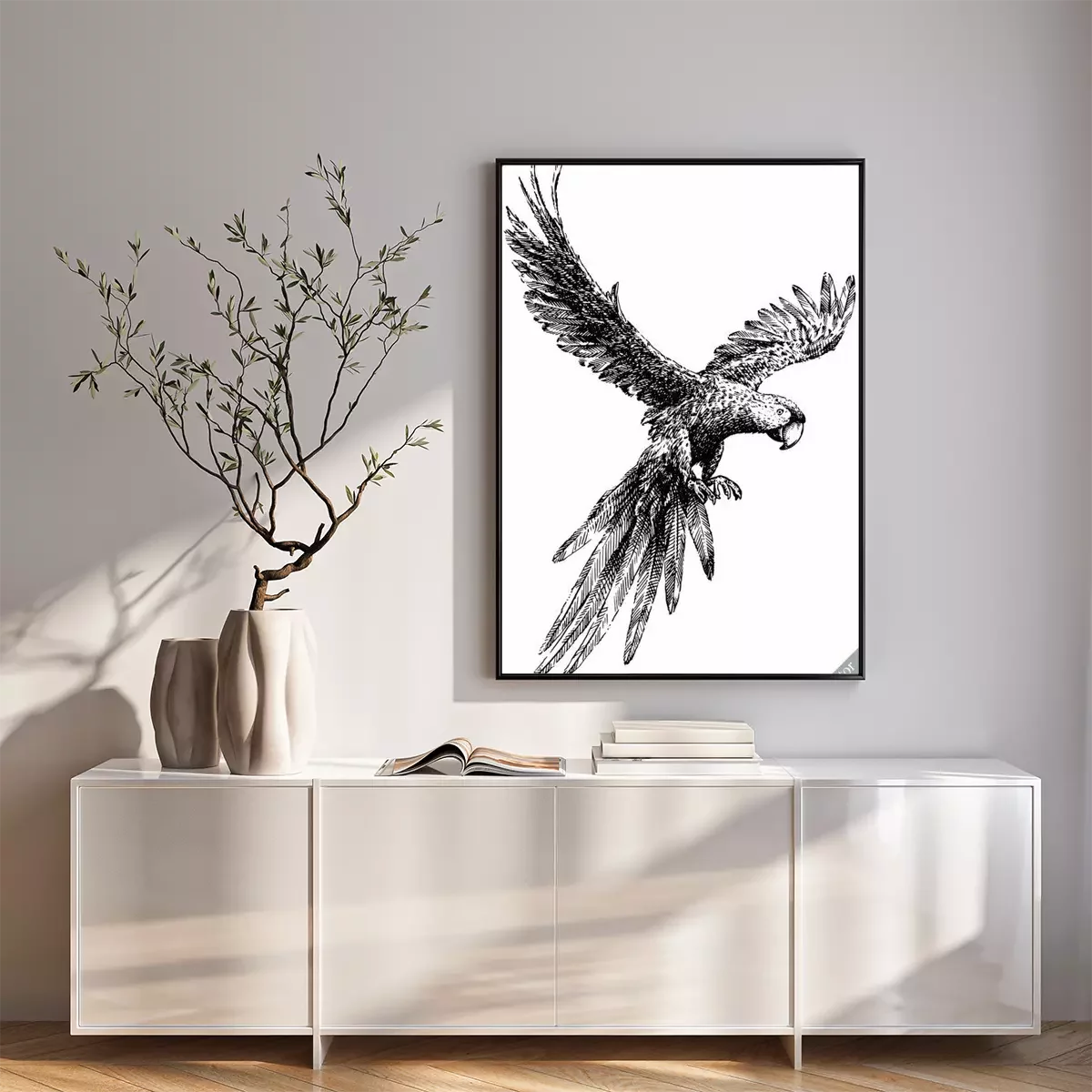 Poster Schwarz-weißer Papagei im Flug