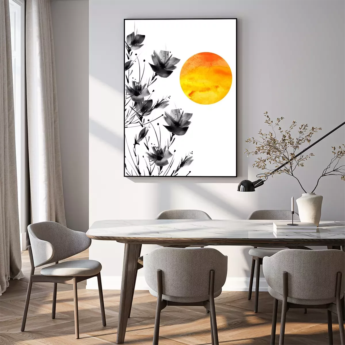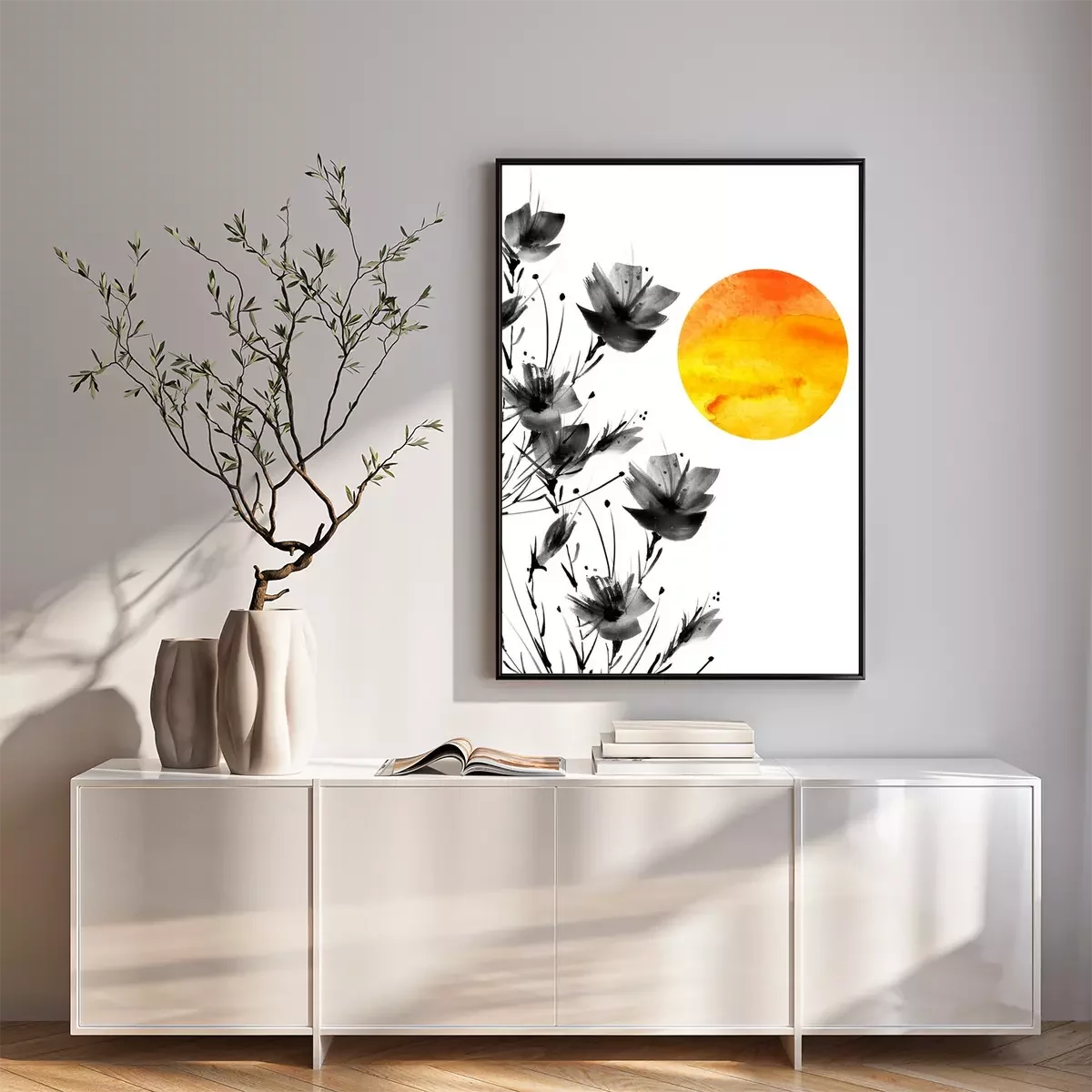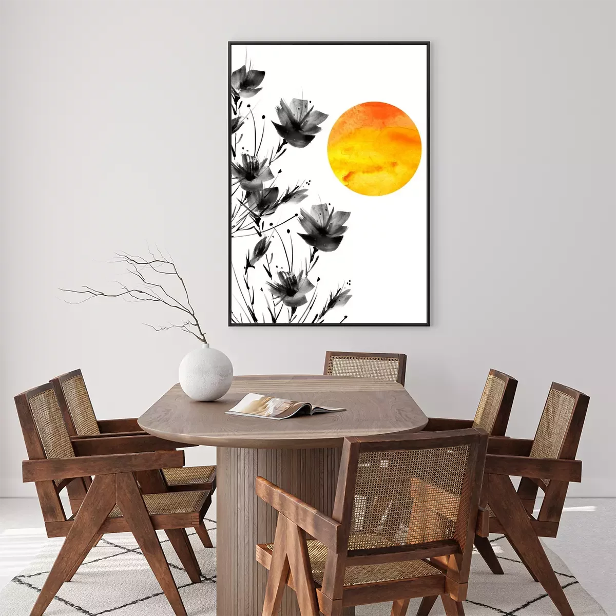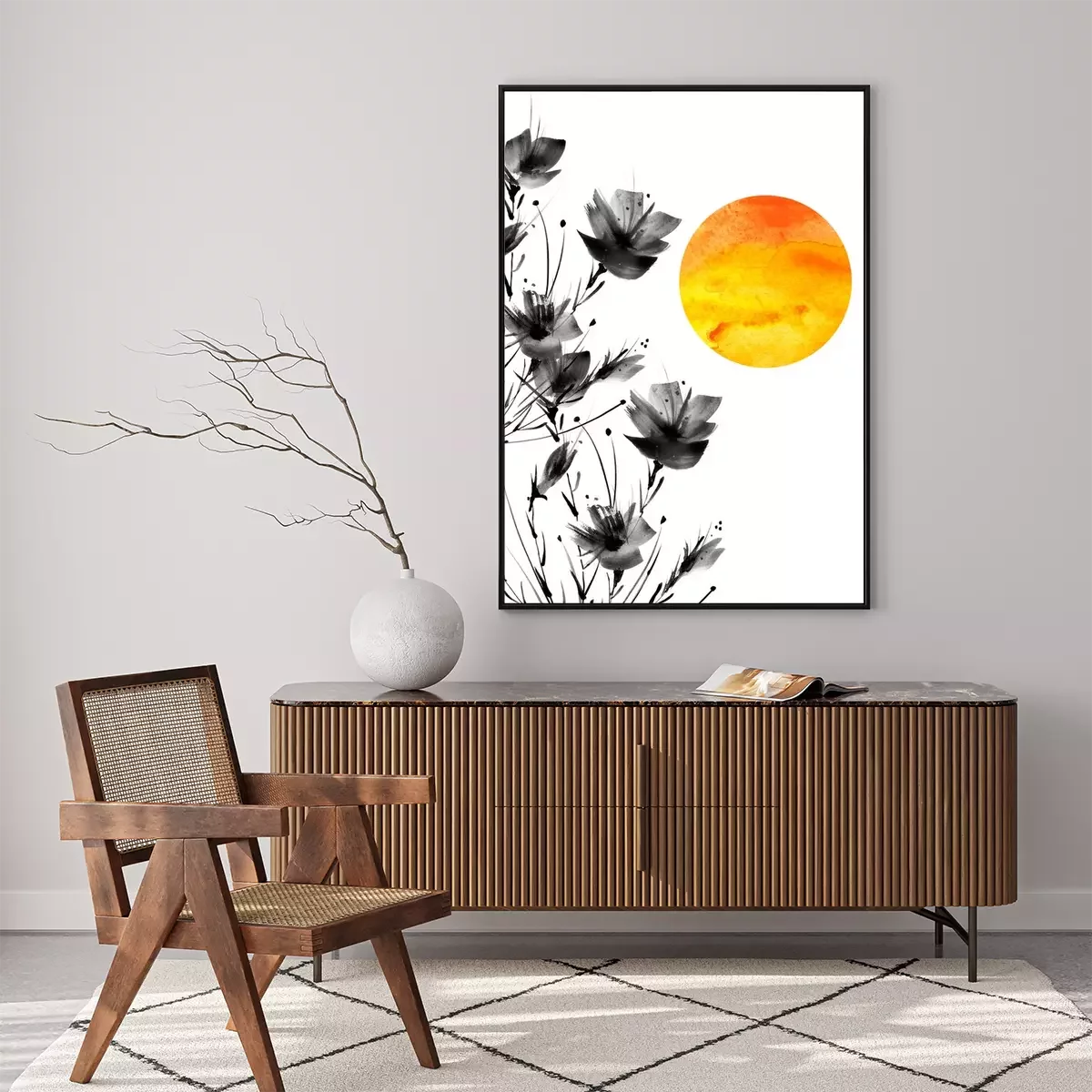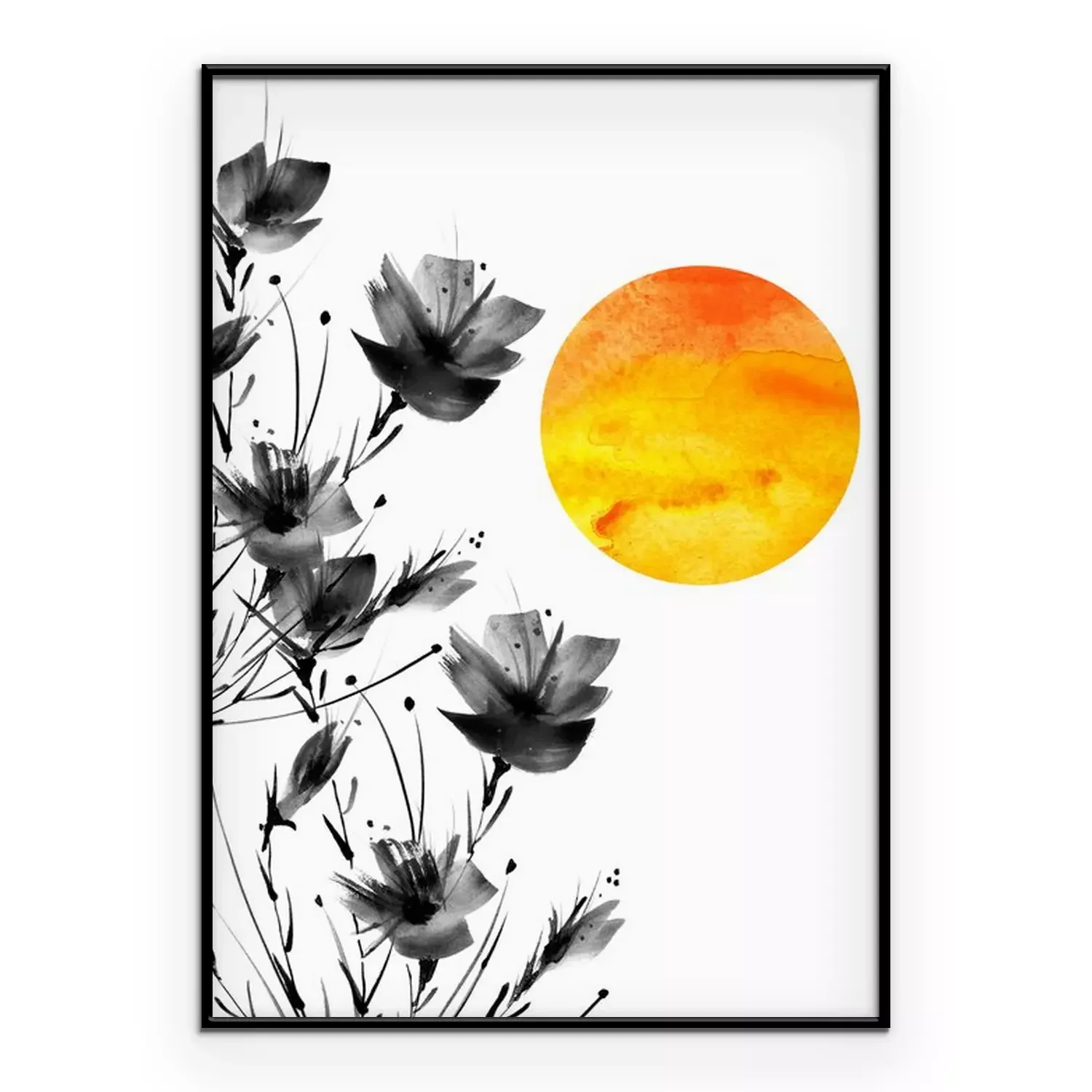 Poster: Schwarze Mohnblumen und orange-gelbe Sonne