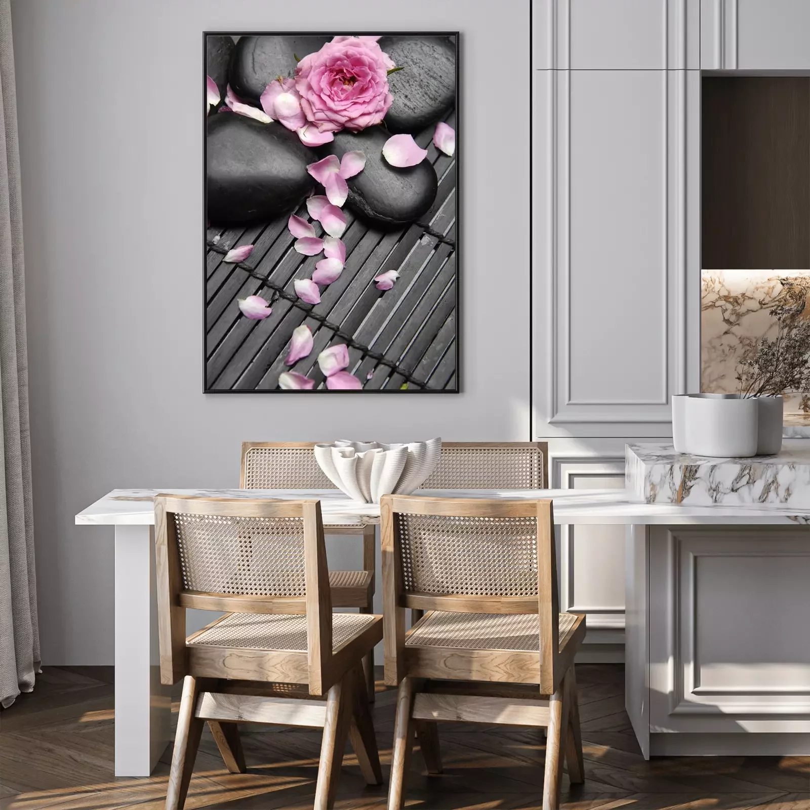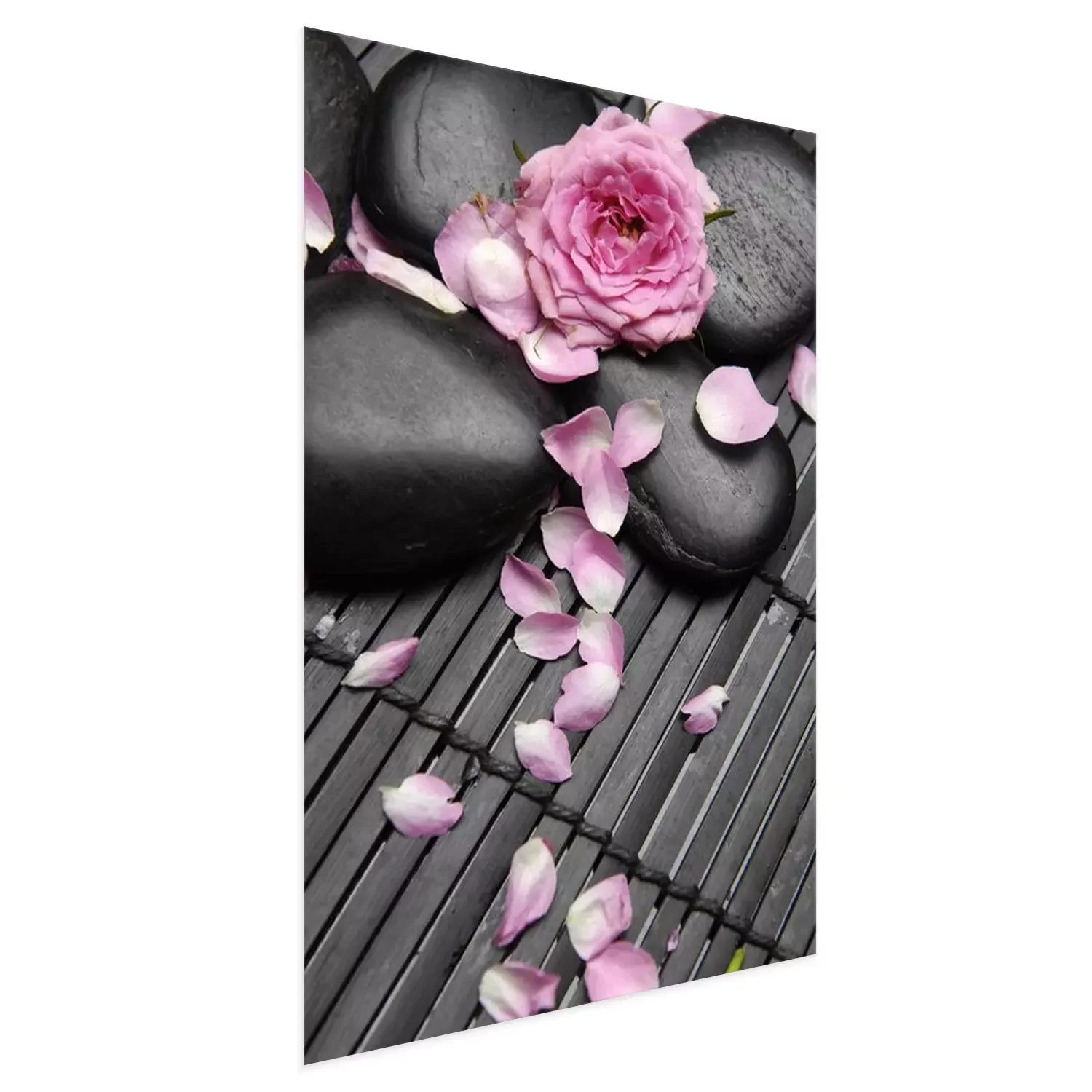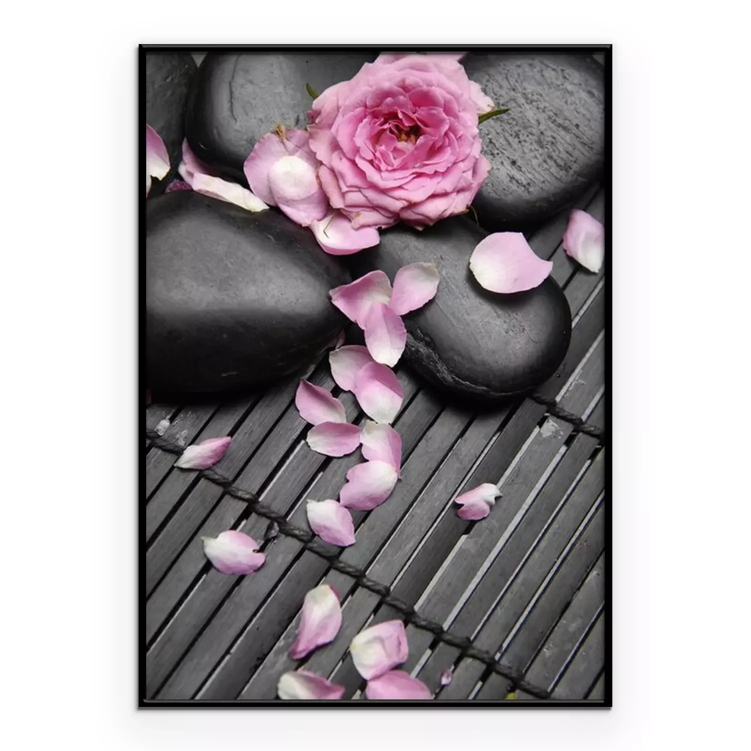 Poster: Schwarze Steine, bestreut mit Blütenblättern