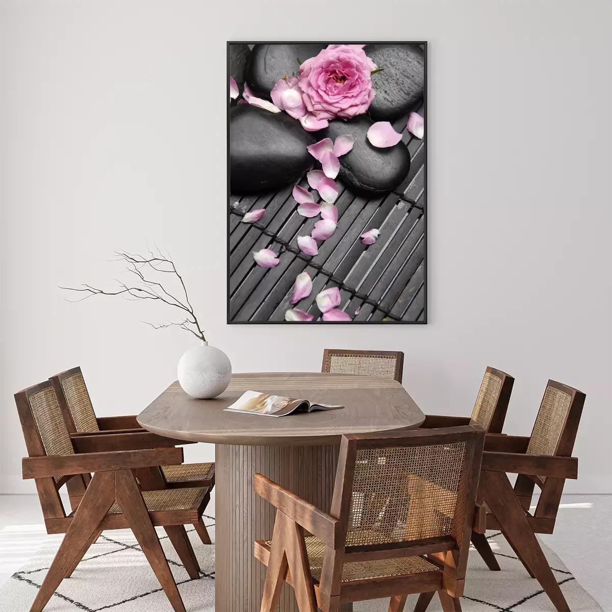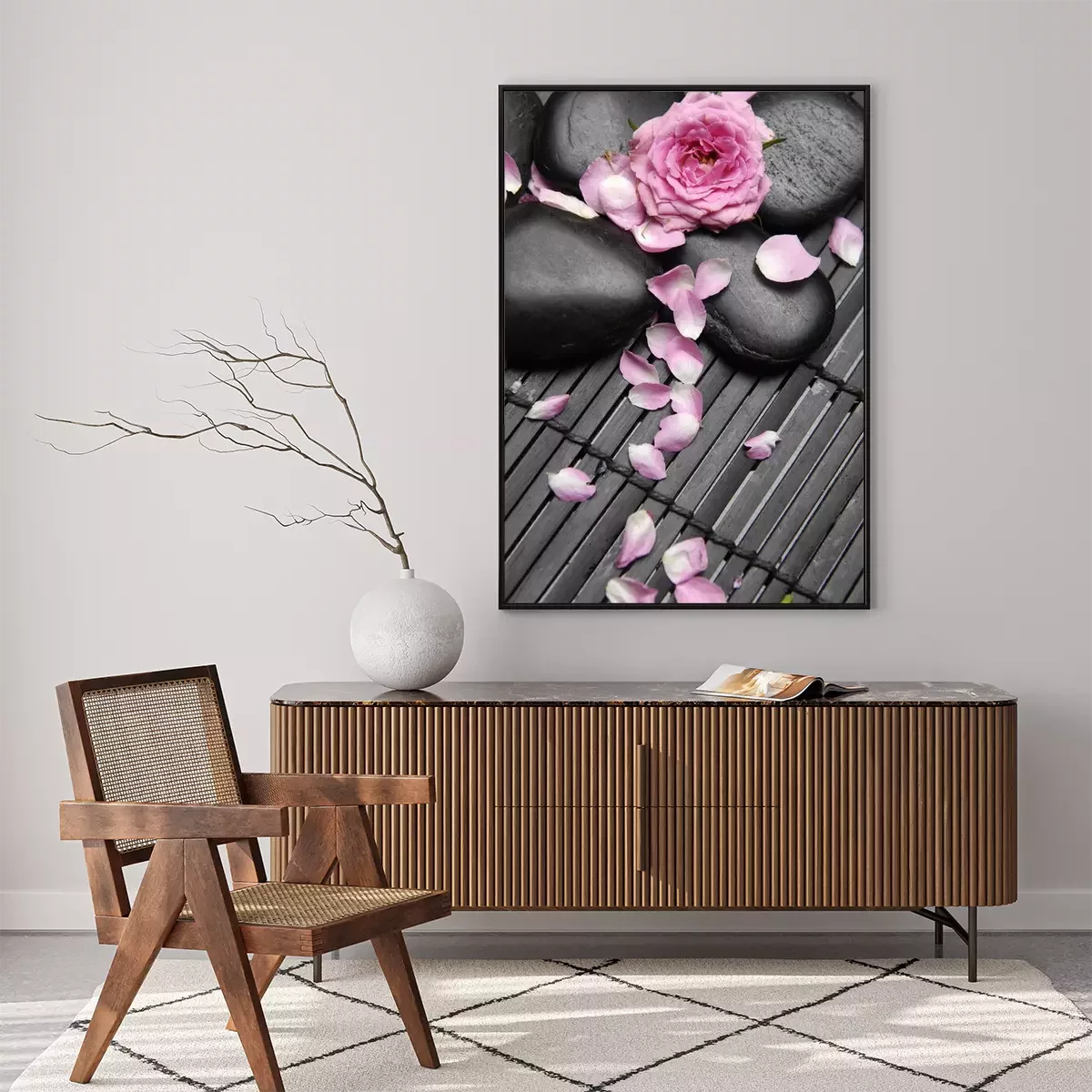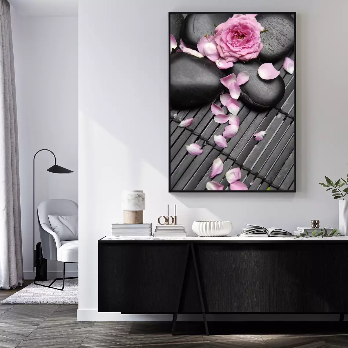 Poster: Schwarze Steine, bestreut mit Blütenblättern