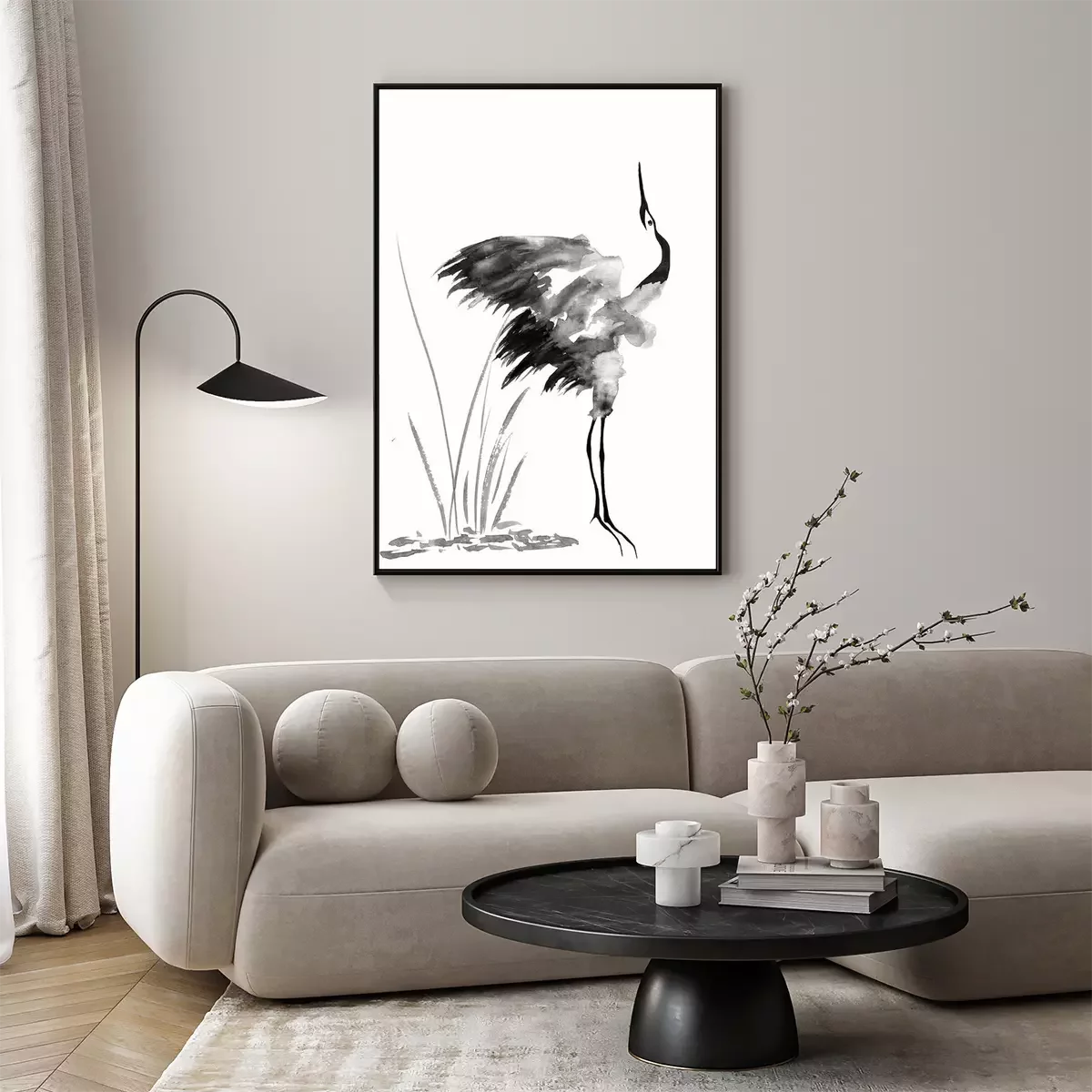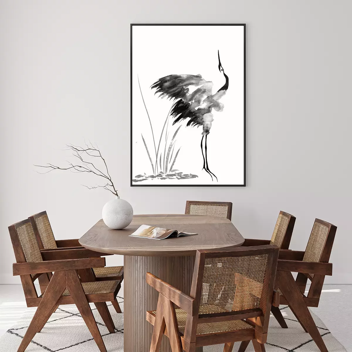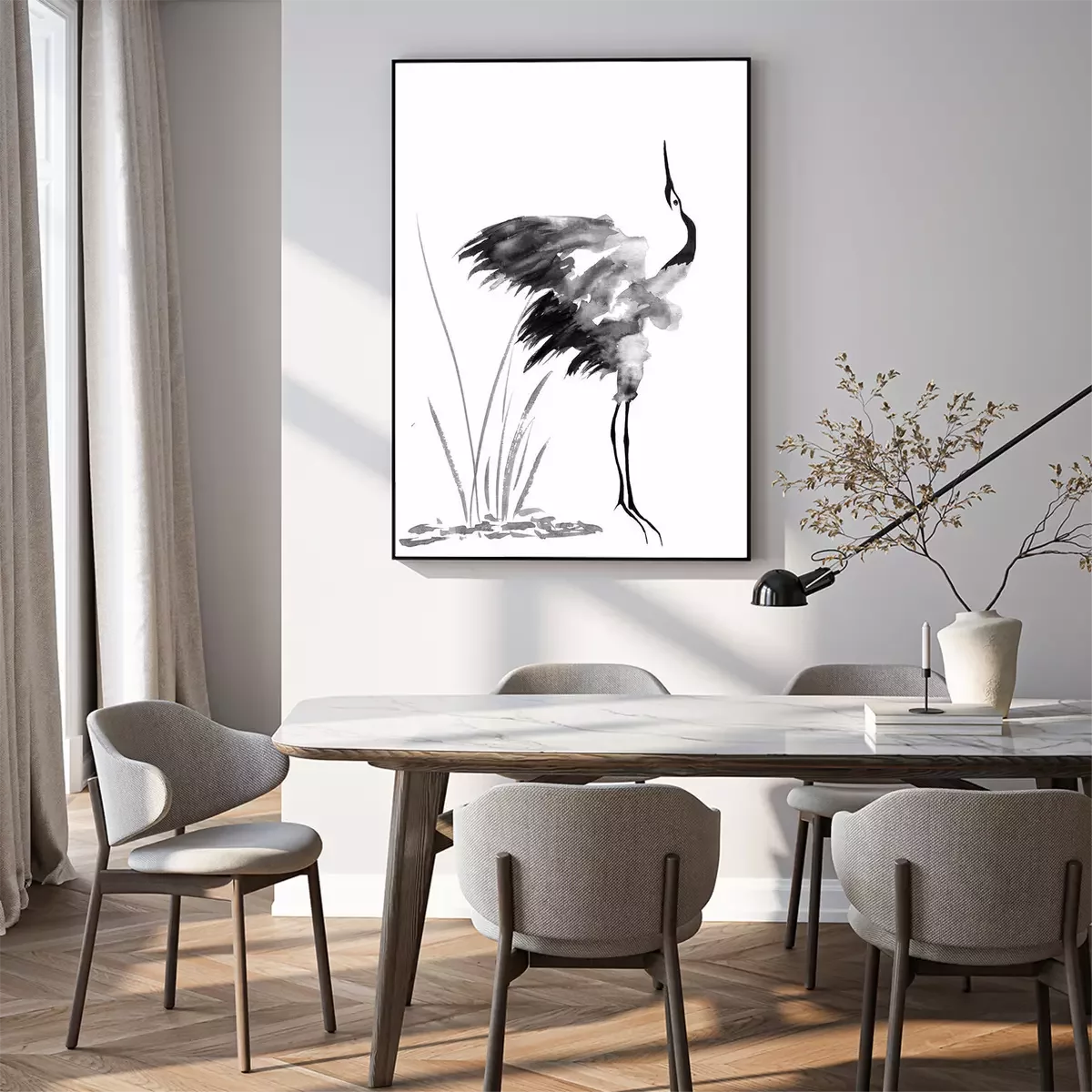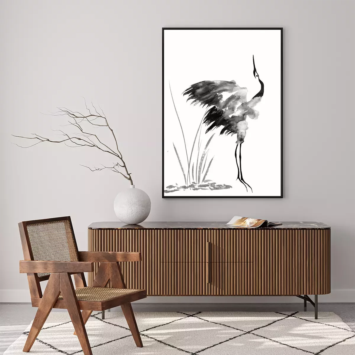 Poster Schwarze Tuschezeichnung mit einem Kranich