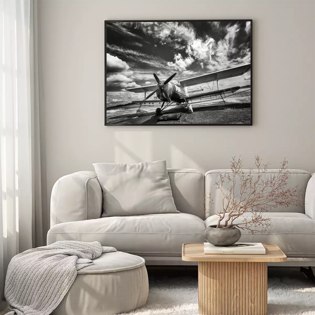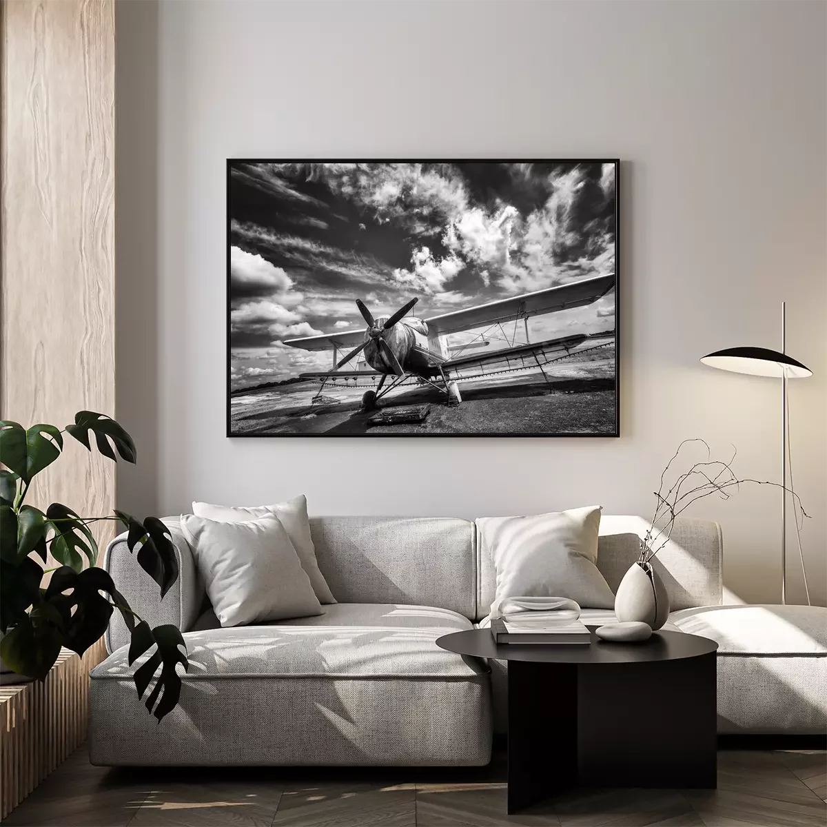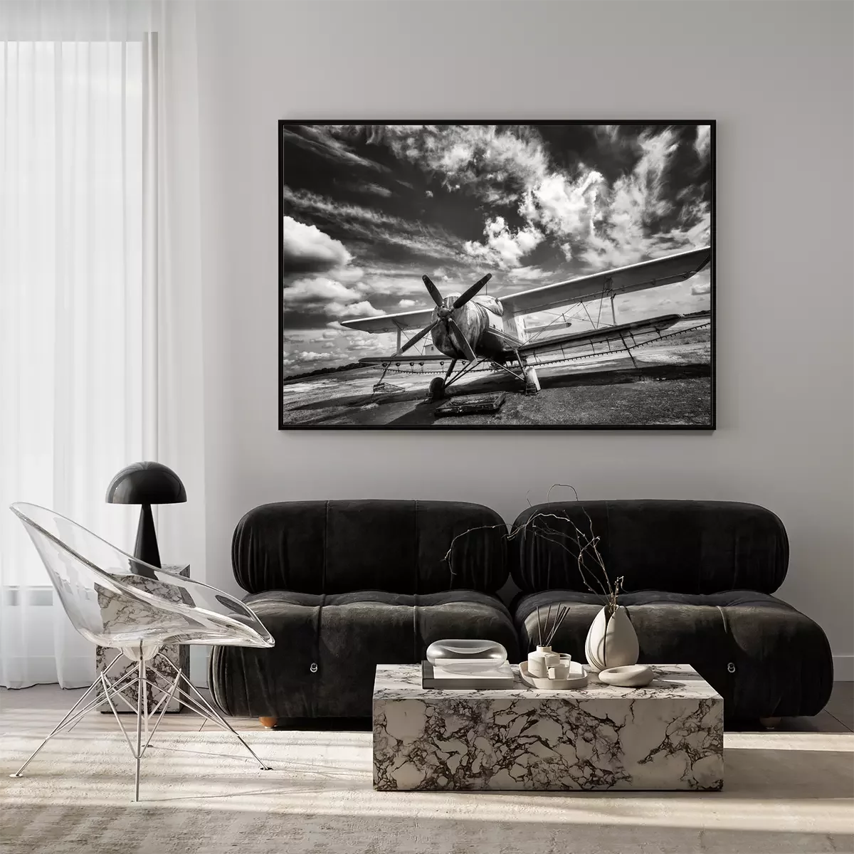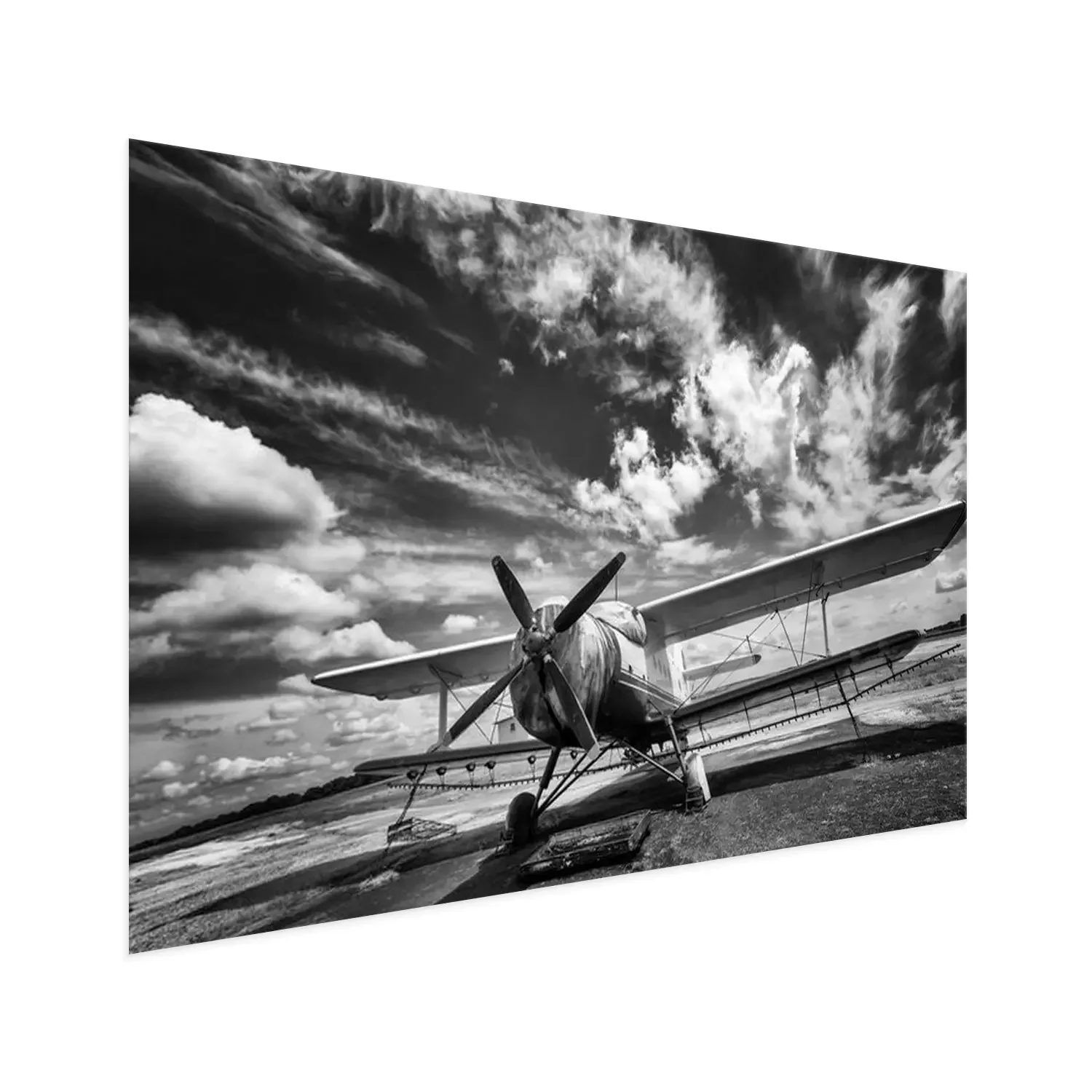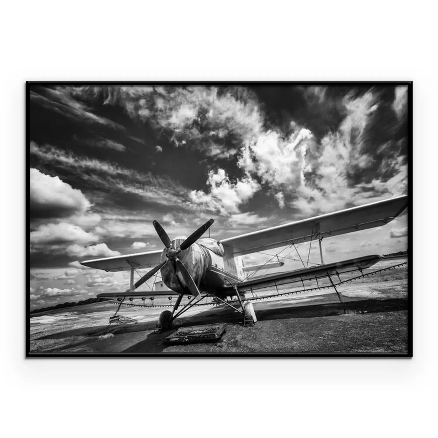 Altes Flugzeug auf einem Feld in Schwarzweiß
