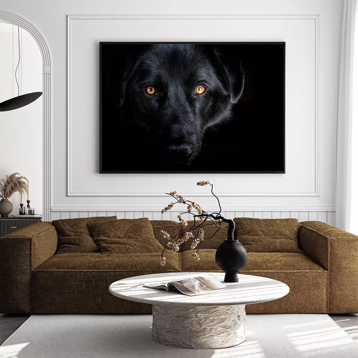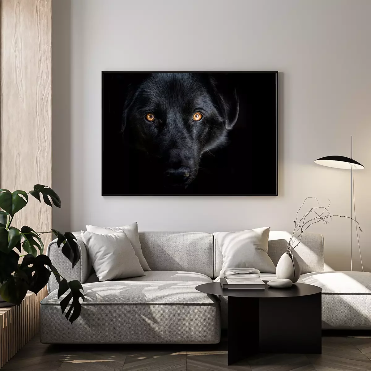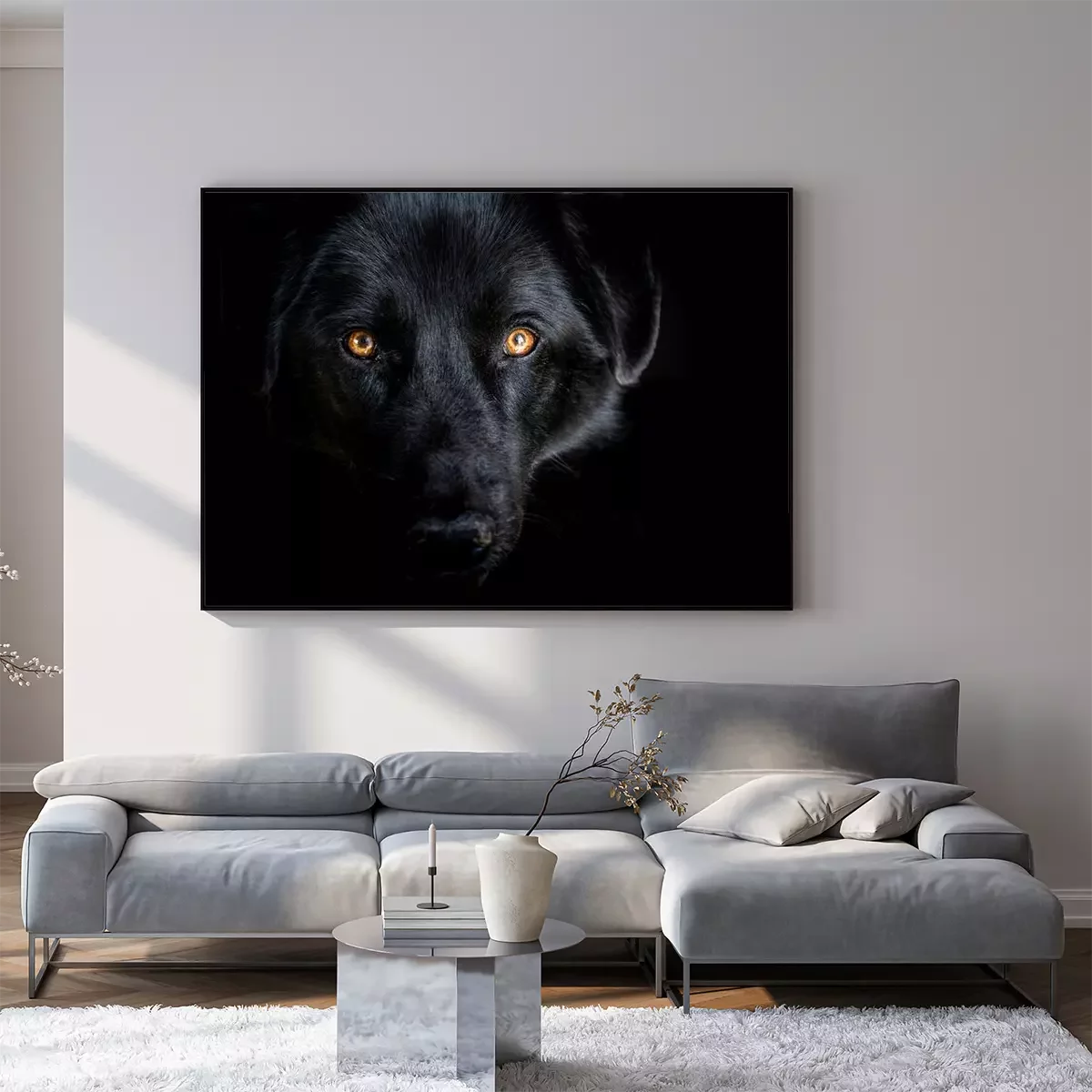 Poster: Schwarzer Wolf auf dunklem Hintergrund