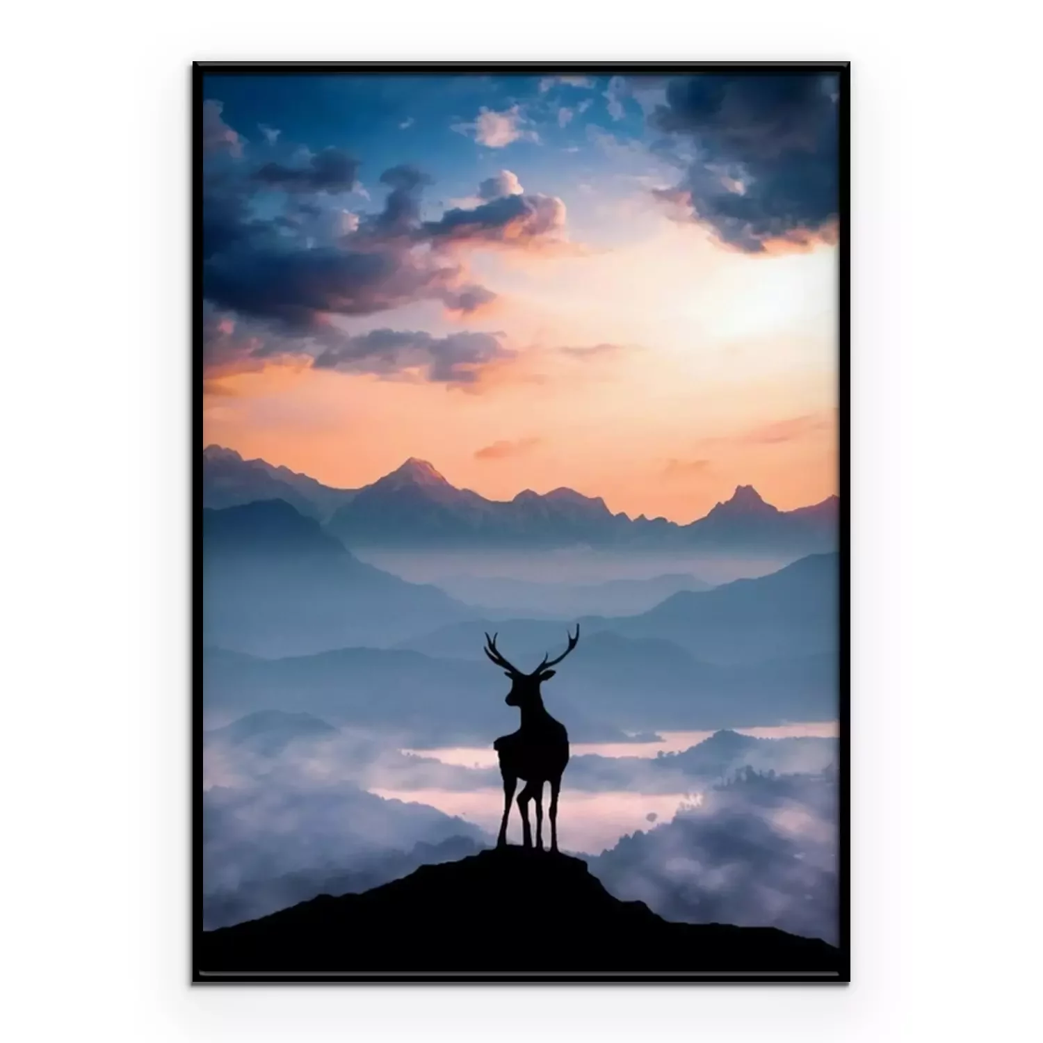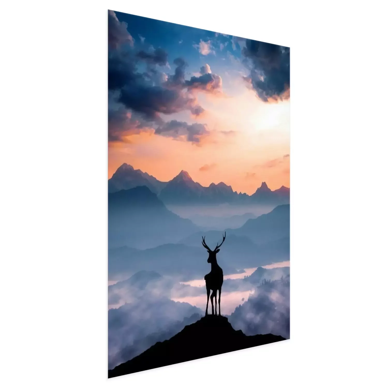 Poster: Silhouette eines Hirsches auf einem Berggipfel bei Sonnenuntergang