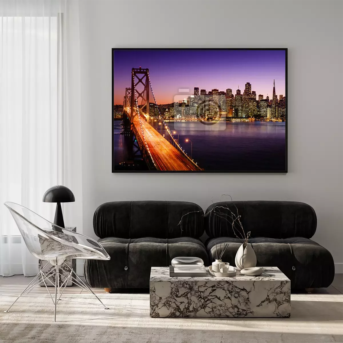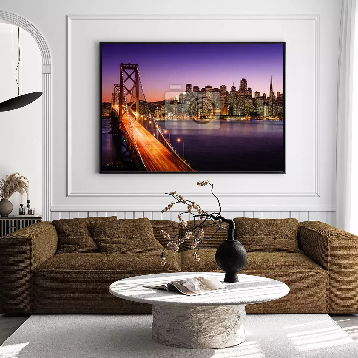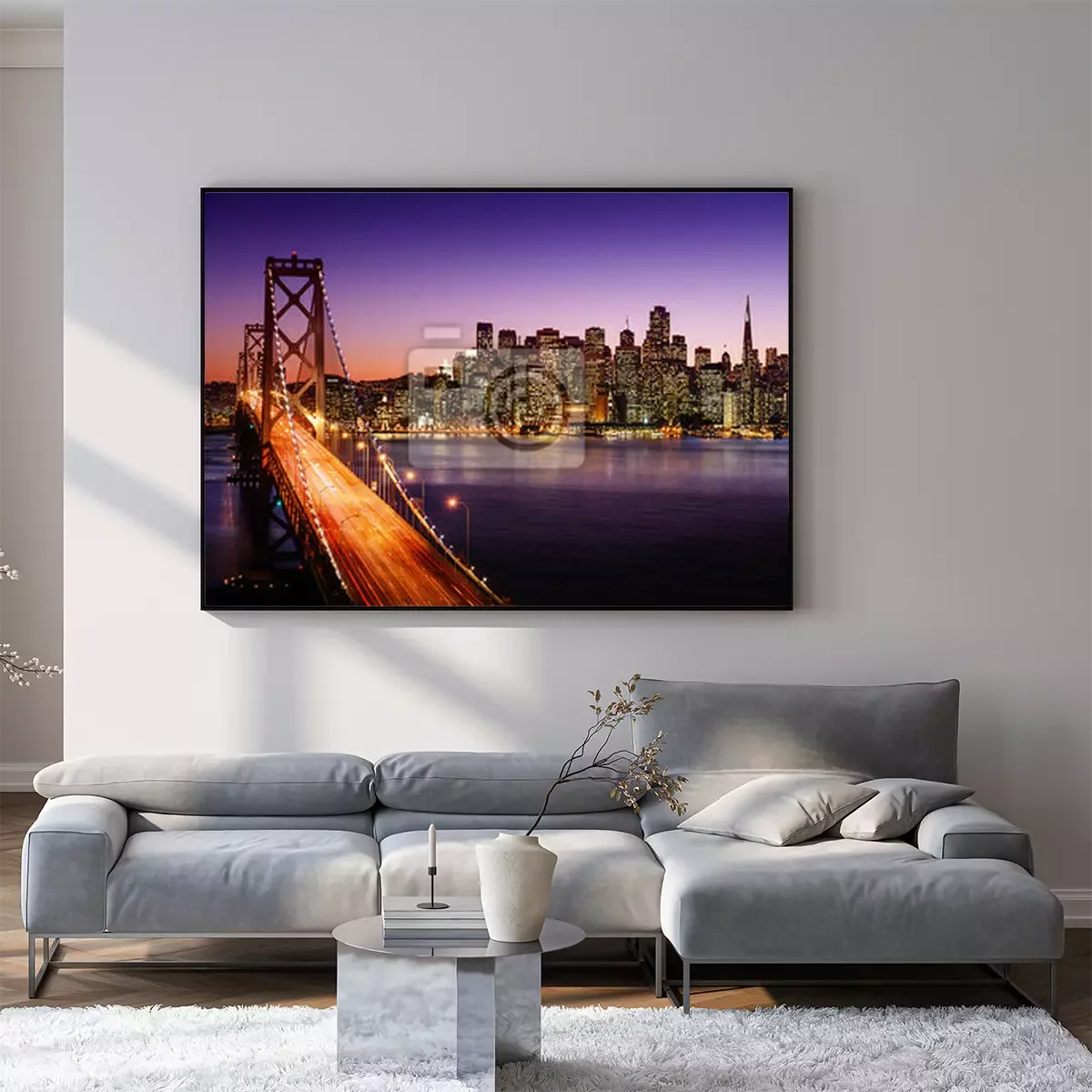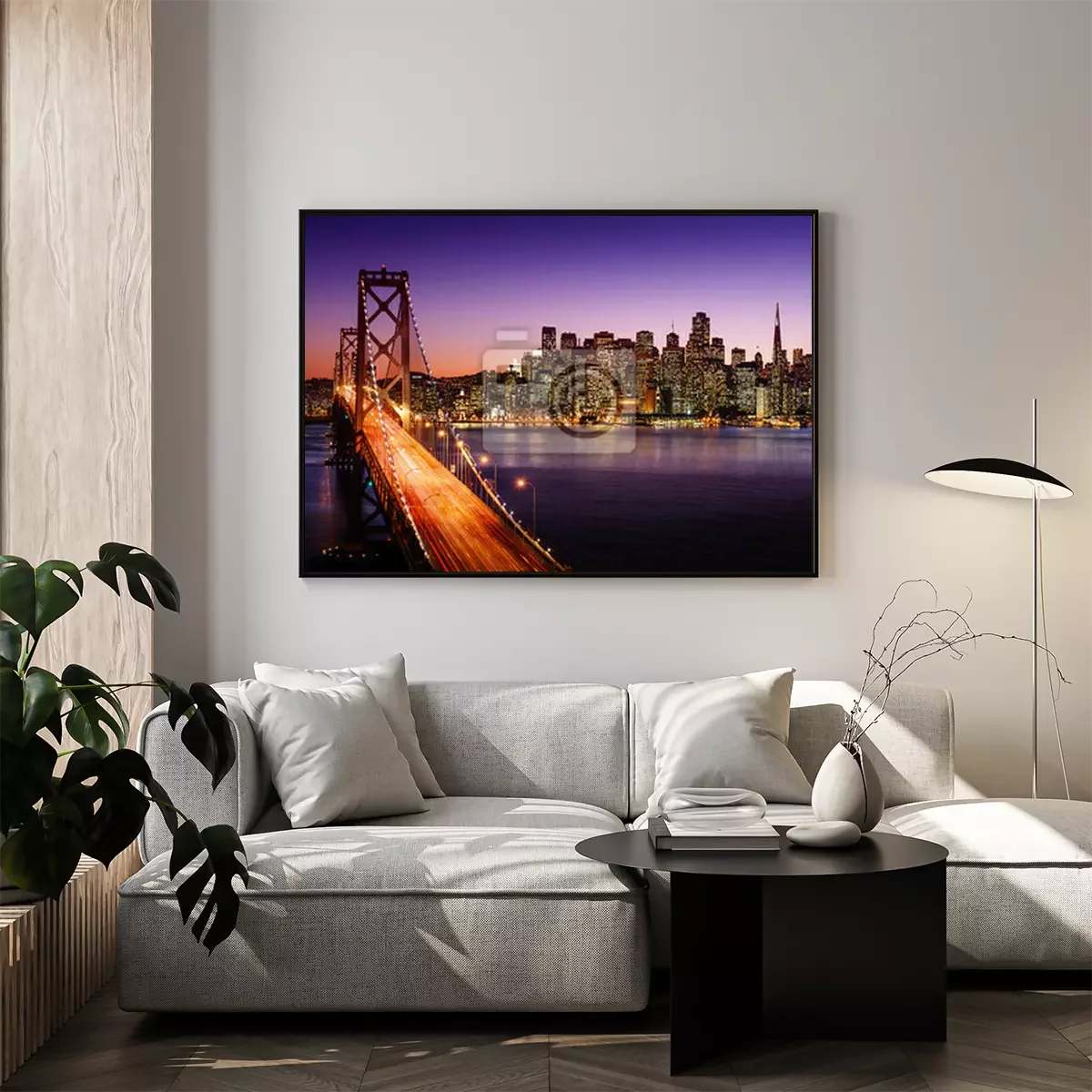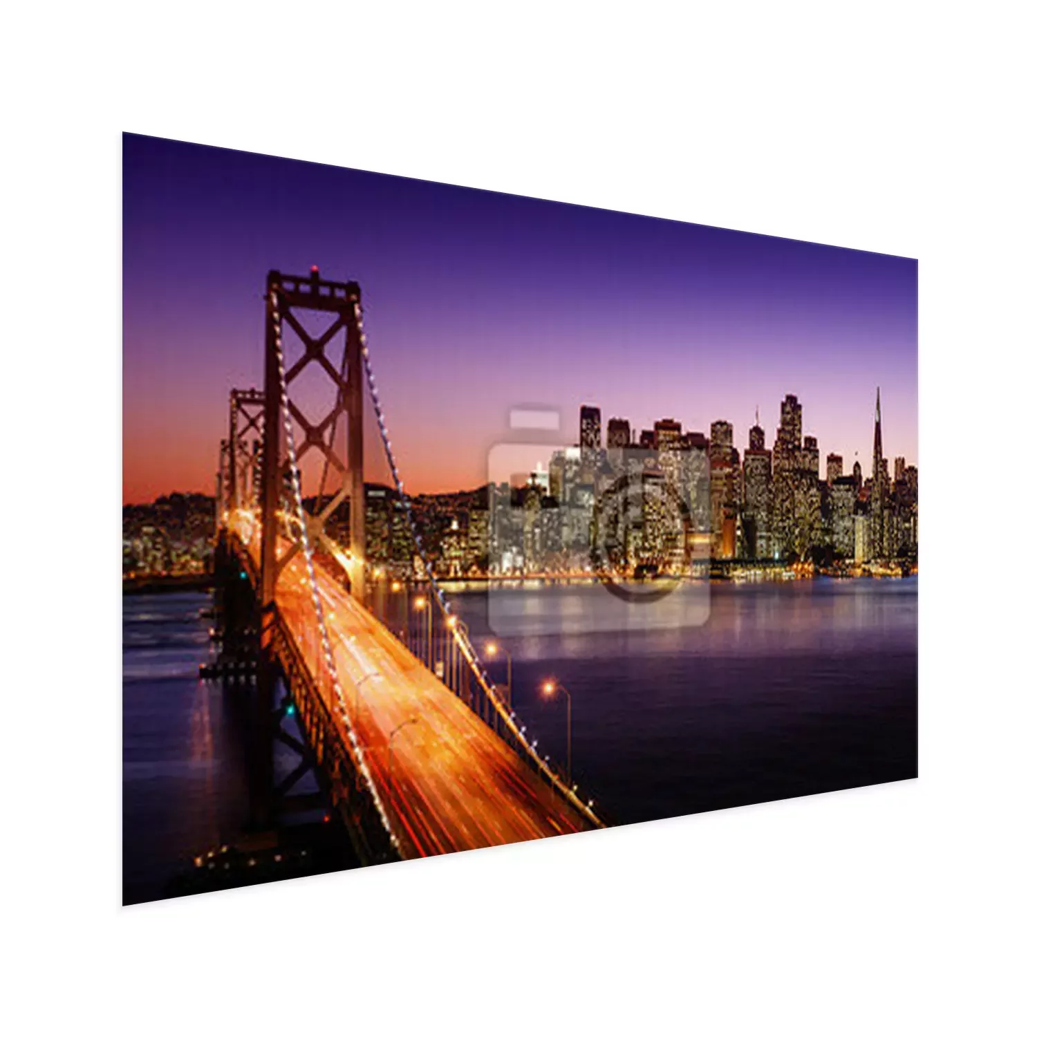 Poster Skyline von San Francisco und Bay Bridge bei Sonnenuntergang, California