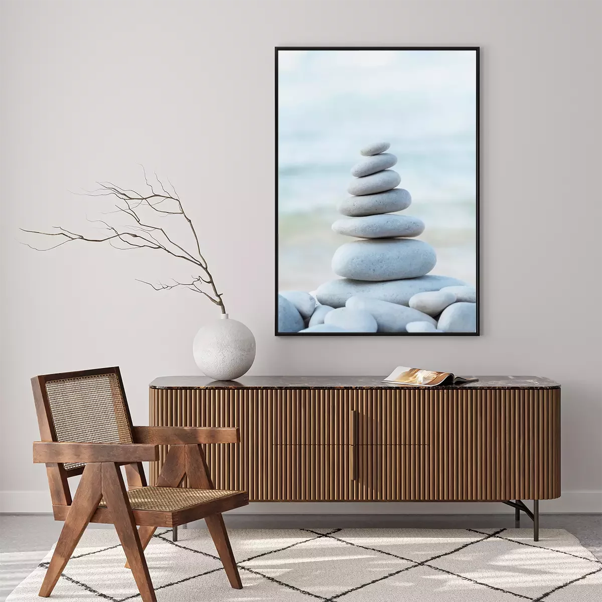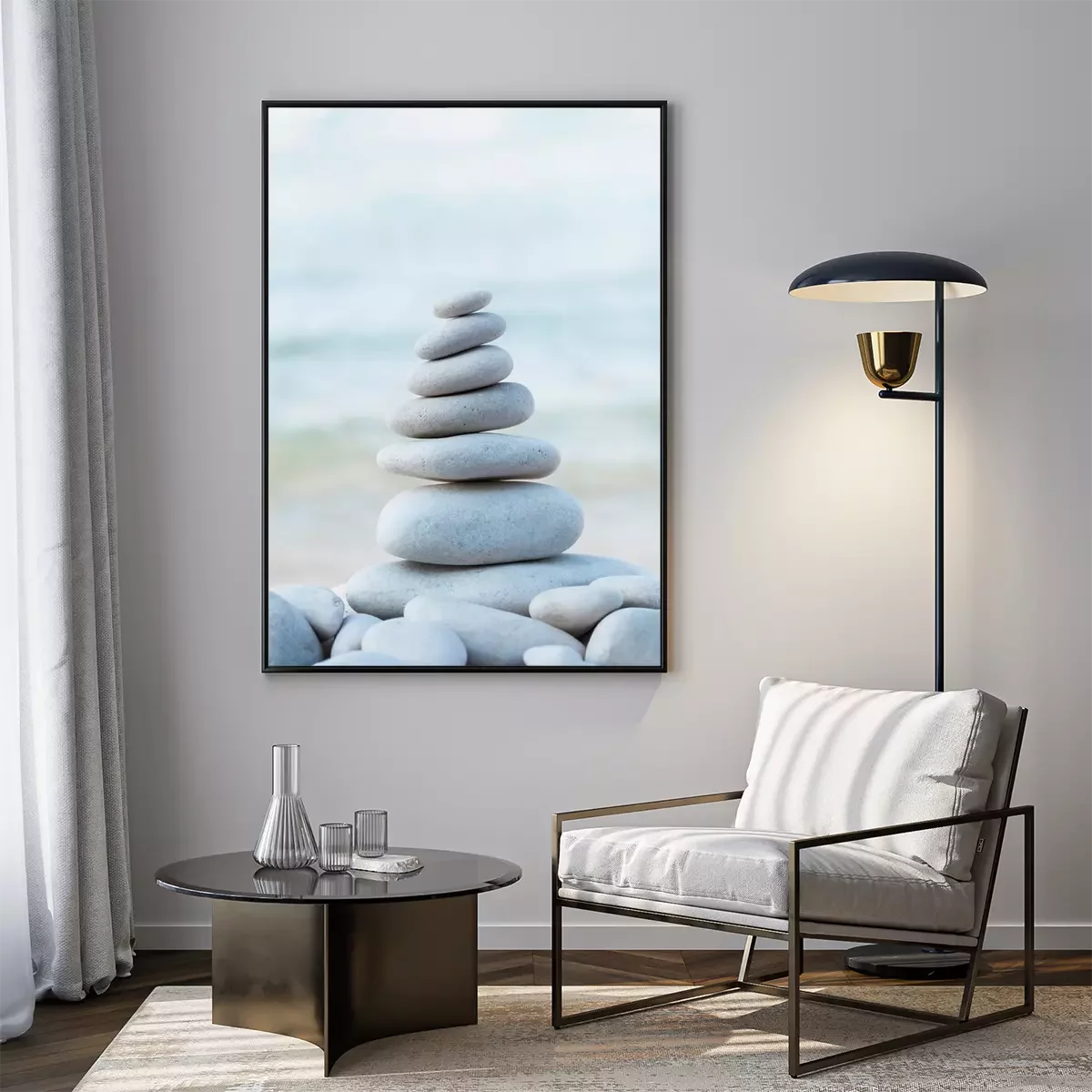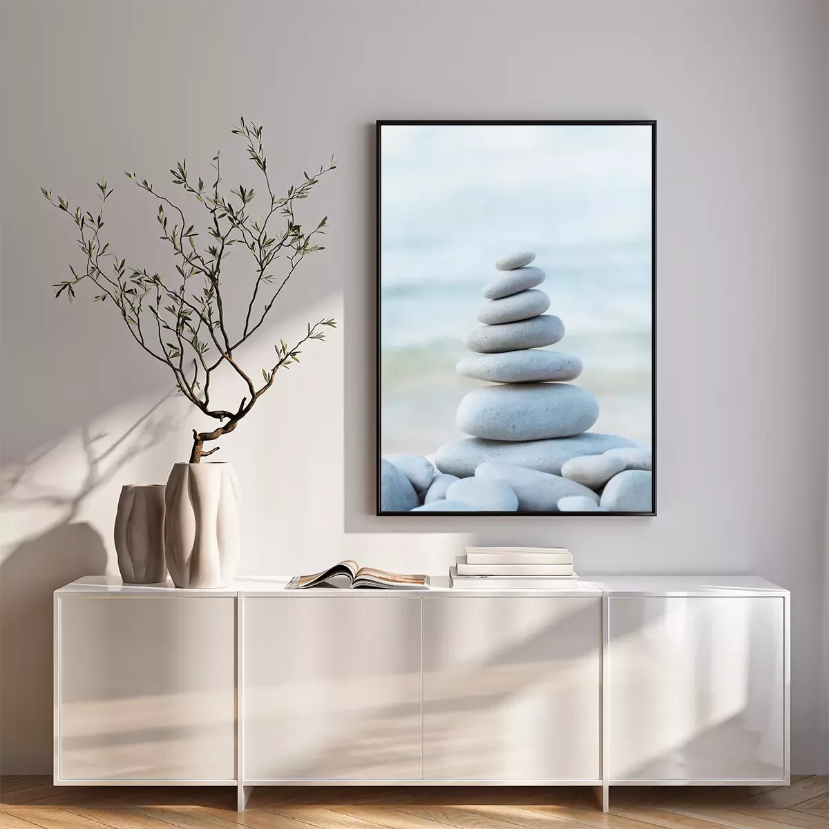 Poster: Steine am Strand mit dem Meer im Hintergrund