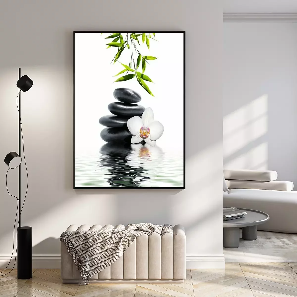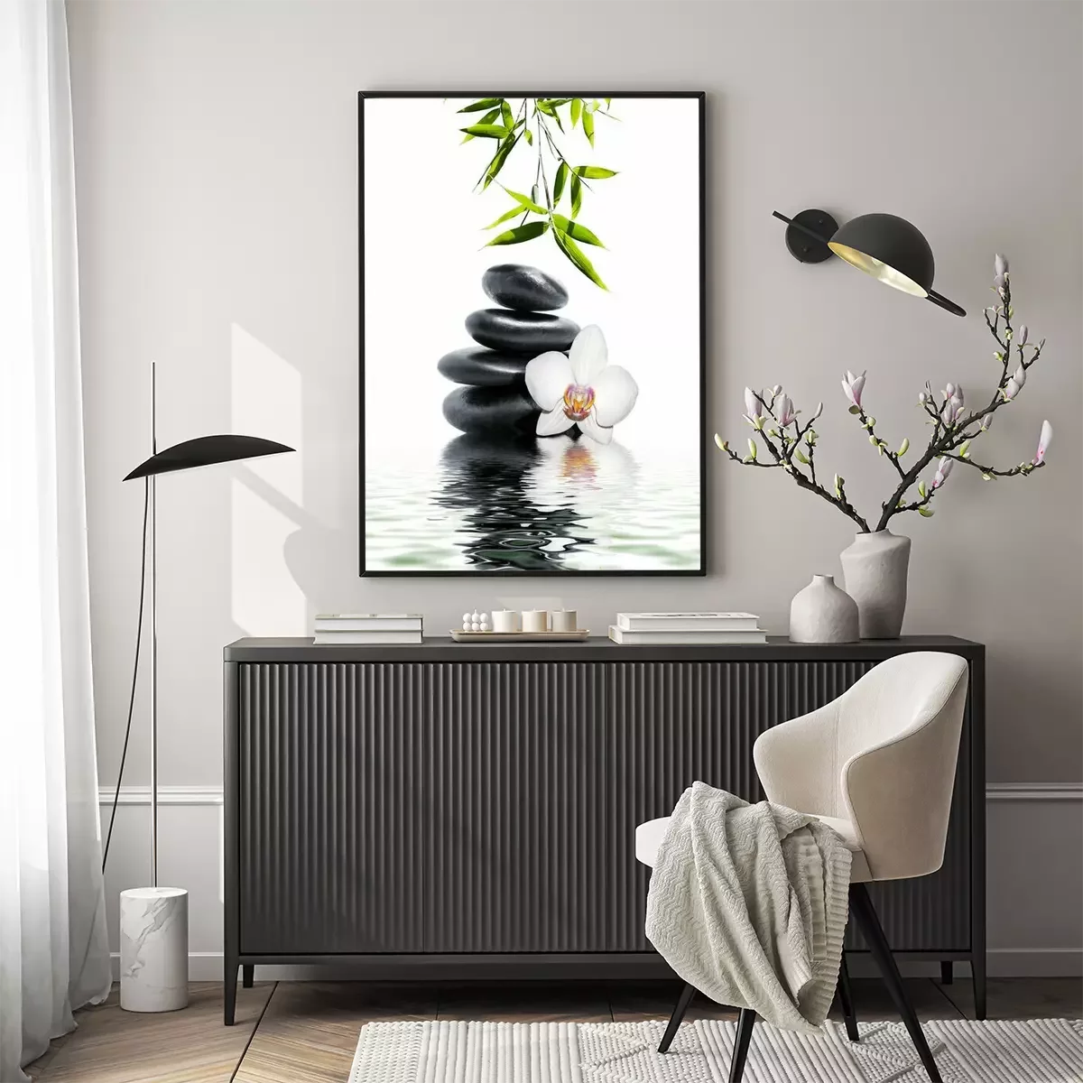 Zen-Steine mit Plumeria und Bambus spiegeln sich im Wasser