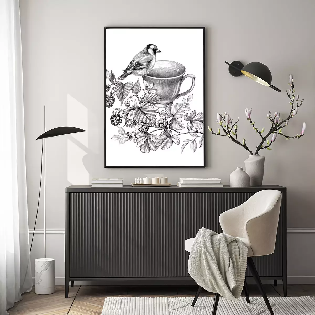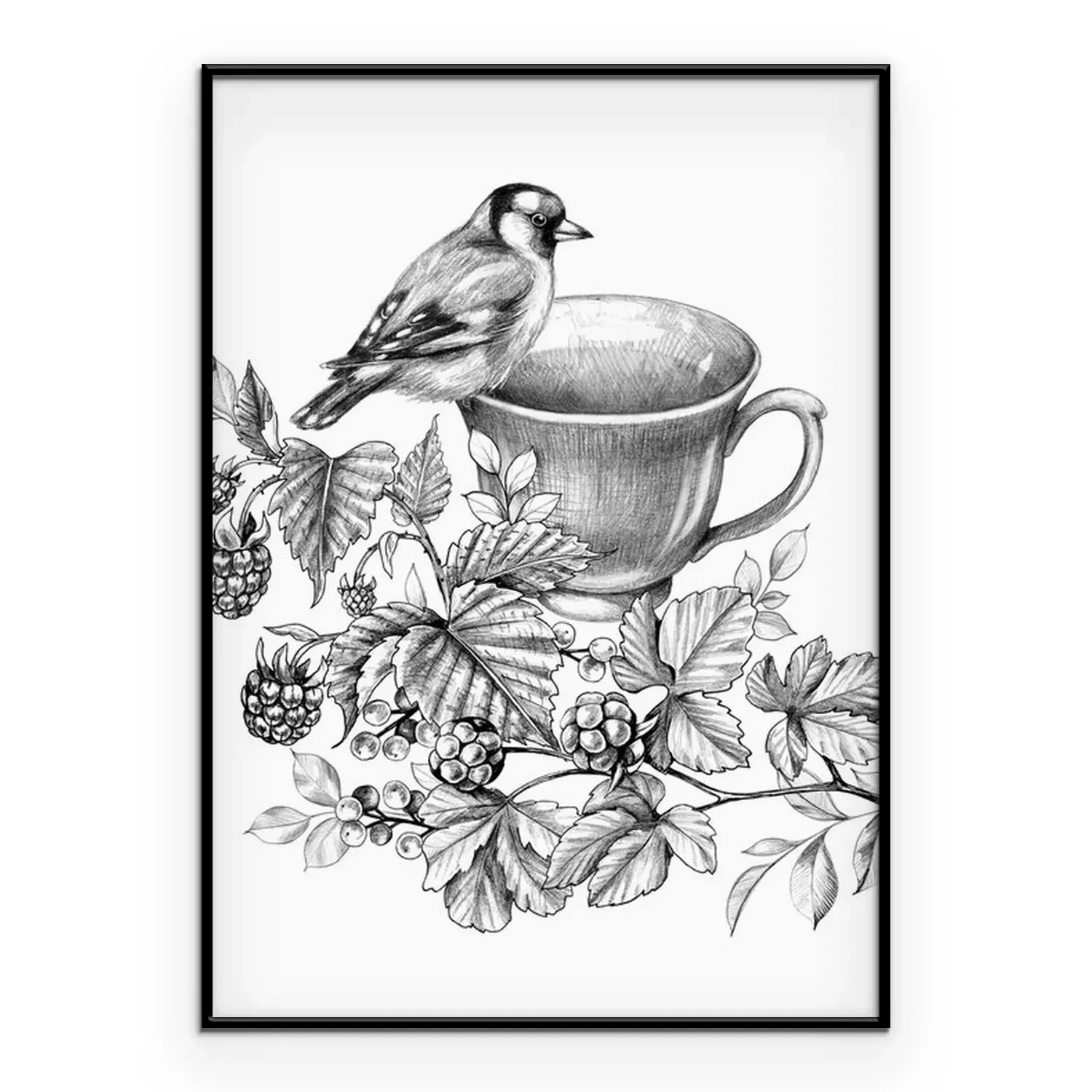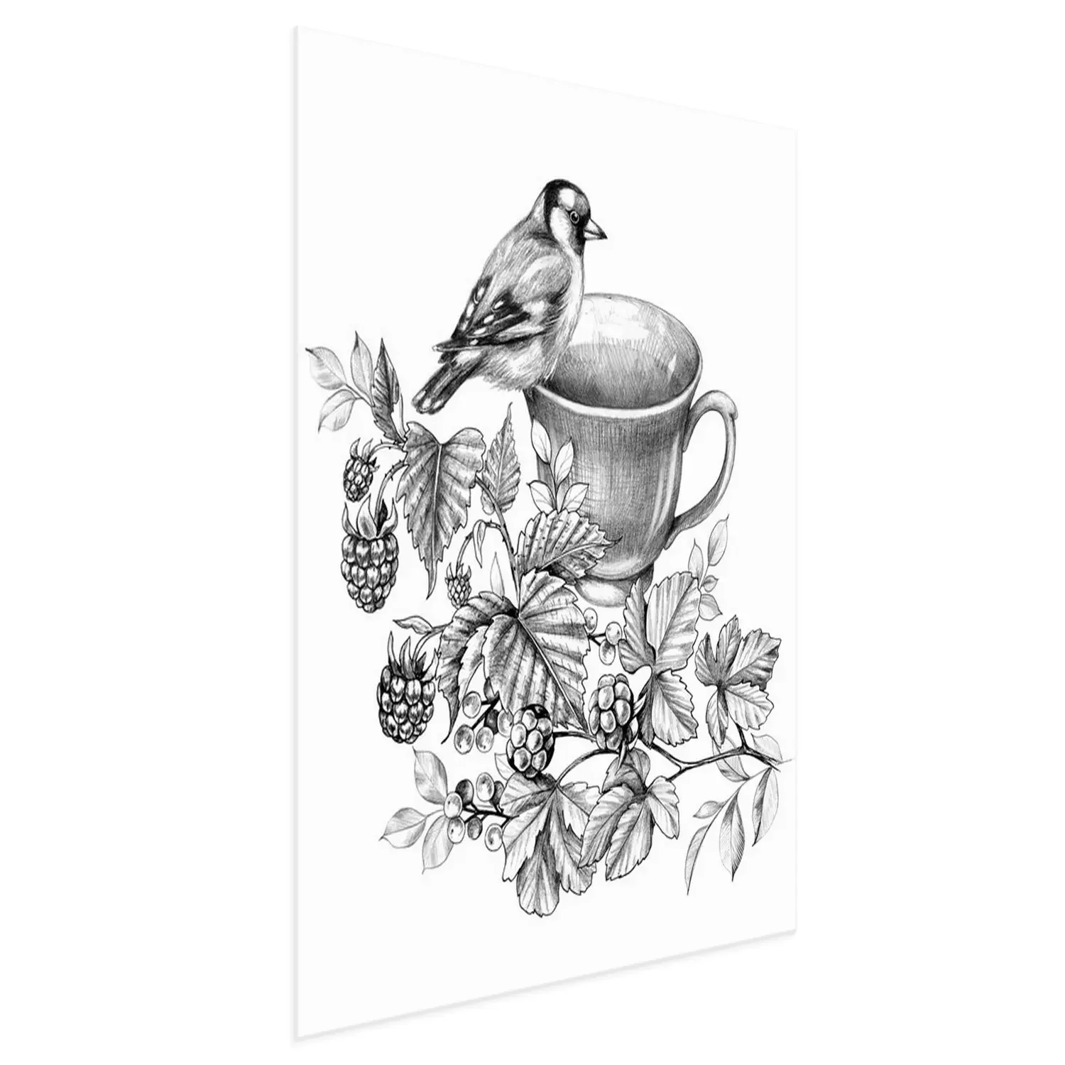 Poster: Stieglitz auf einer Tasse zwischen Himbeeren