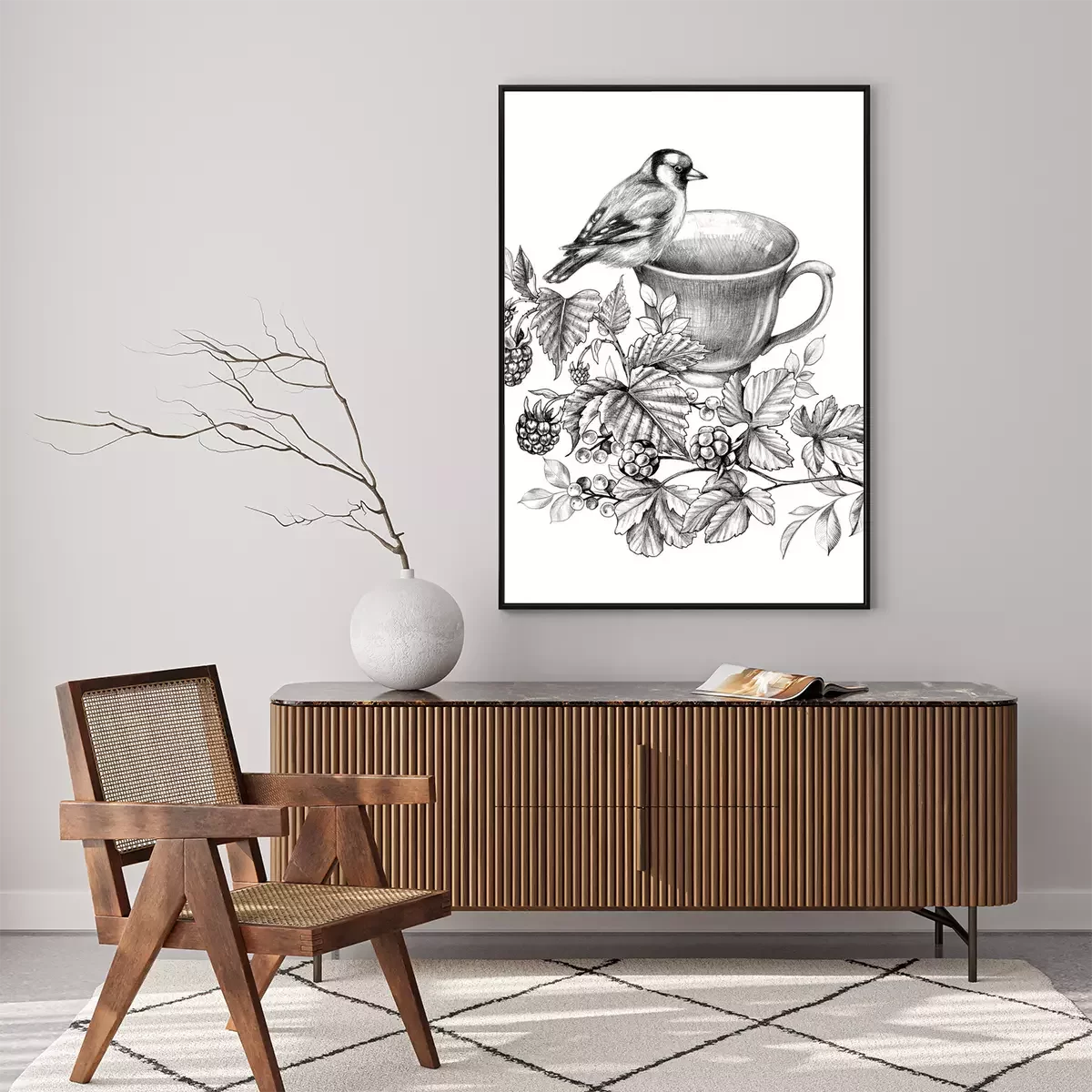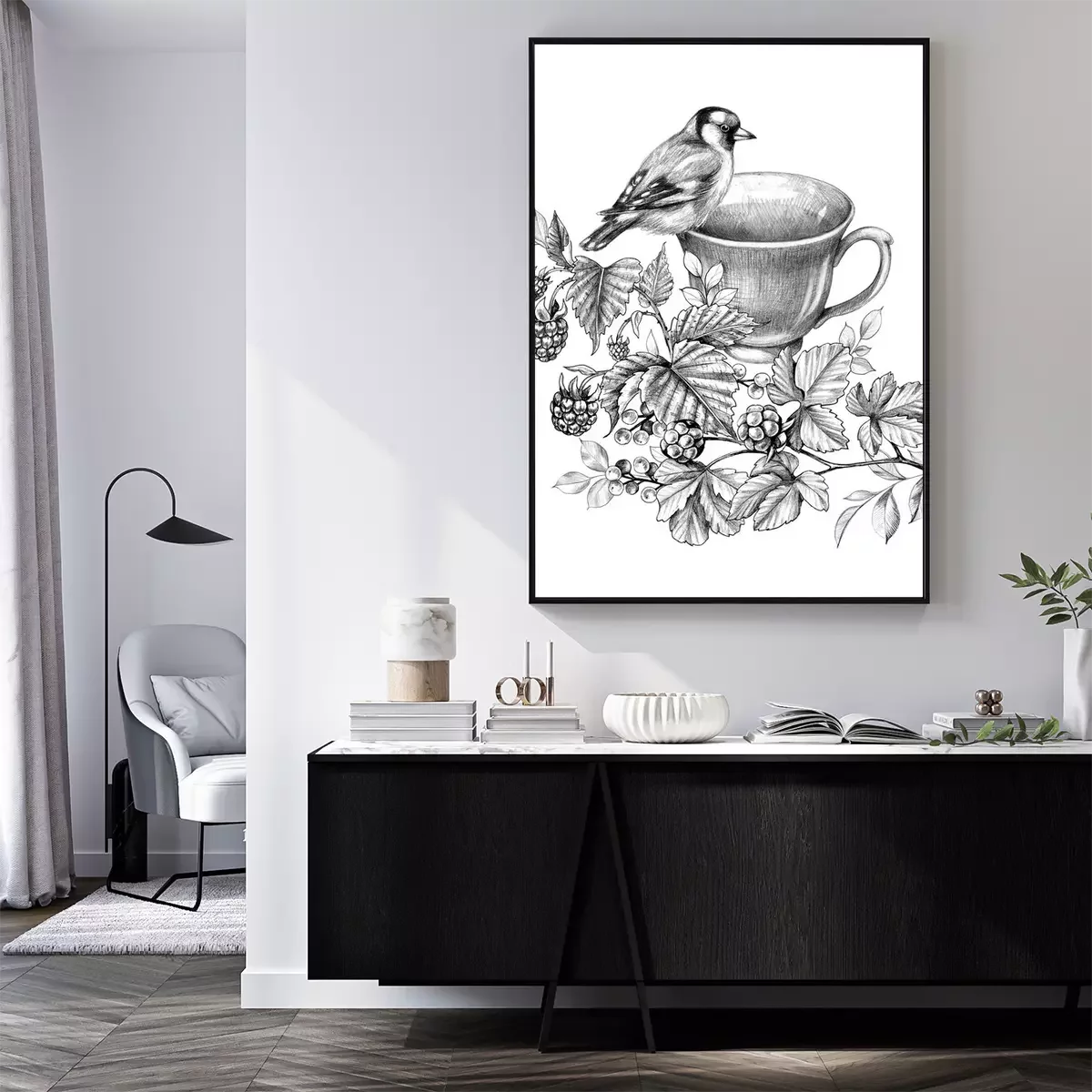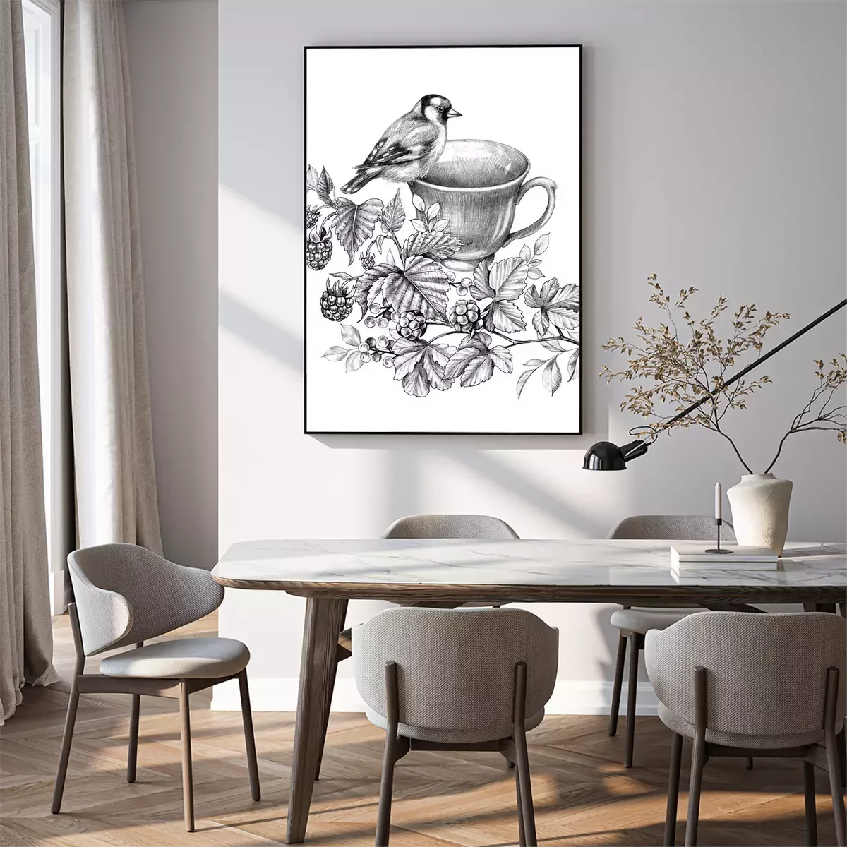 Poster: Stieglitz auf einer Tasse zwischen Himbeeren