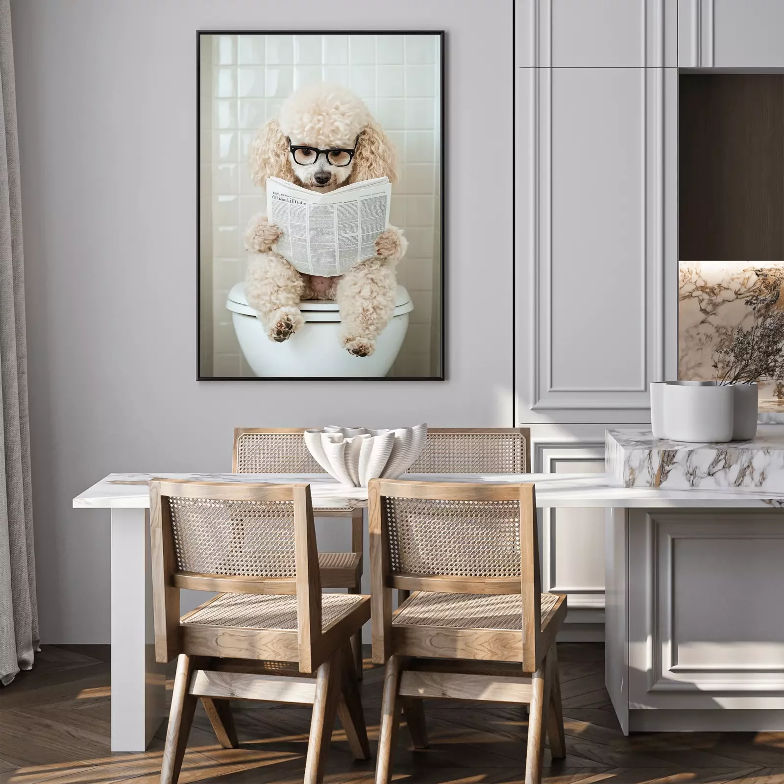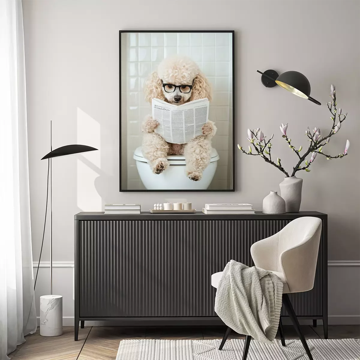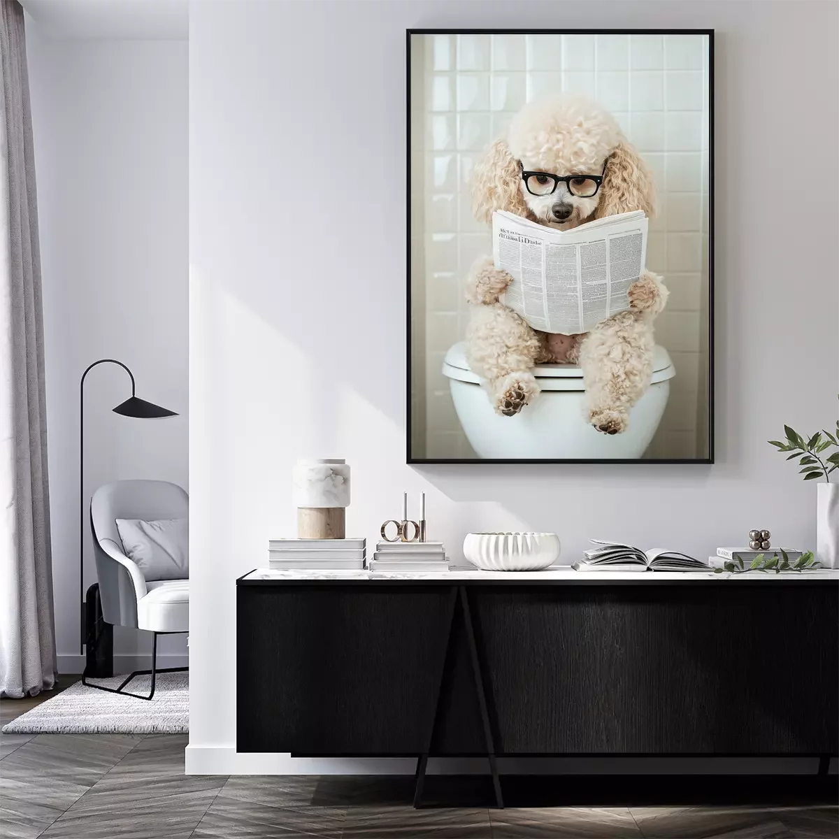 Poster: Süßer Hund mit Zeitung auf der Toilette