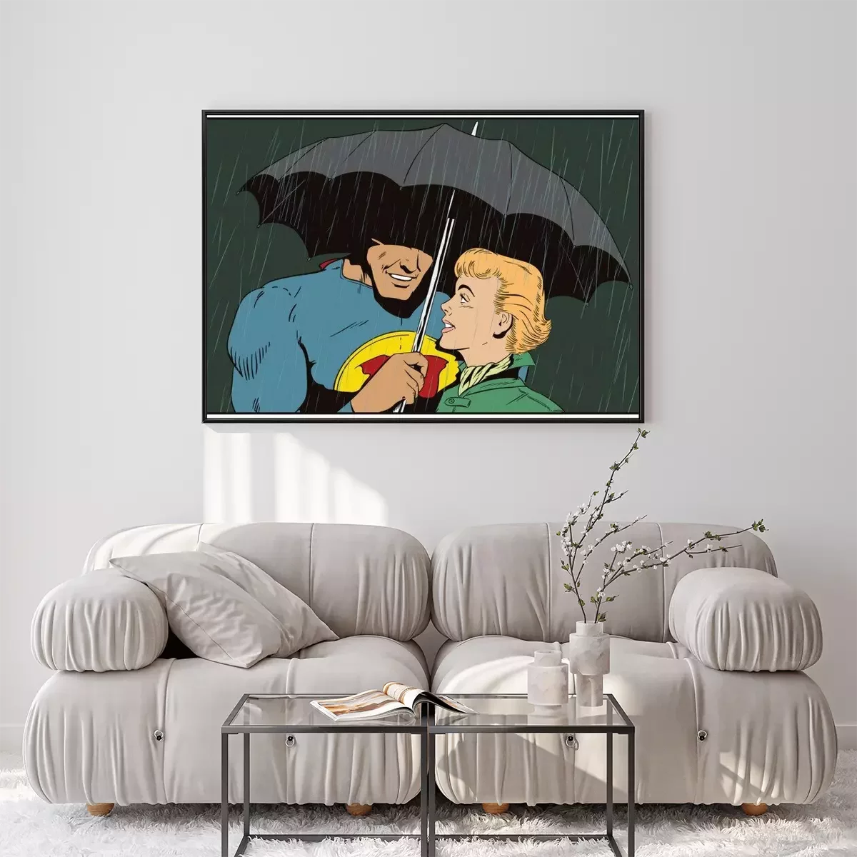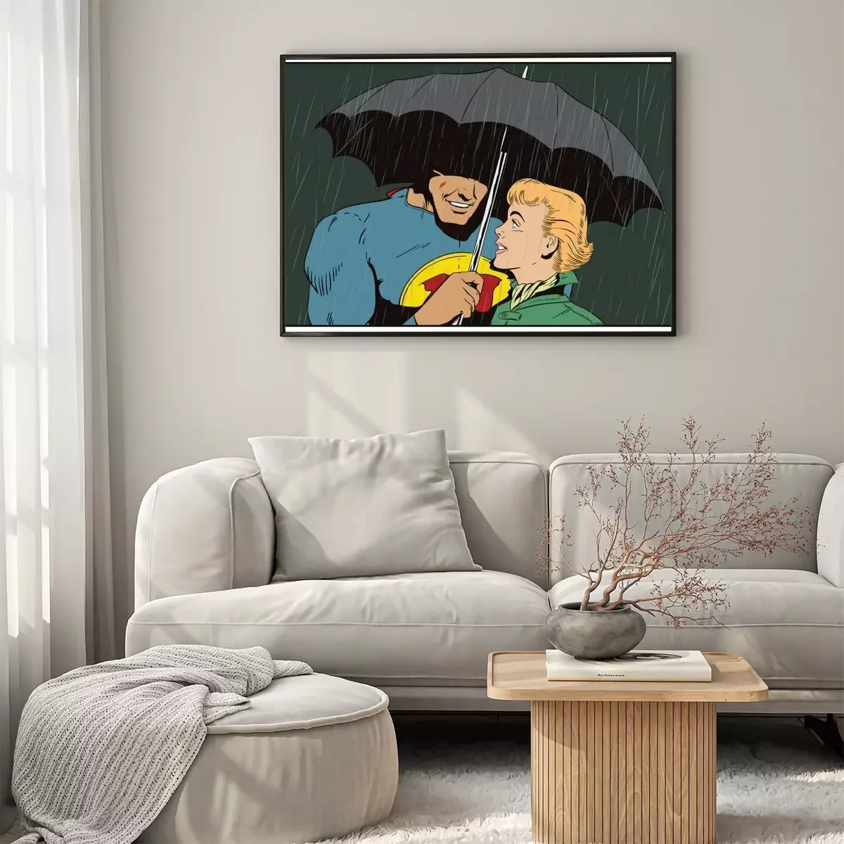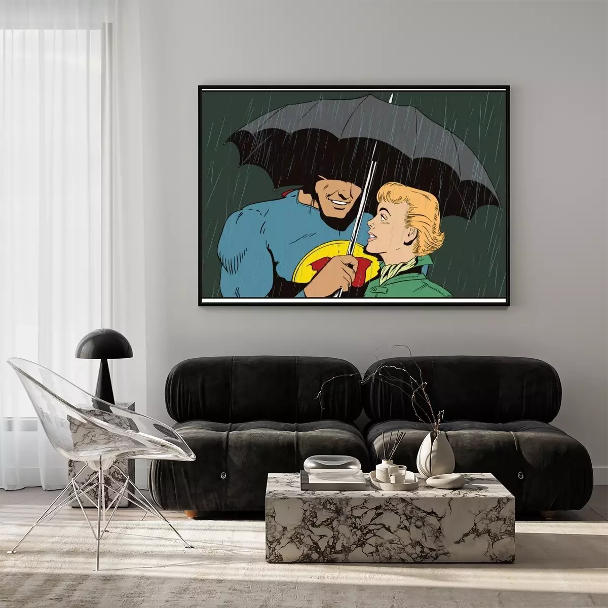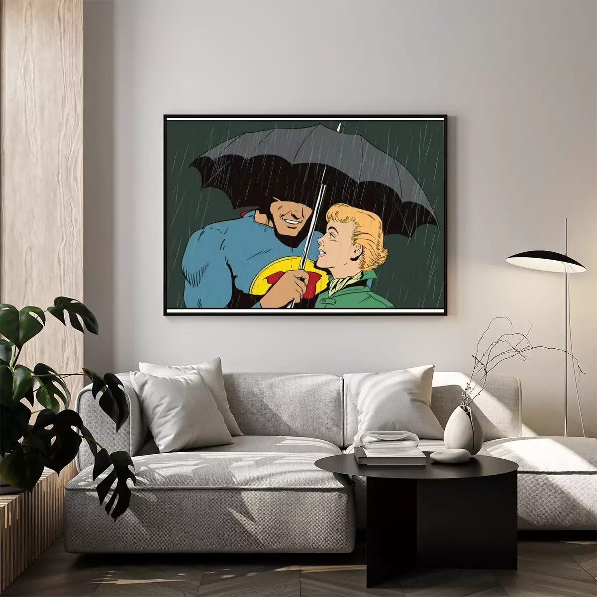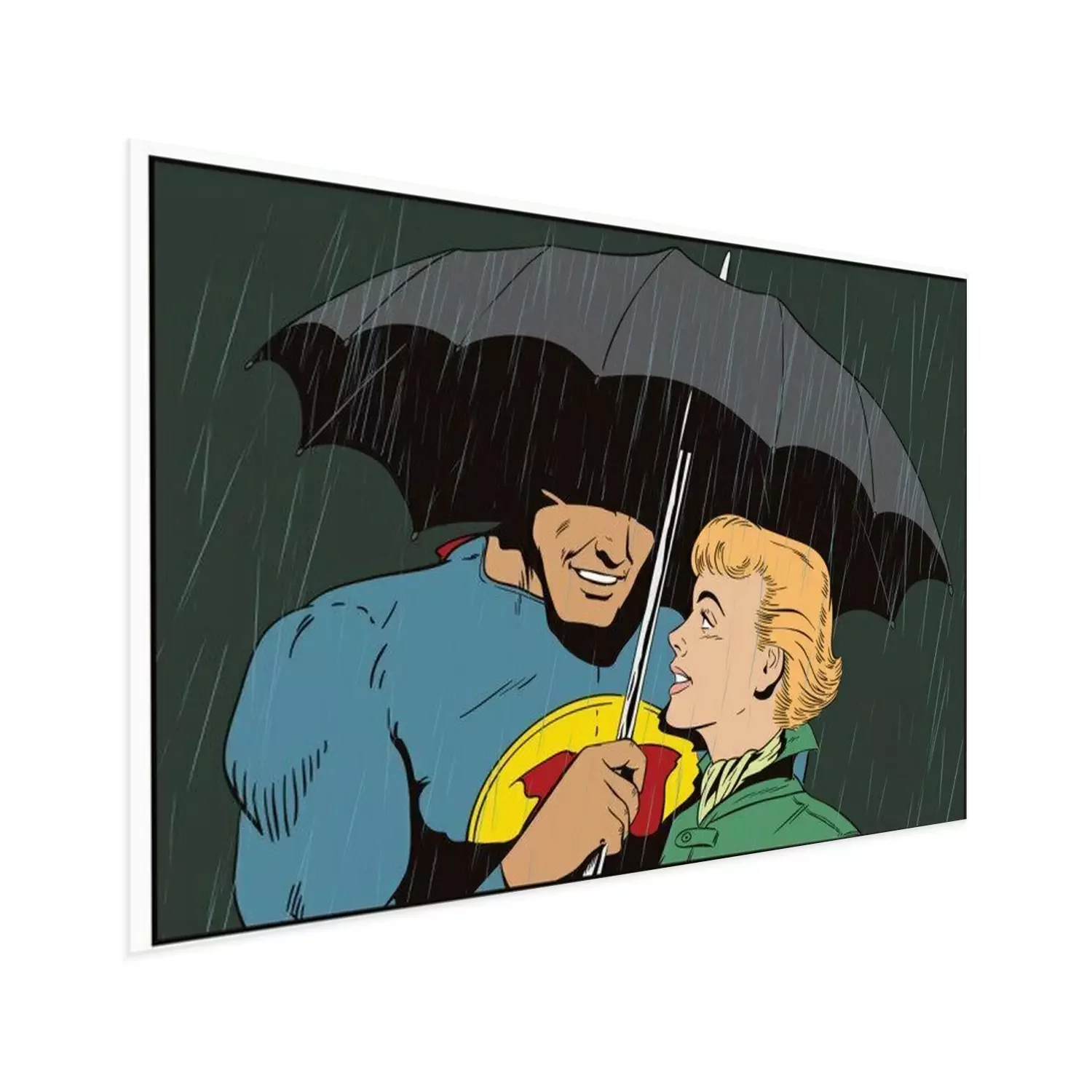 Poster Superheld rettet Mädchen vor Regen. Ein Held hält einen Regenschirm über eine Frau. Stock Illustration.