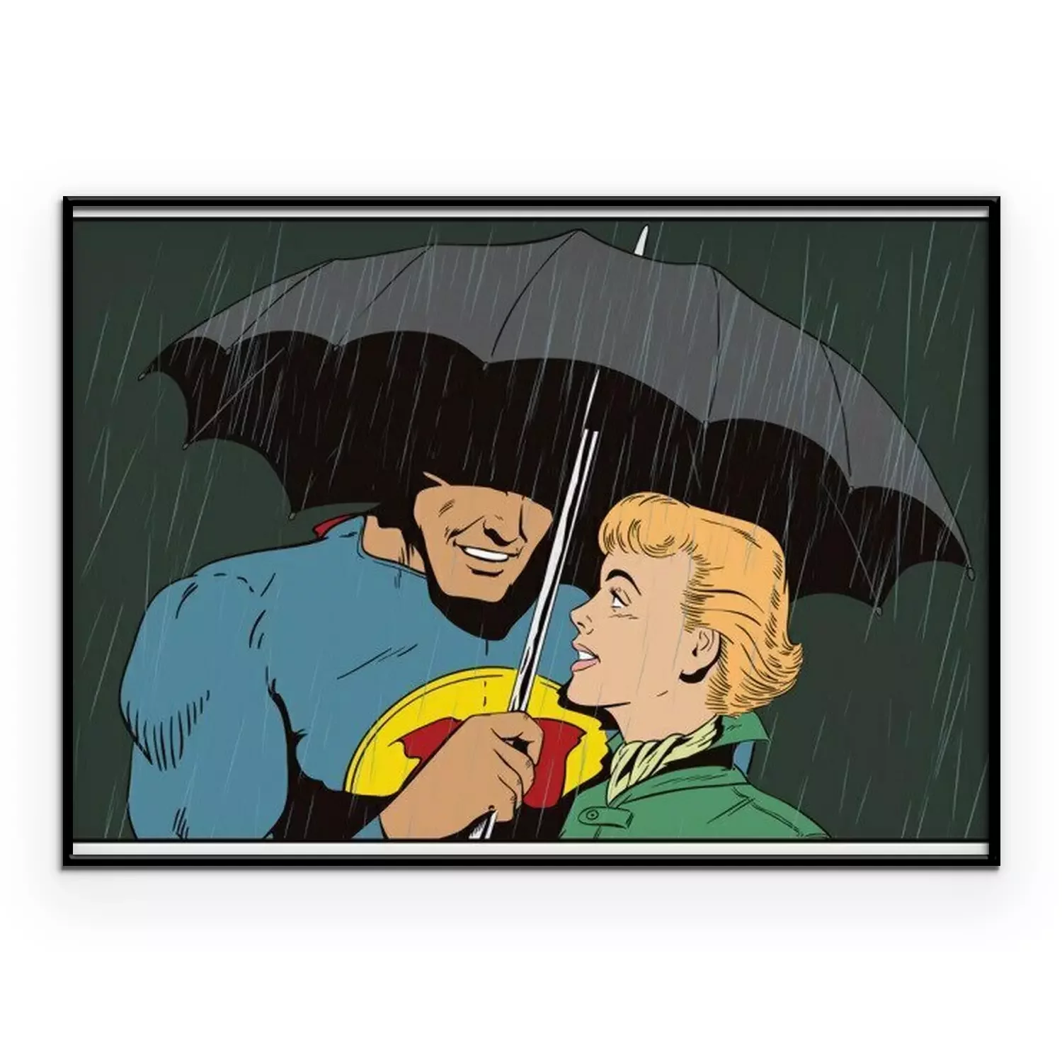 Poster: Superheld rettet Mädchen vor Regen. Ein Held hält einen Regenschirm über eine Frau. Stock Illustration.