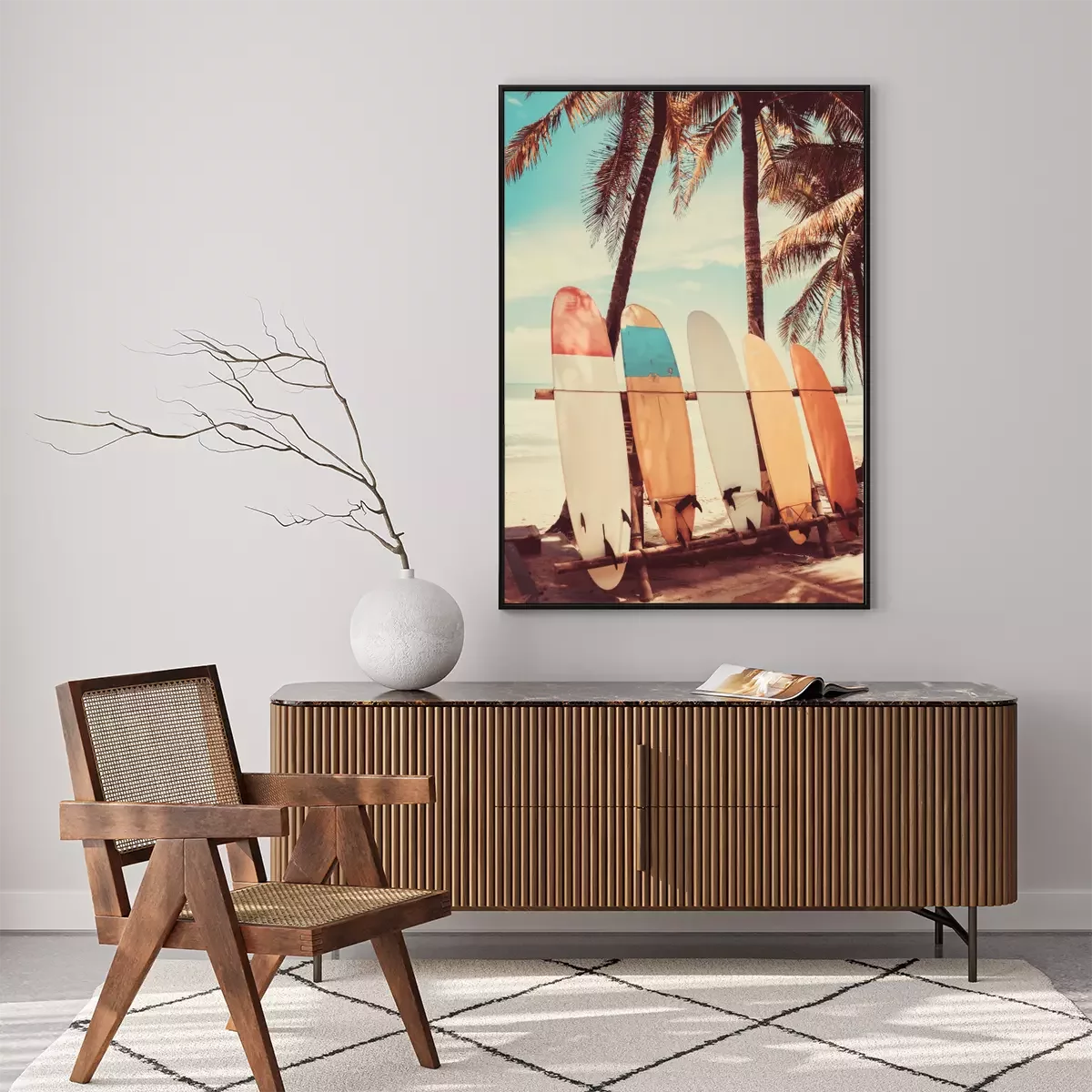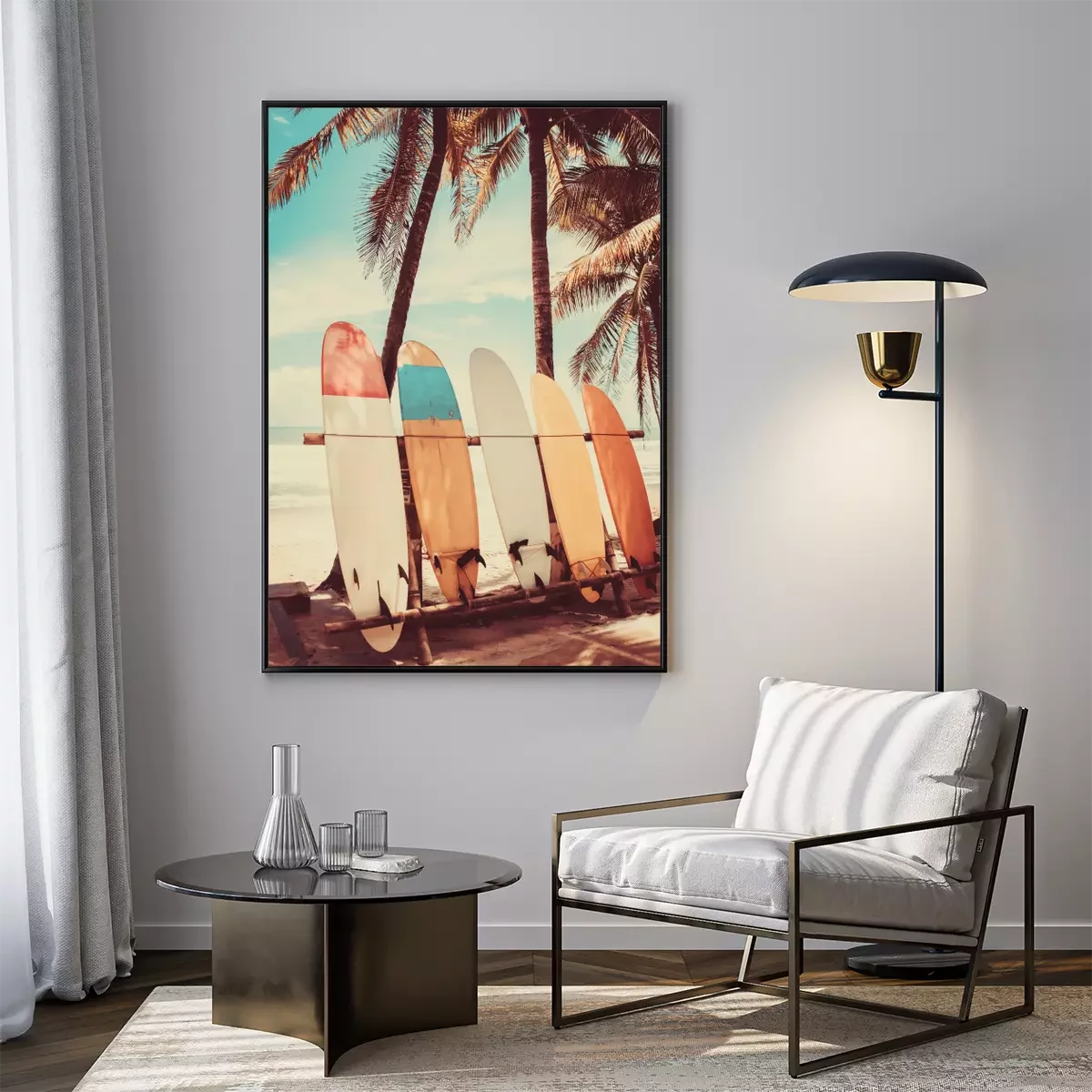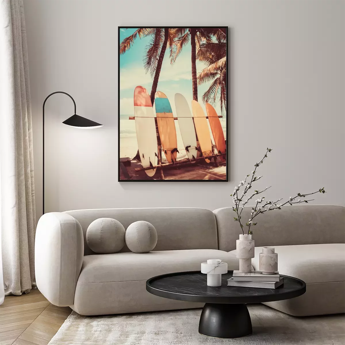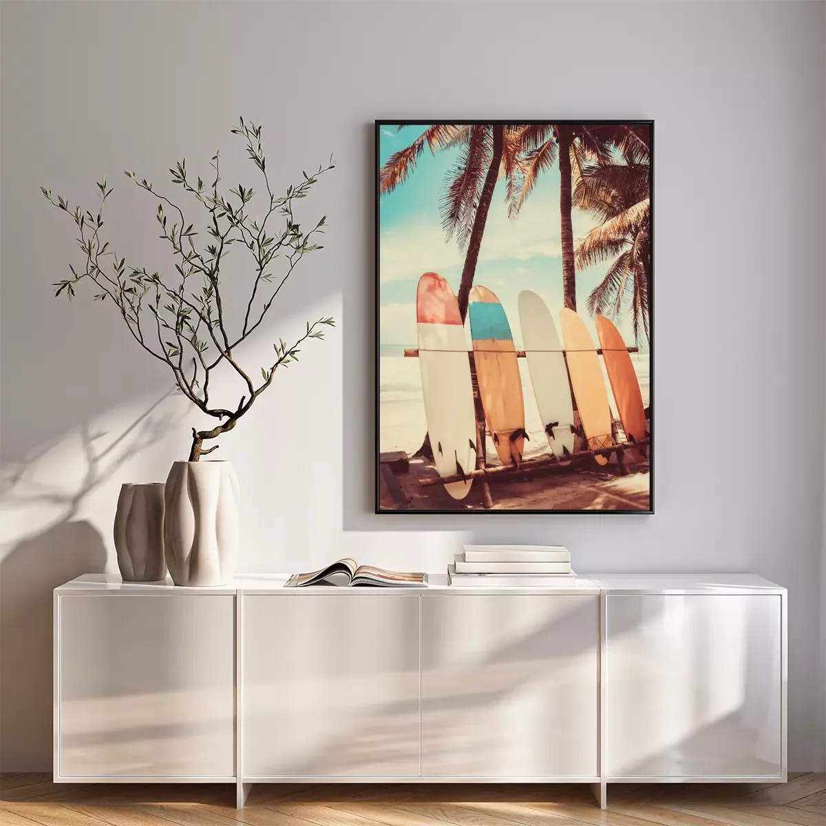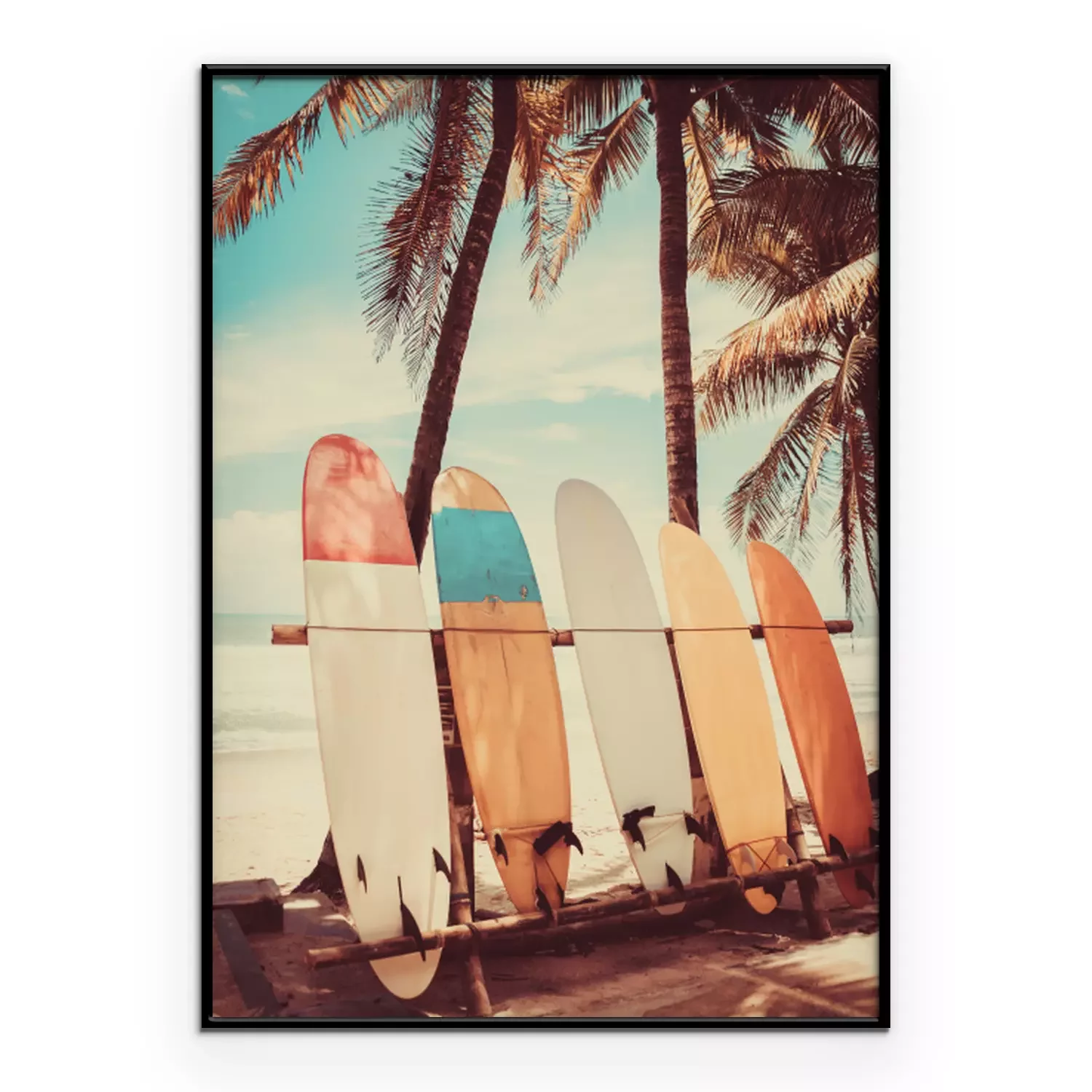 Poster: Surfbrett und Palmen auf dem Strand Hintergrund