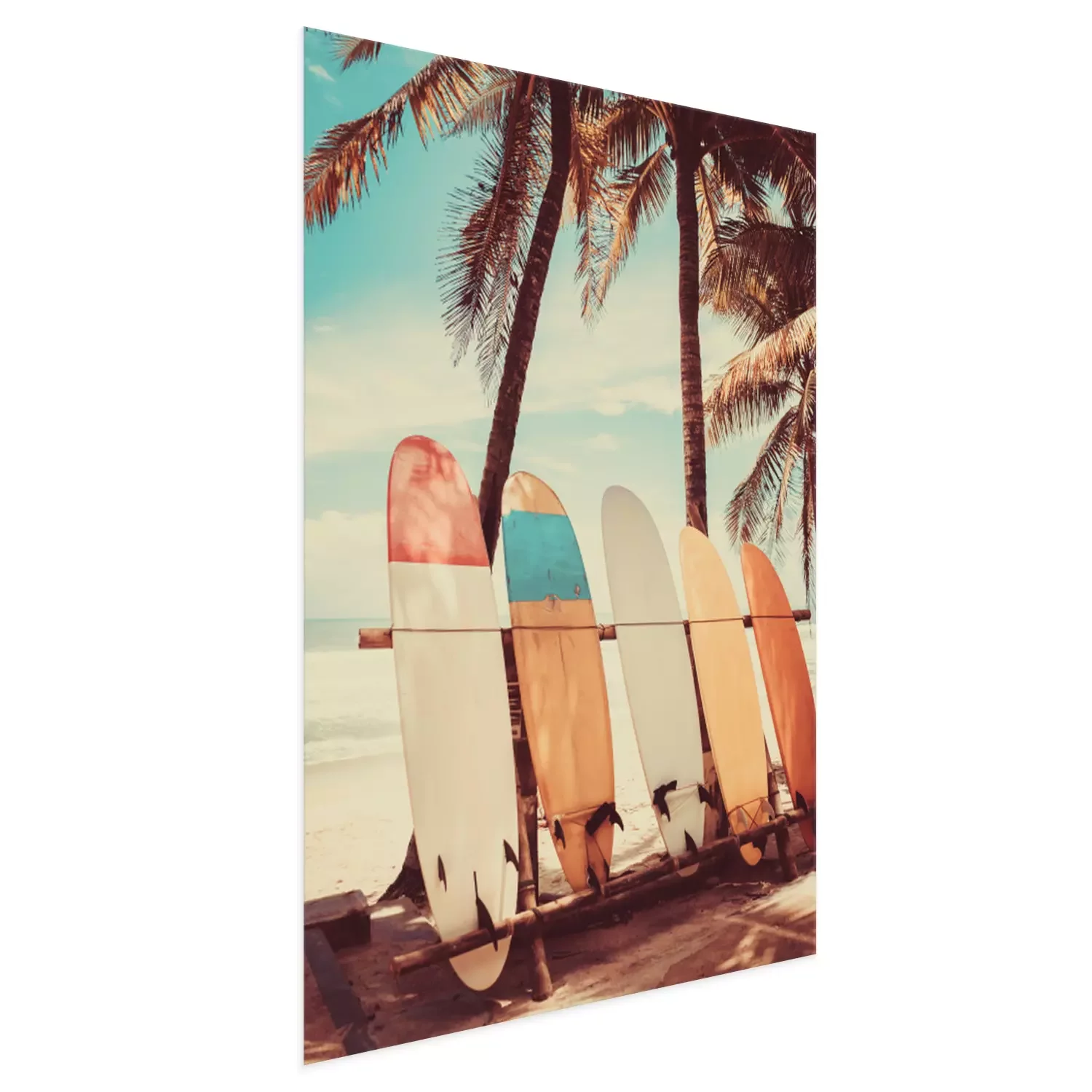 Poster Surfbrett und Palmen auf dem Strand Hintergrund