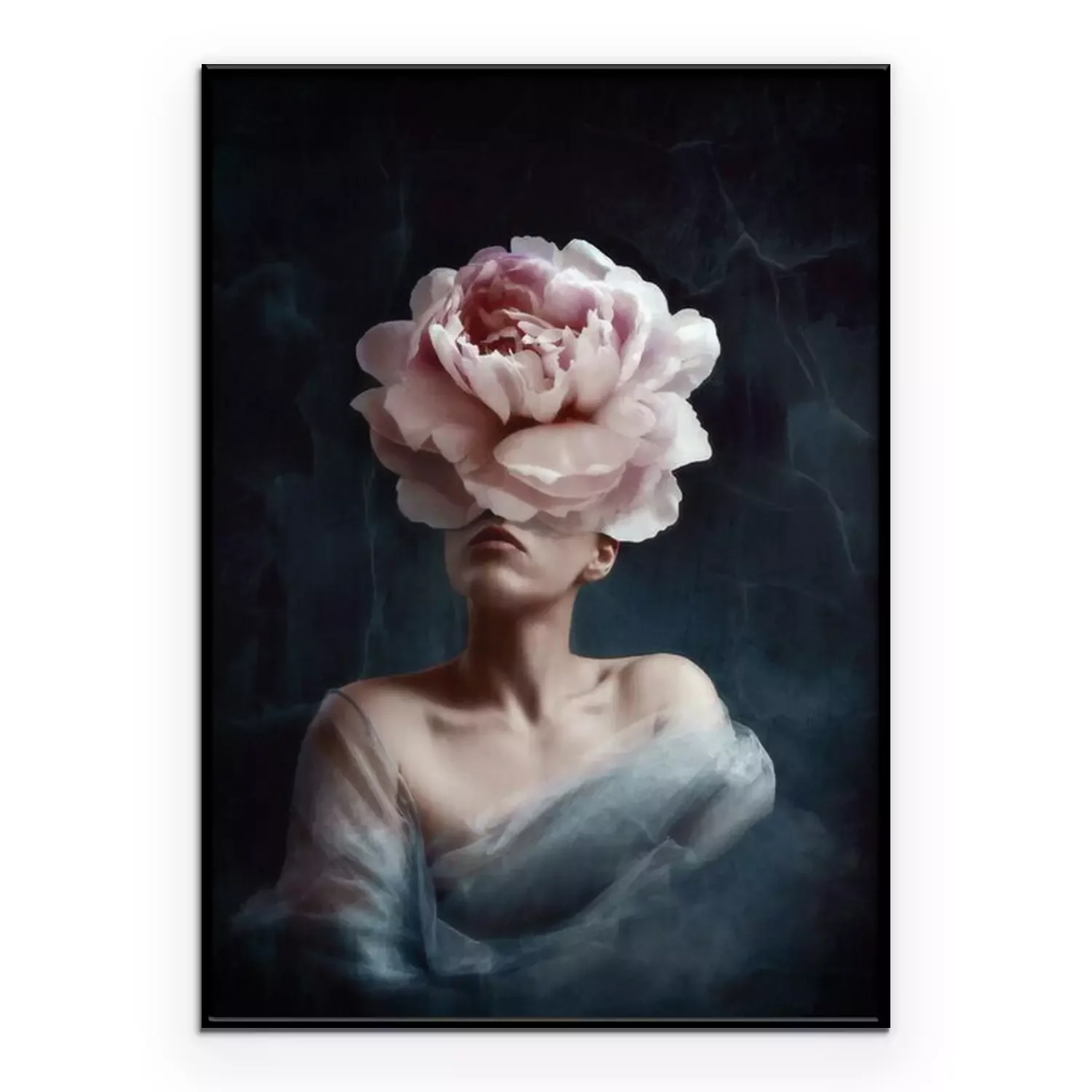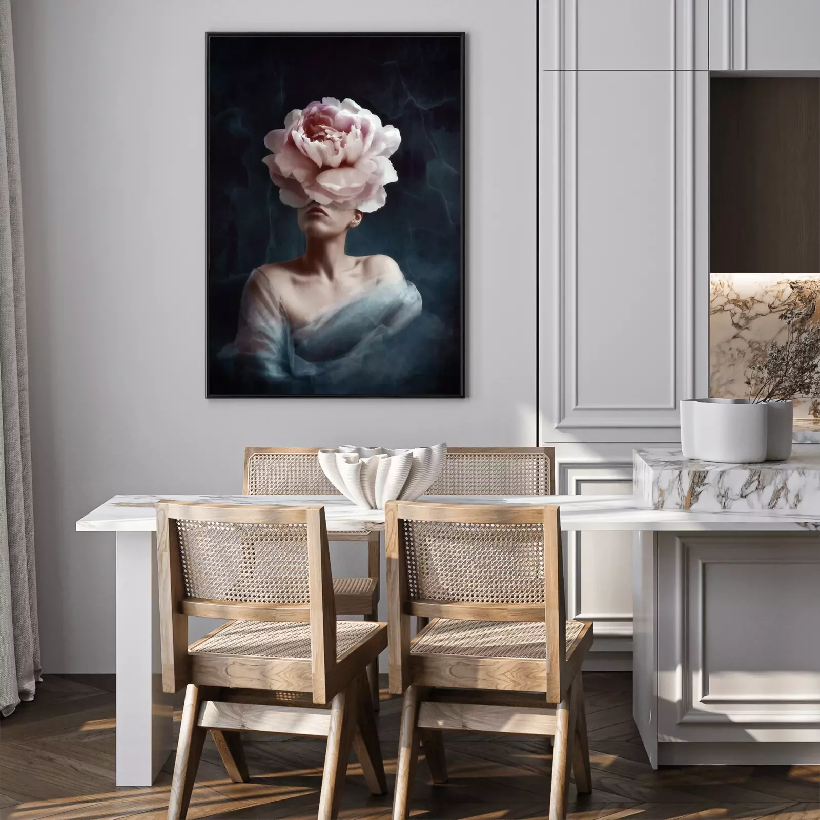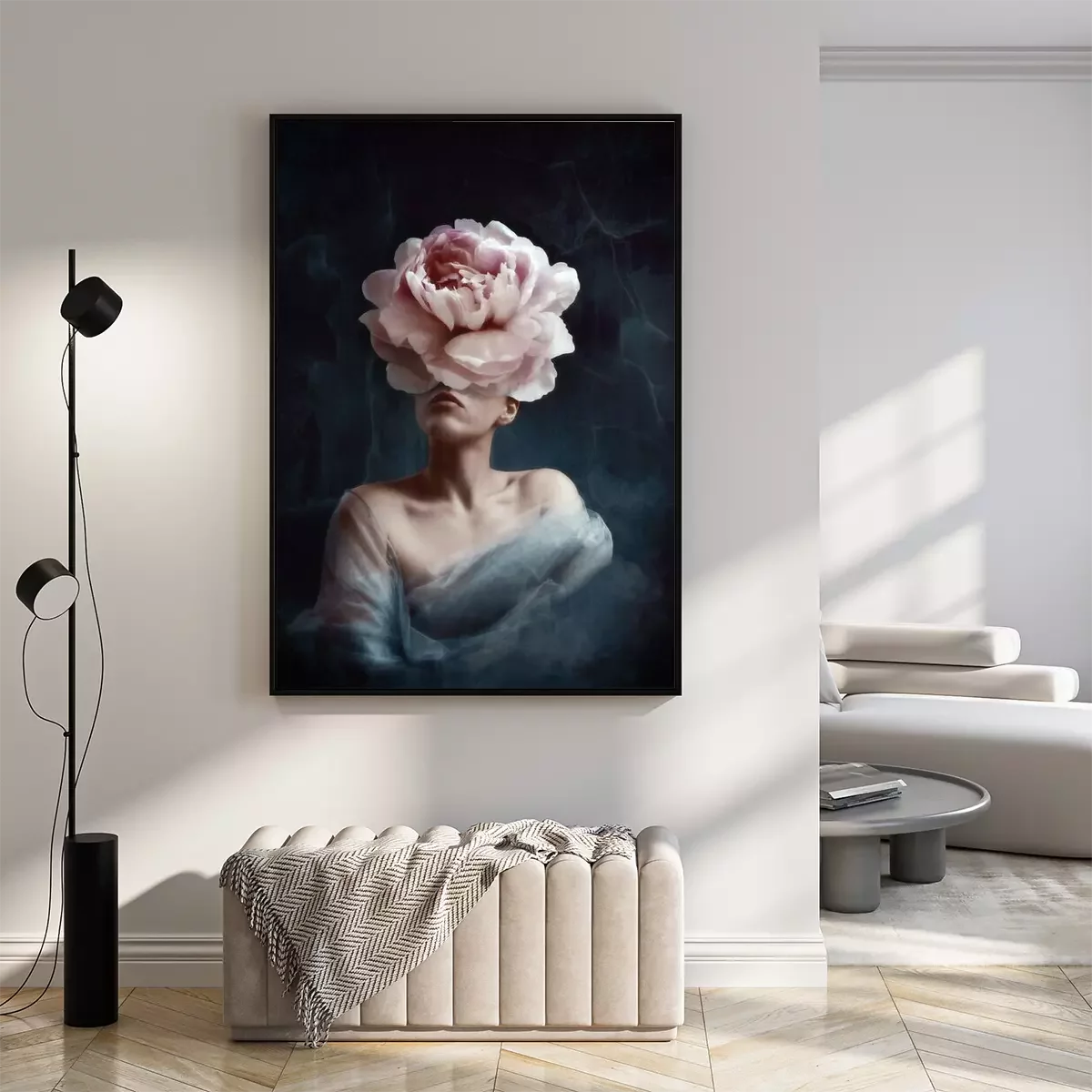 Poster: Surrealistisches künstlerisches Konzept einer Frau mit Pfingstrosenkopf