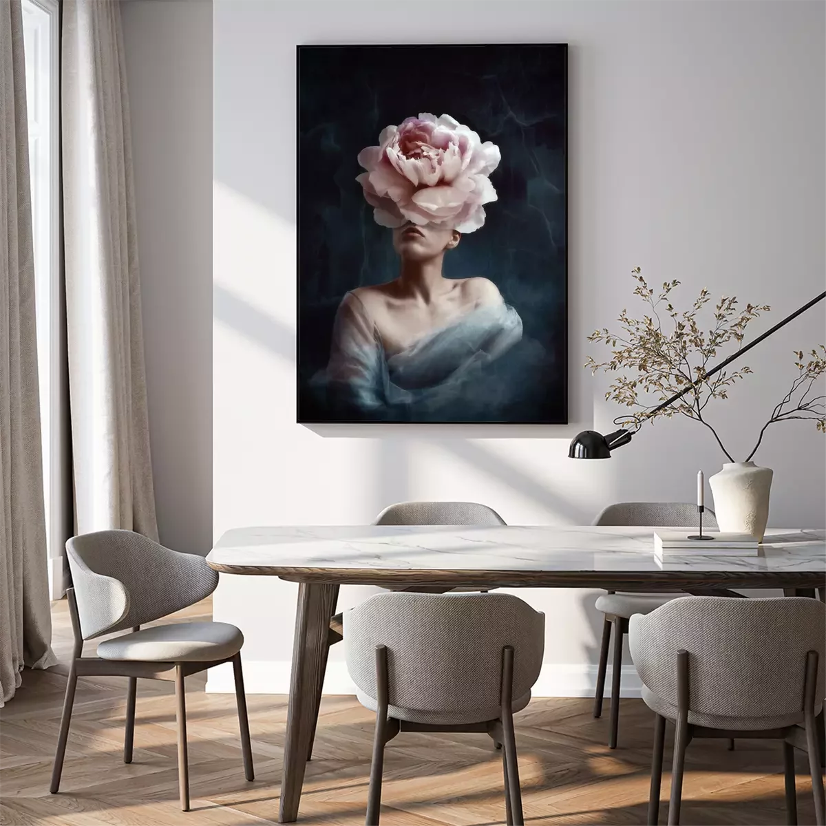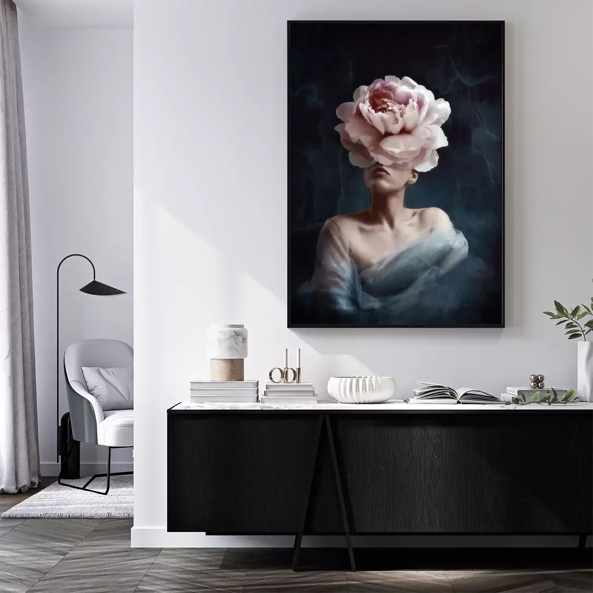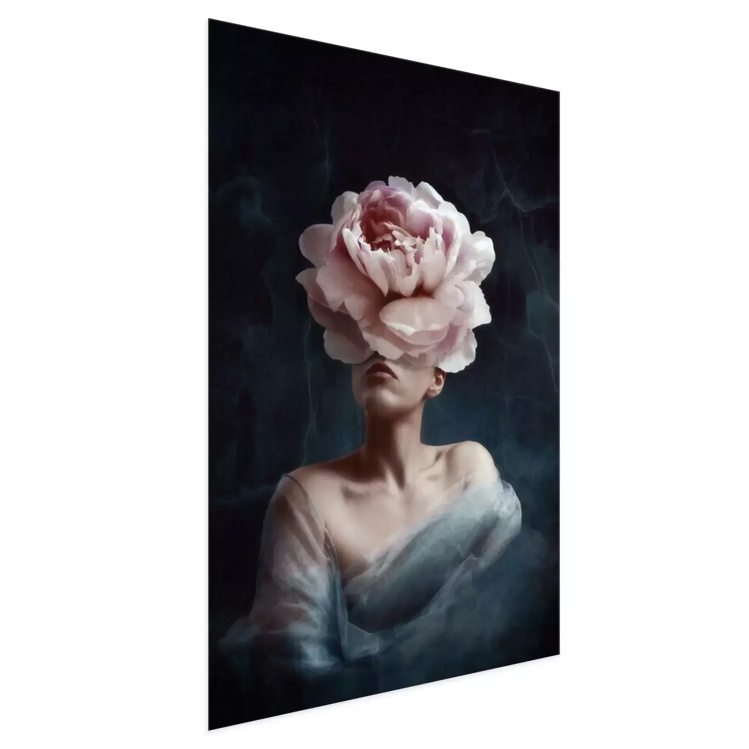 Poster Surrealistisches künstlerisches Konzept einer Frau mit Pfingstrosenkopf