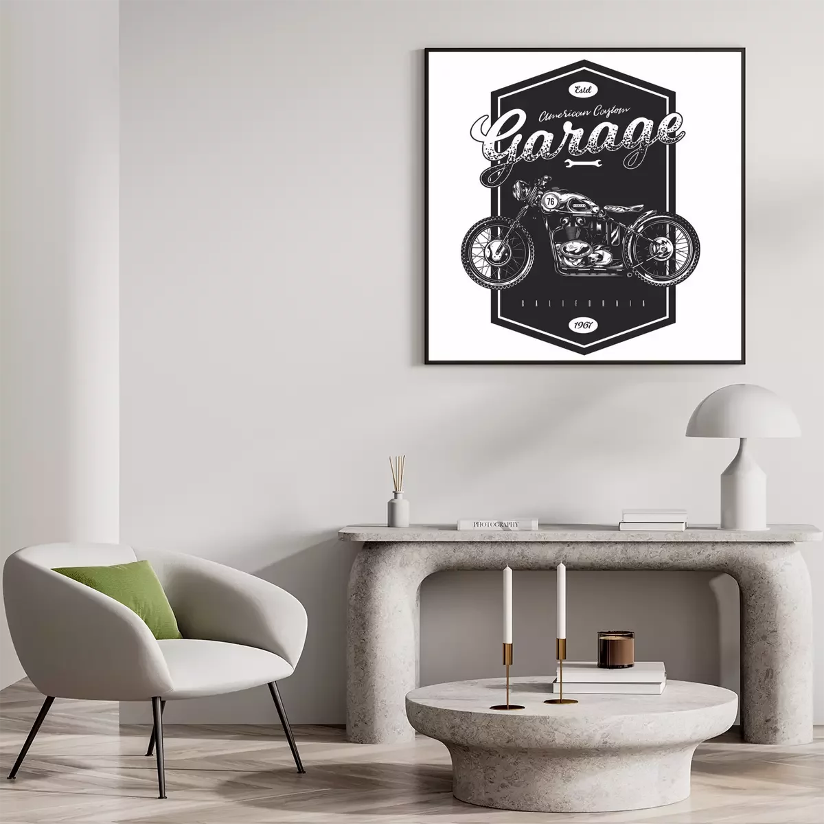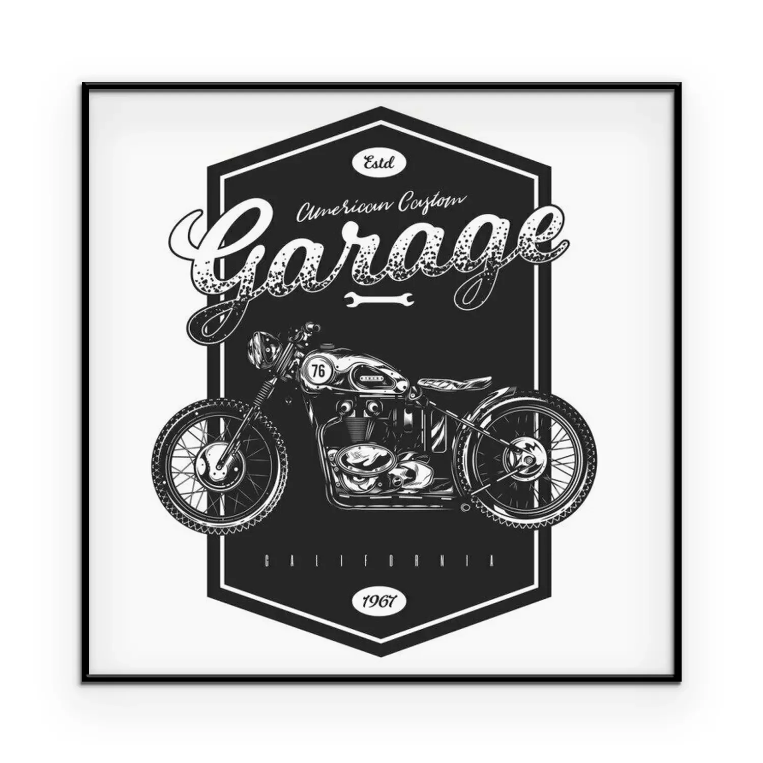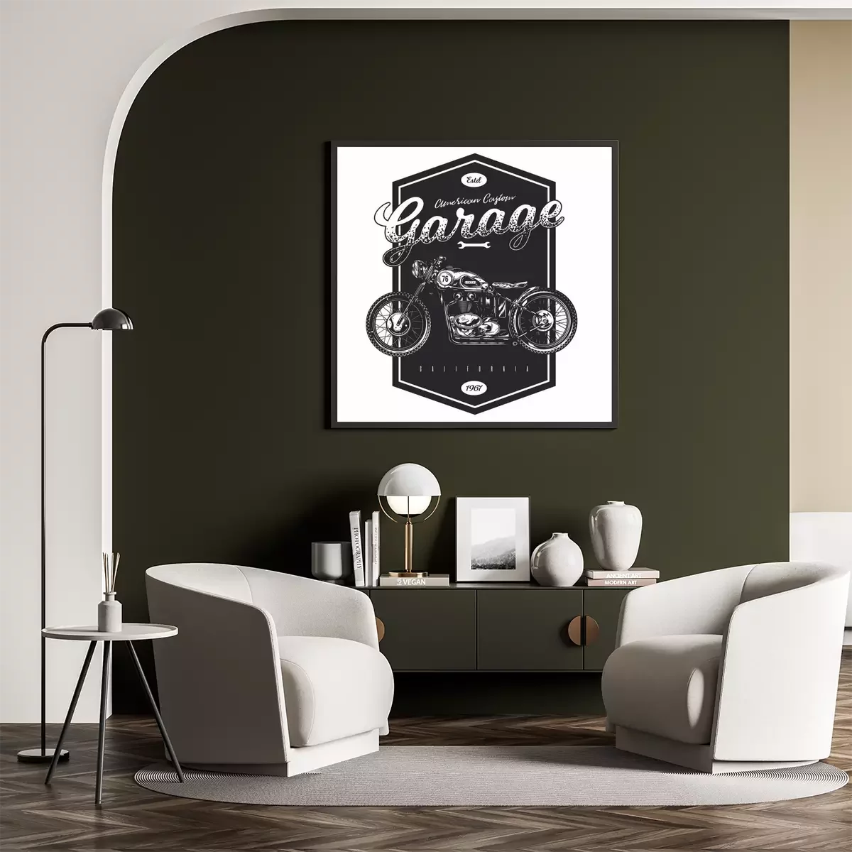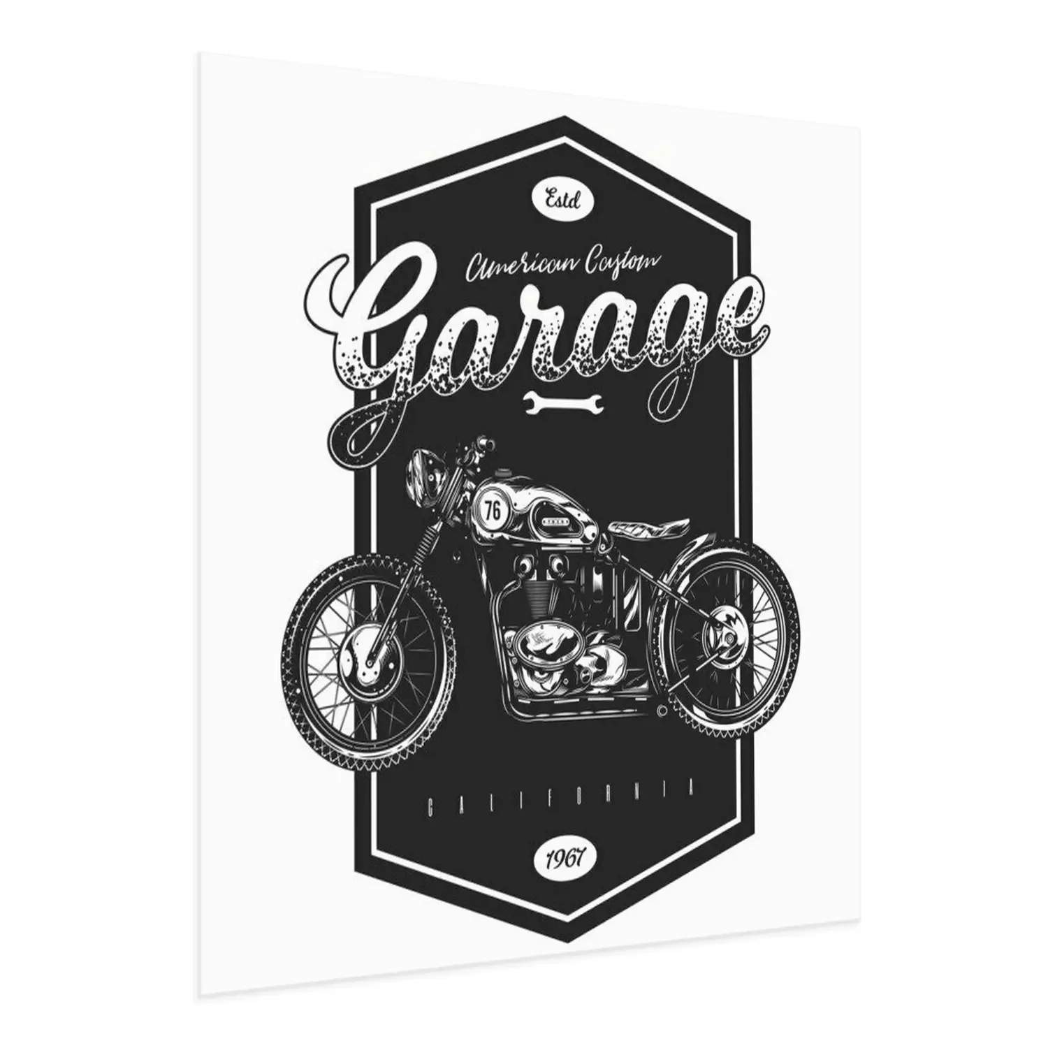 Poster: T-shirt or poster design with an illustration of an old motorcycle. Design with text composition on light and dark background.
