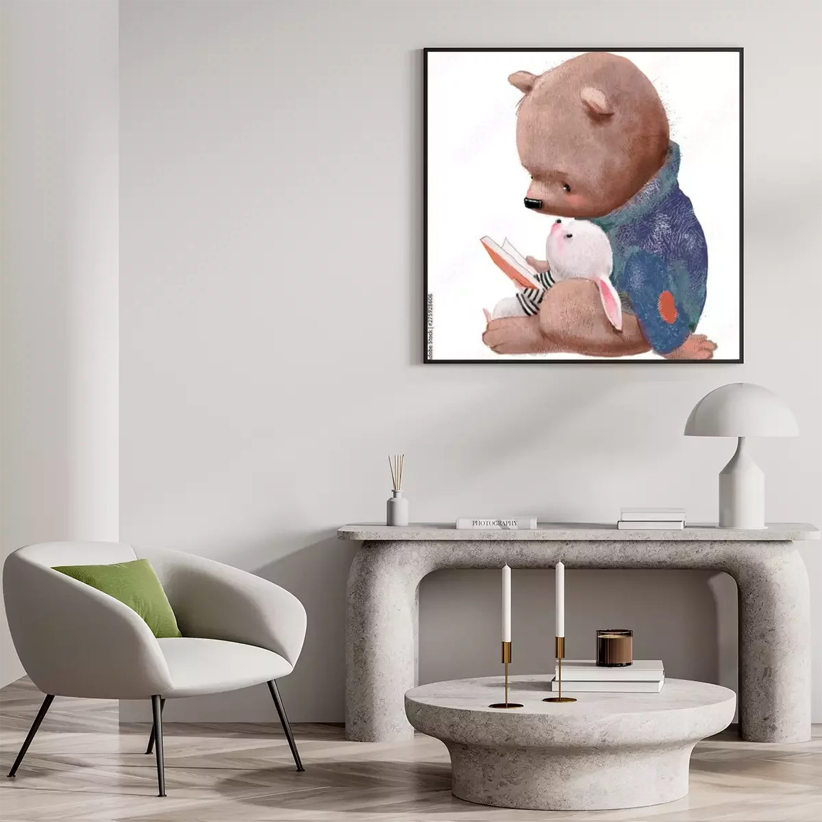 Poster: Teddybär und Häschen lesen ein Buch