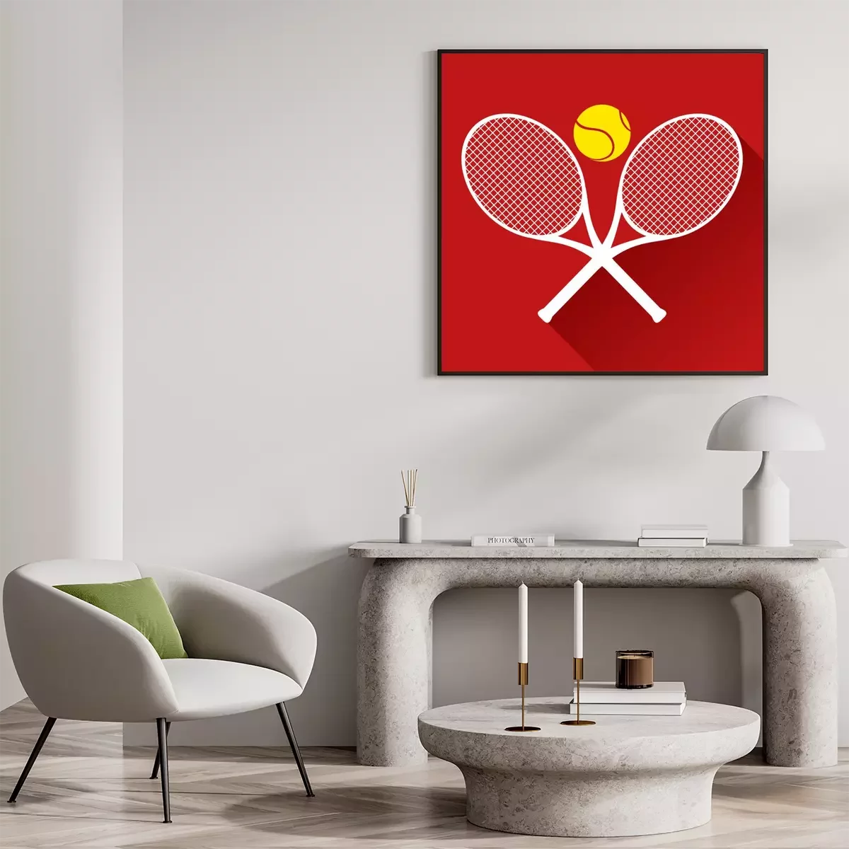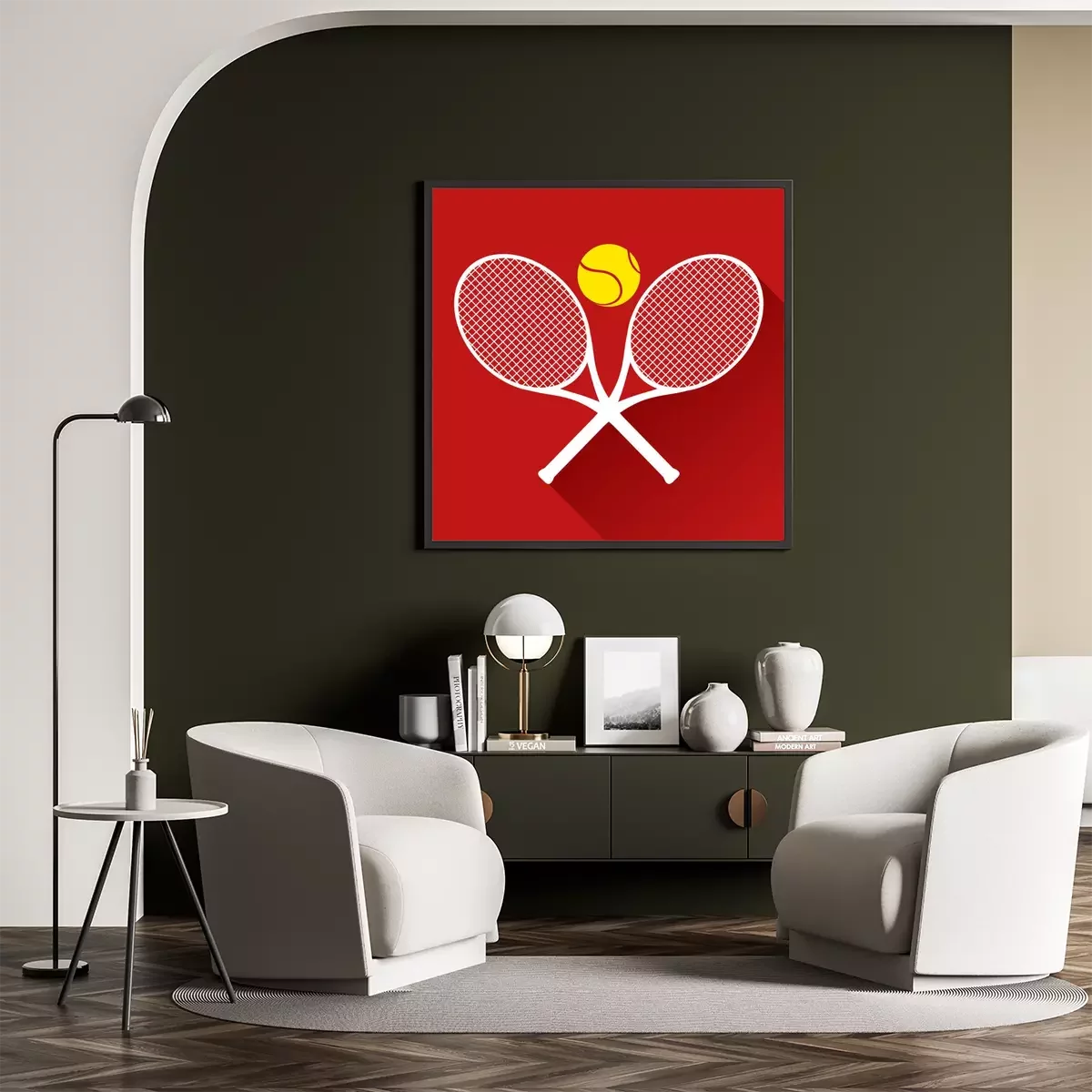 Poster: Tennis Grafik mit Schlägern und gelbem Ball