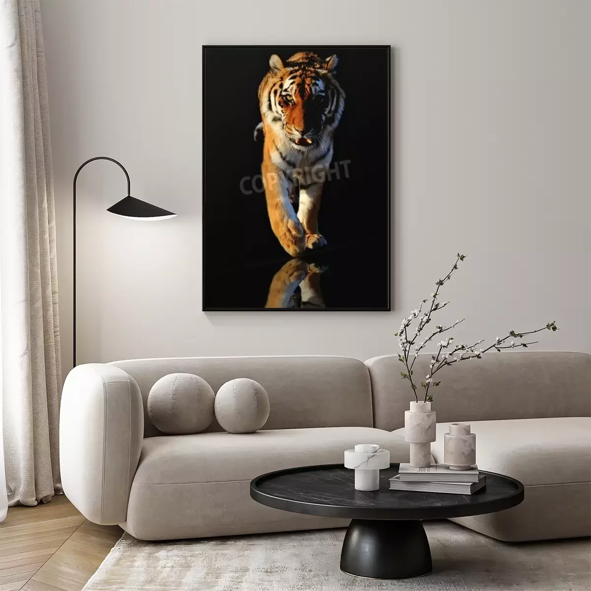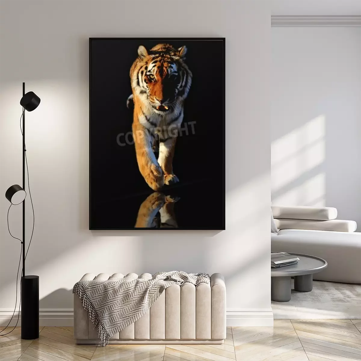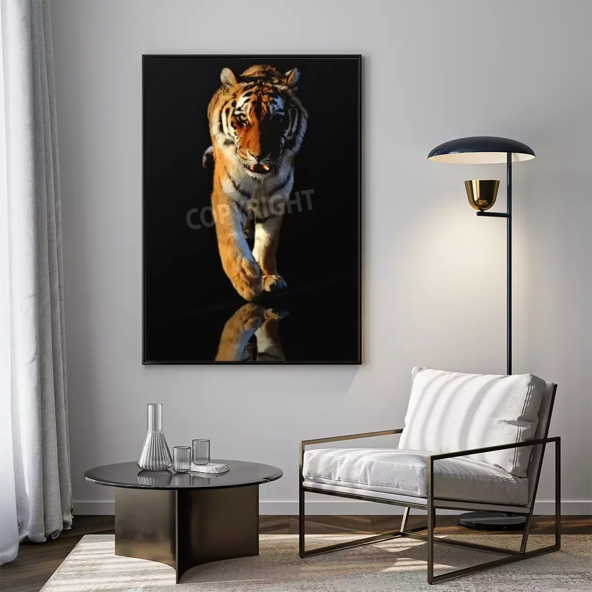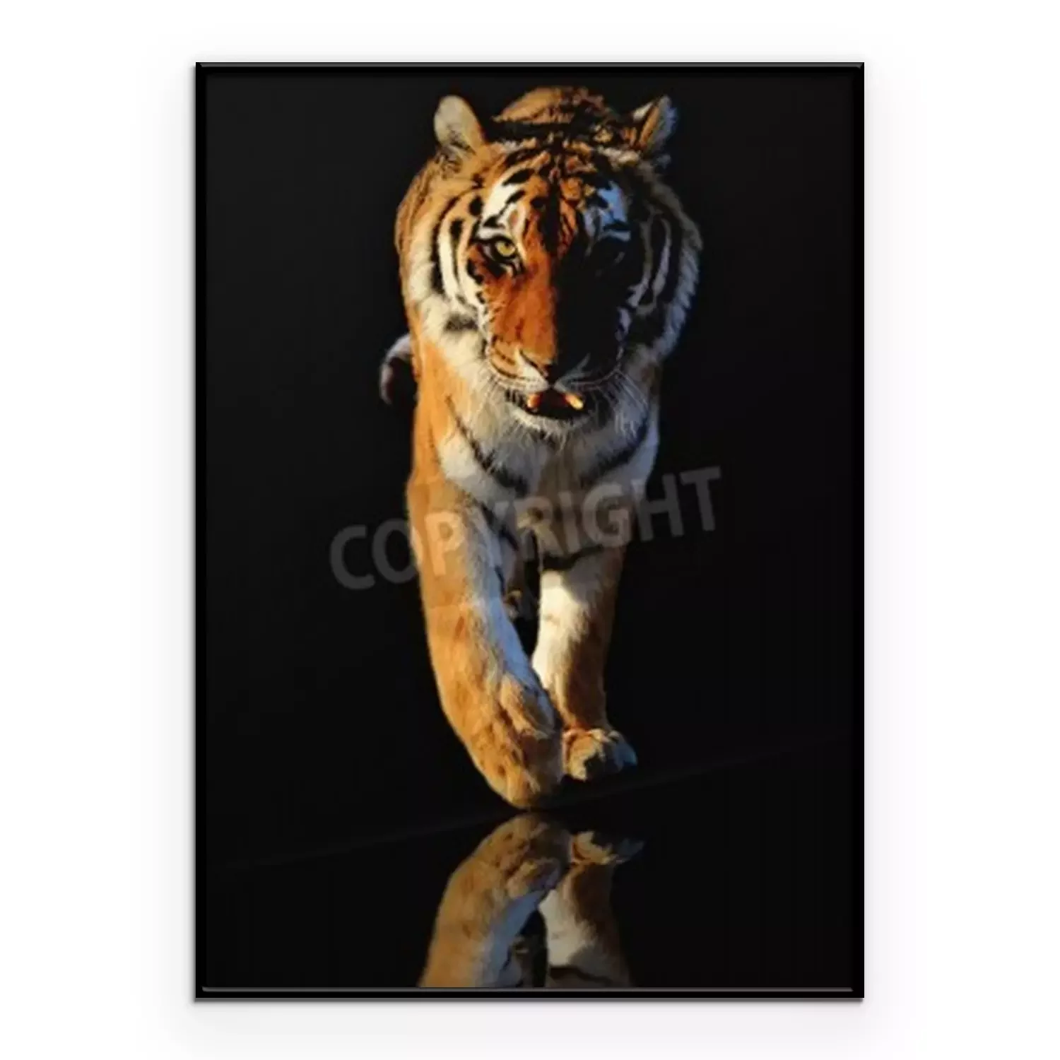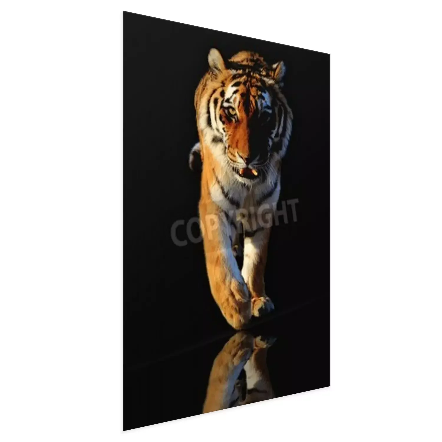 Poster: Tiger in bewegung vor schwarzem hintergrund