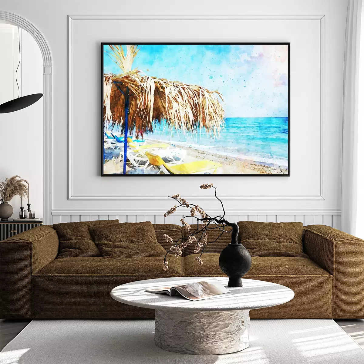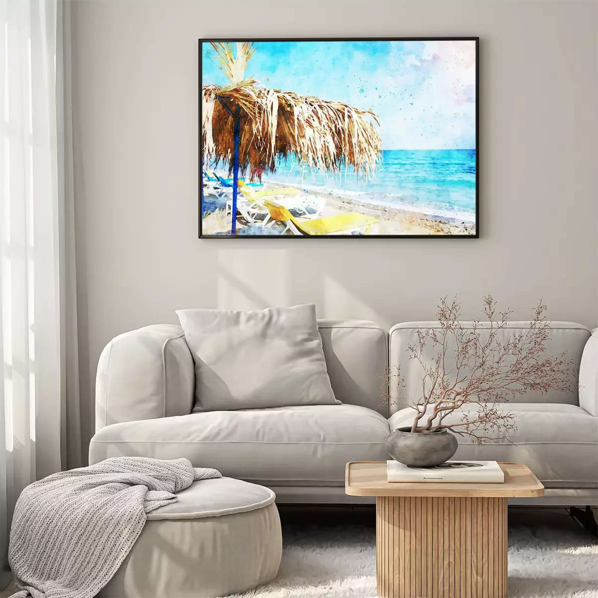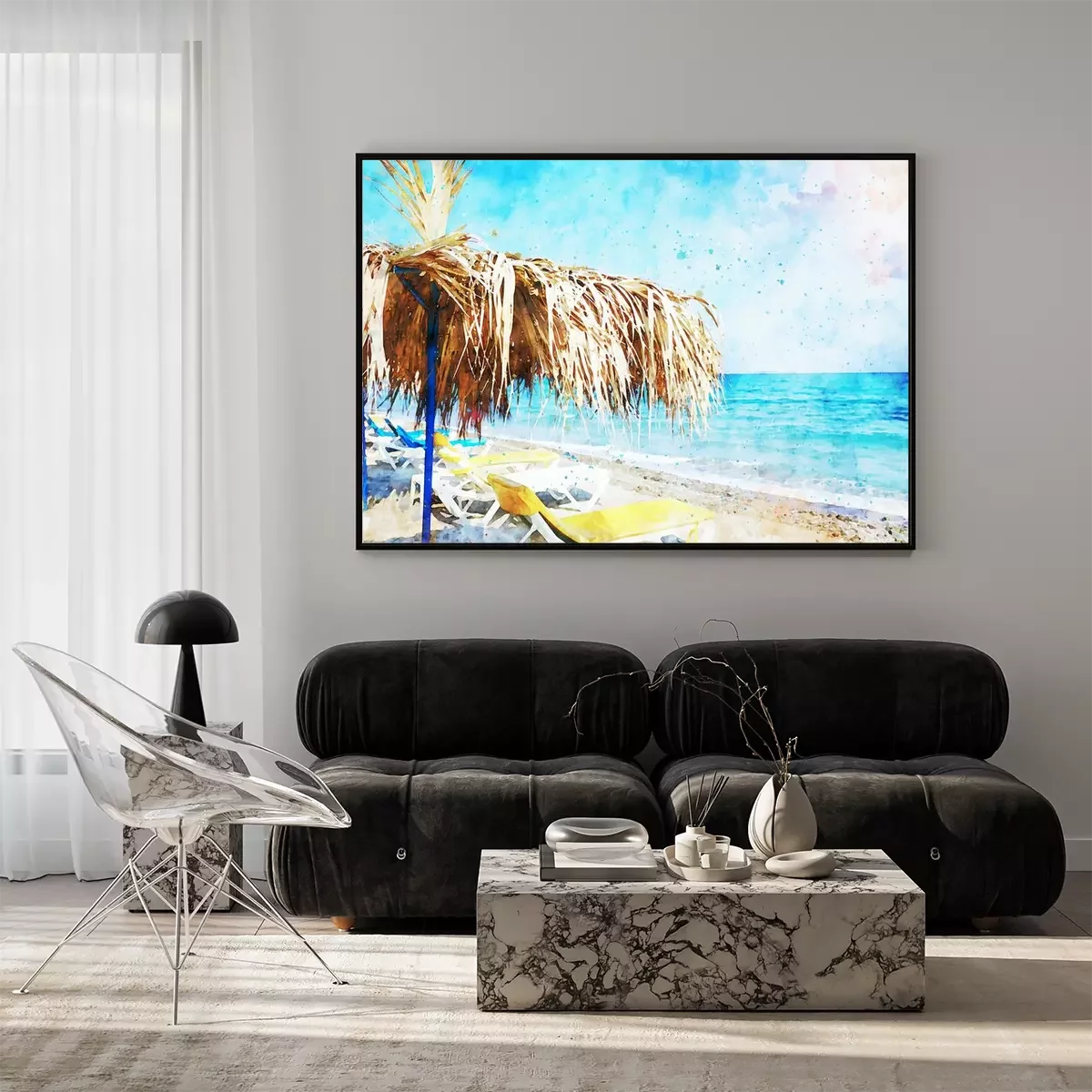 Aquarell mit Strand und Sonnenliegen