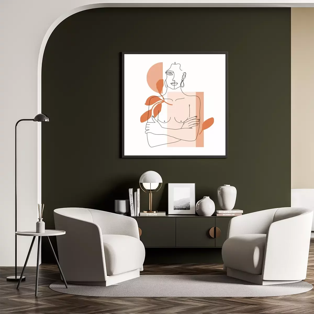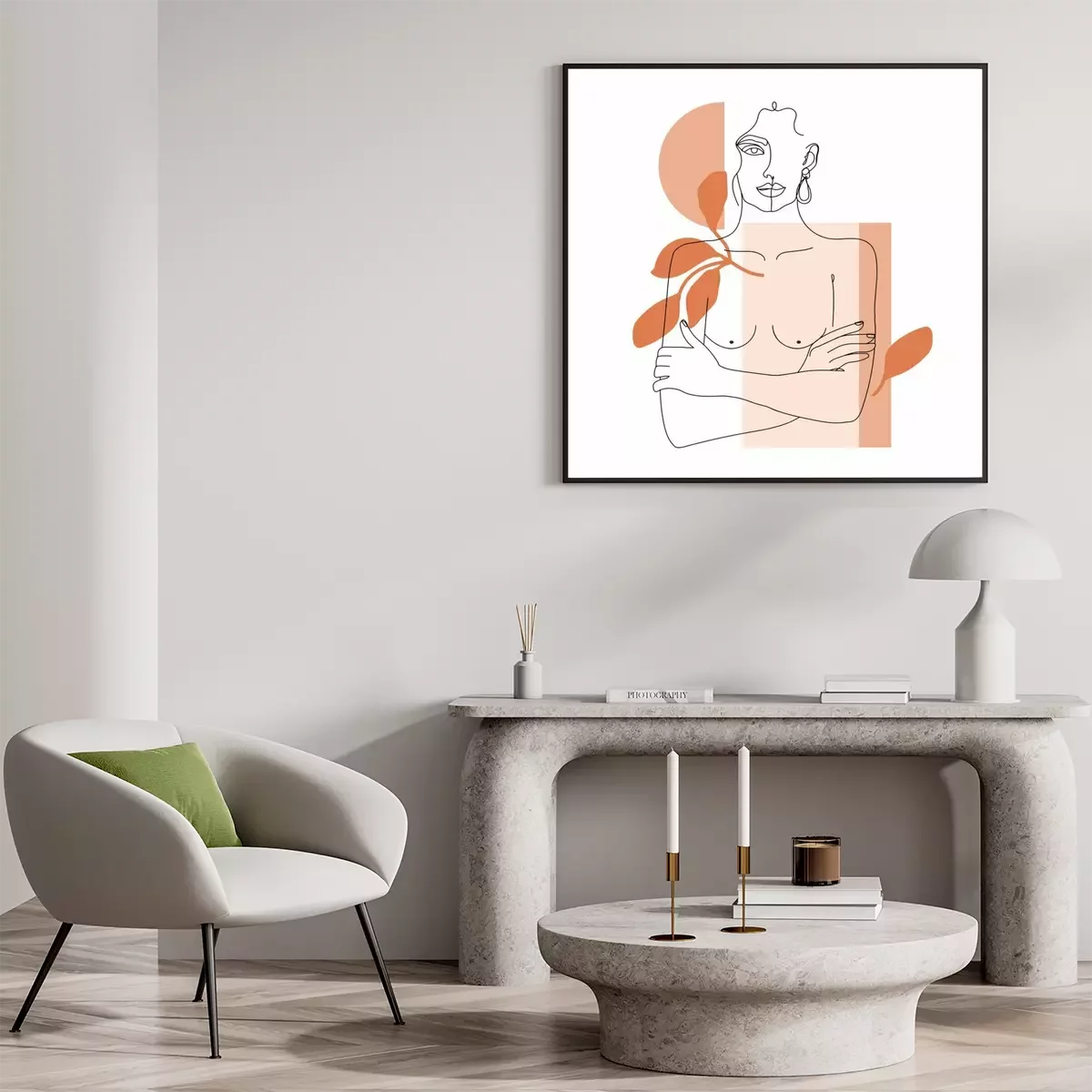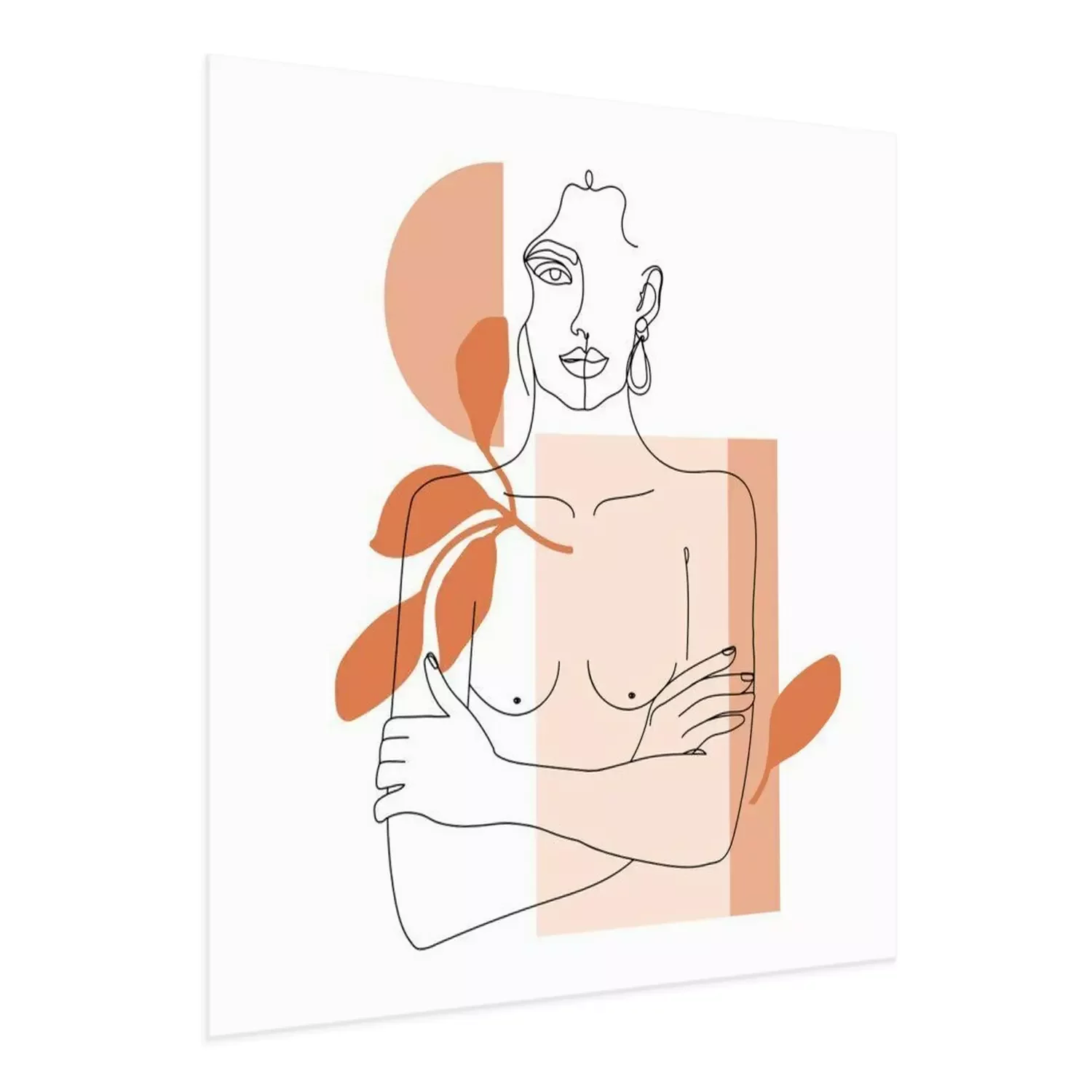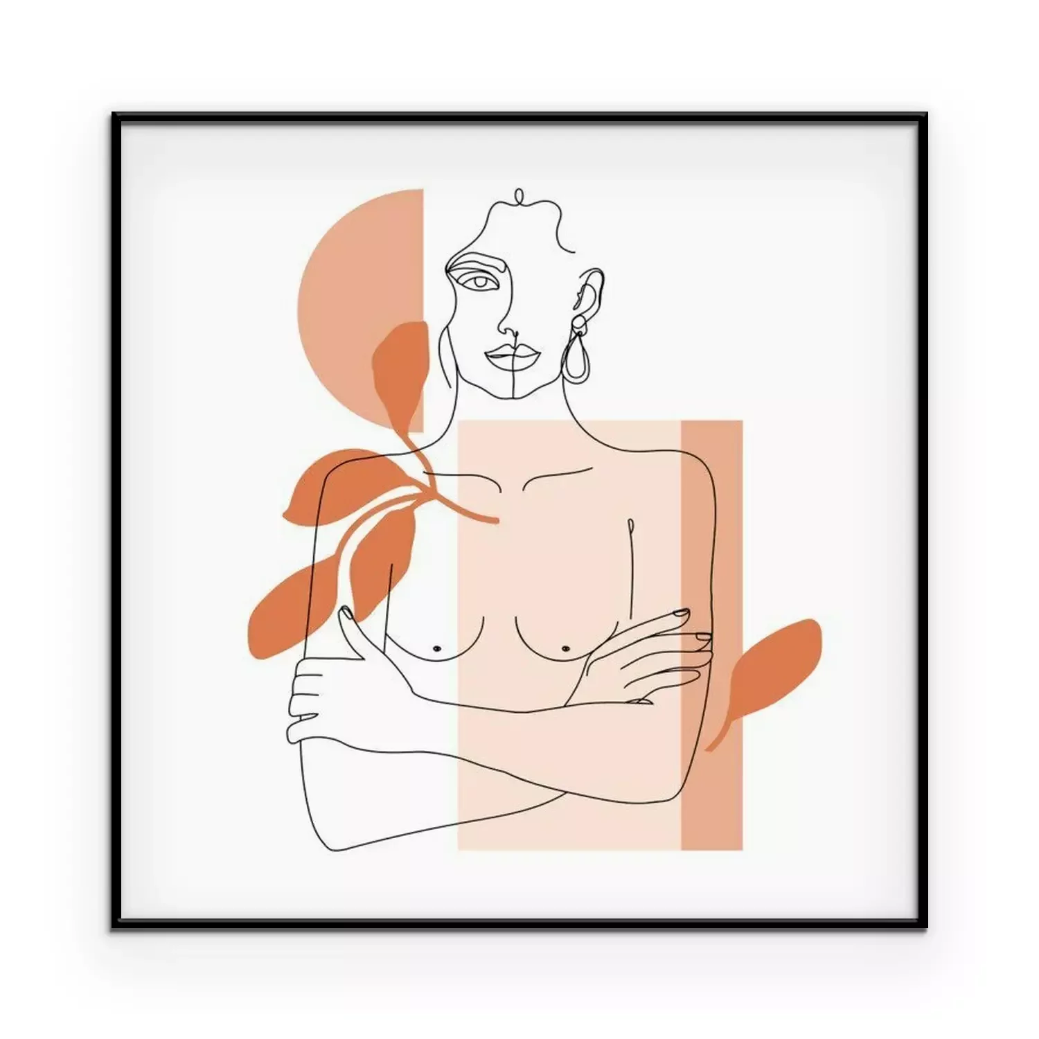 Poster: Trendy one line woman body with abstract geometric shapes. Girl crossing arms on her chest. Elegant continuous line print for textile, poster, card, t-shirt etc. Vector fashion illustration.