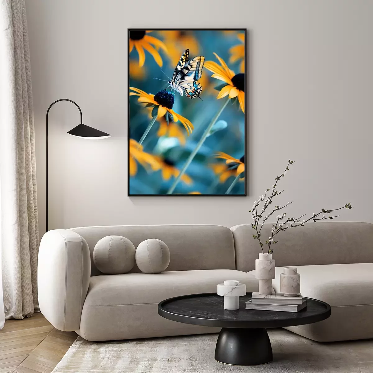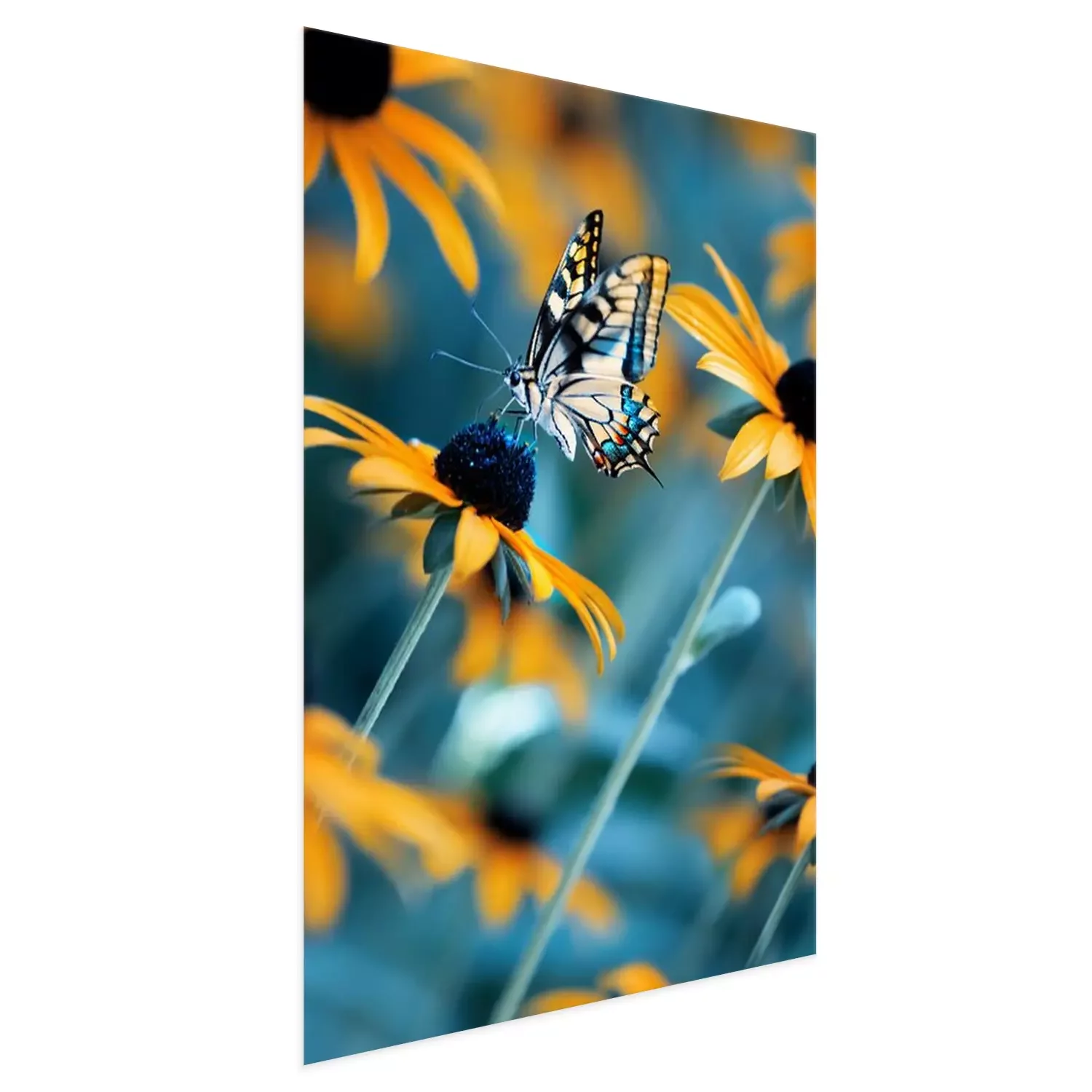 Poster: Tropical bright butterfly on an orange flower in a summer magic garden. Summer natural artistic image.