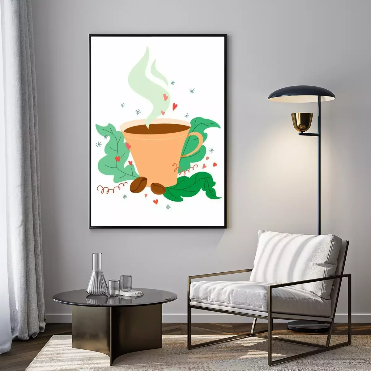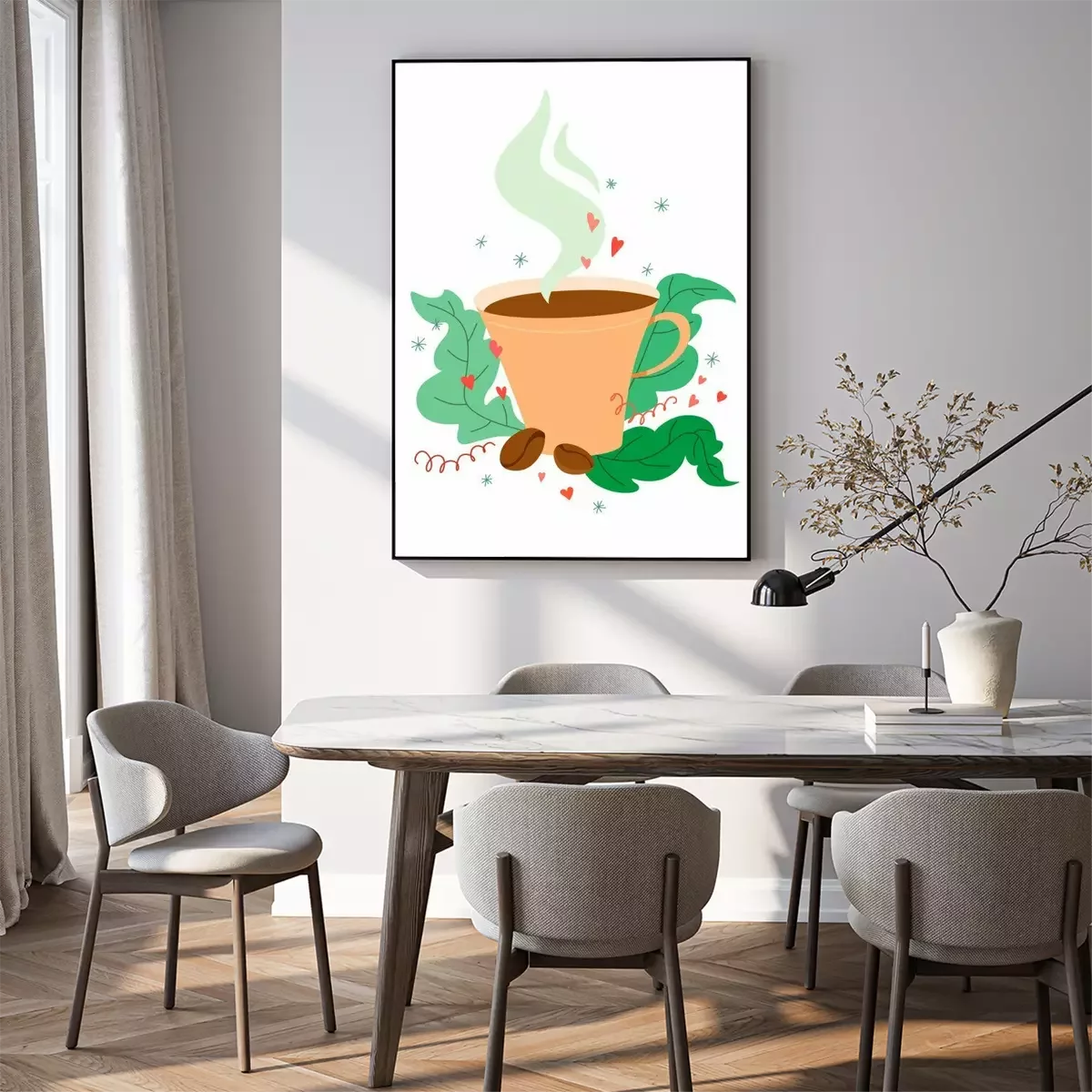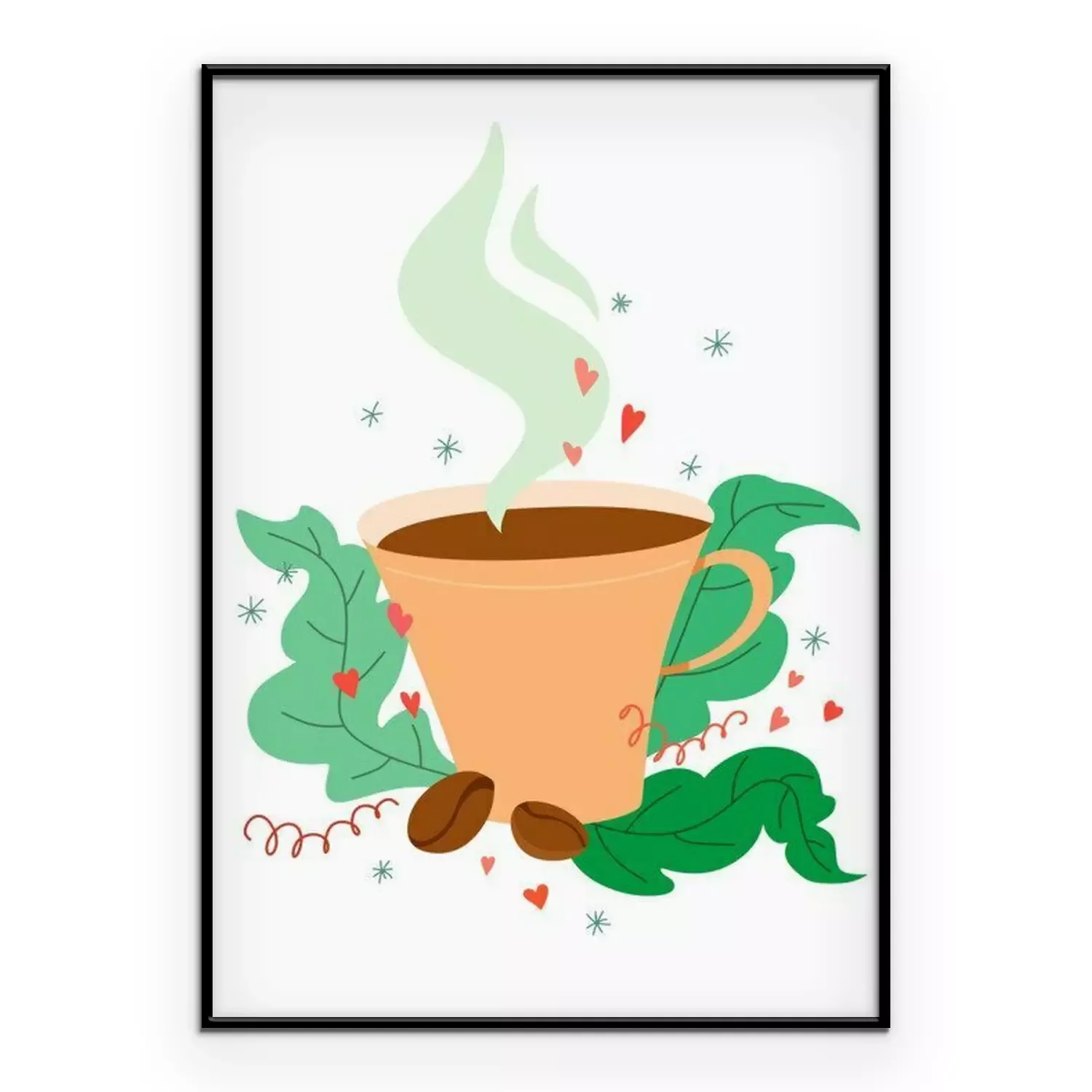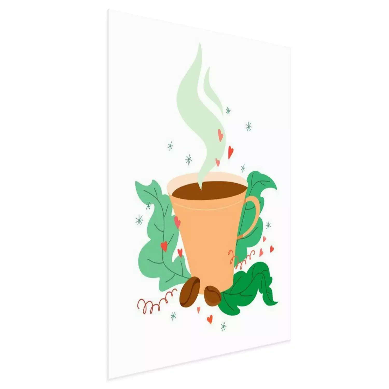 Poster: Unique and cute coffee mug with coffee beans in a cartoon style with decor. Vector on white background