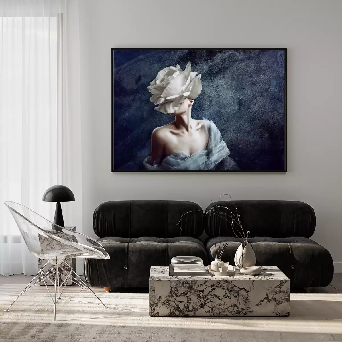 Surrealistisches künstlerisches Konzept einer Frau mit Pfingstrosenkopf