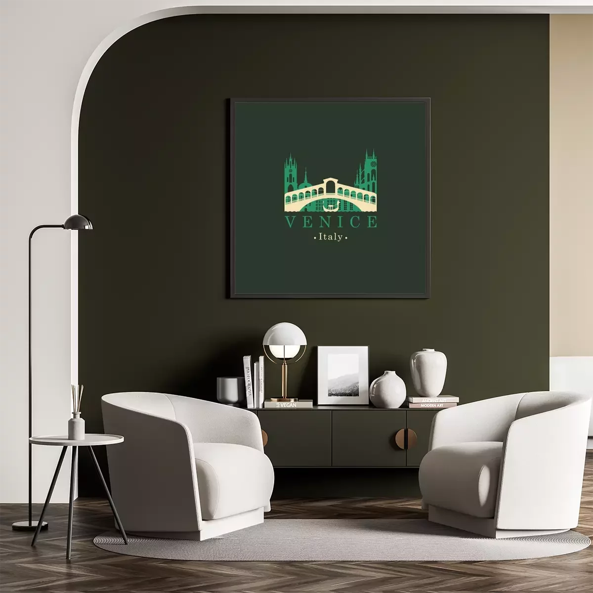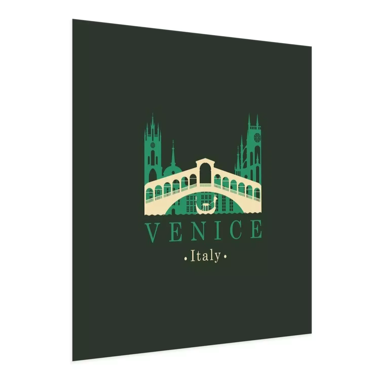Poster Vector Reiseillustration, -fahne oder -ikone. Rialto Brücke Logo. Ponte di Rialto und die Gondel auf einem Hintergrund der alten Gebäude von Venedig. Venedig Wahrzeichen. Italienische architektonische