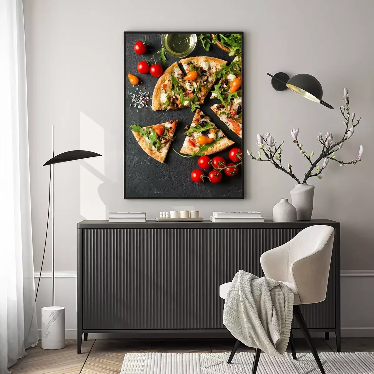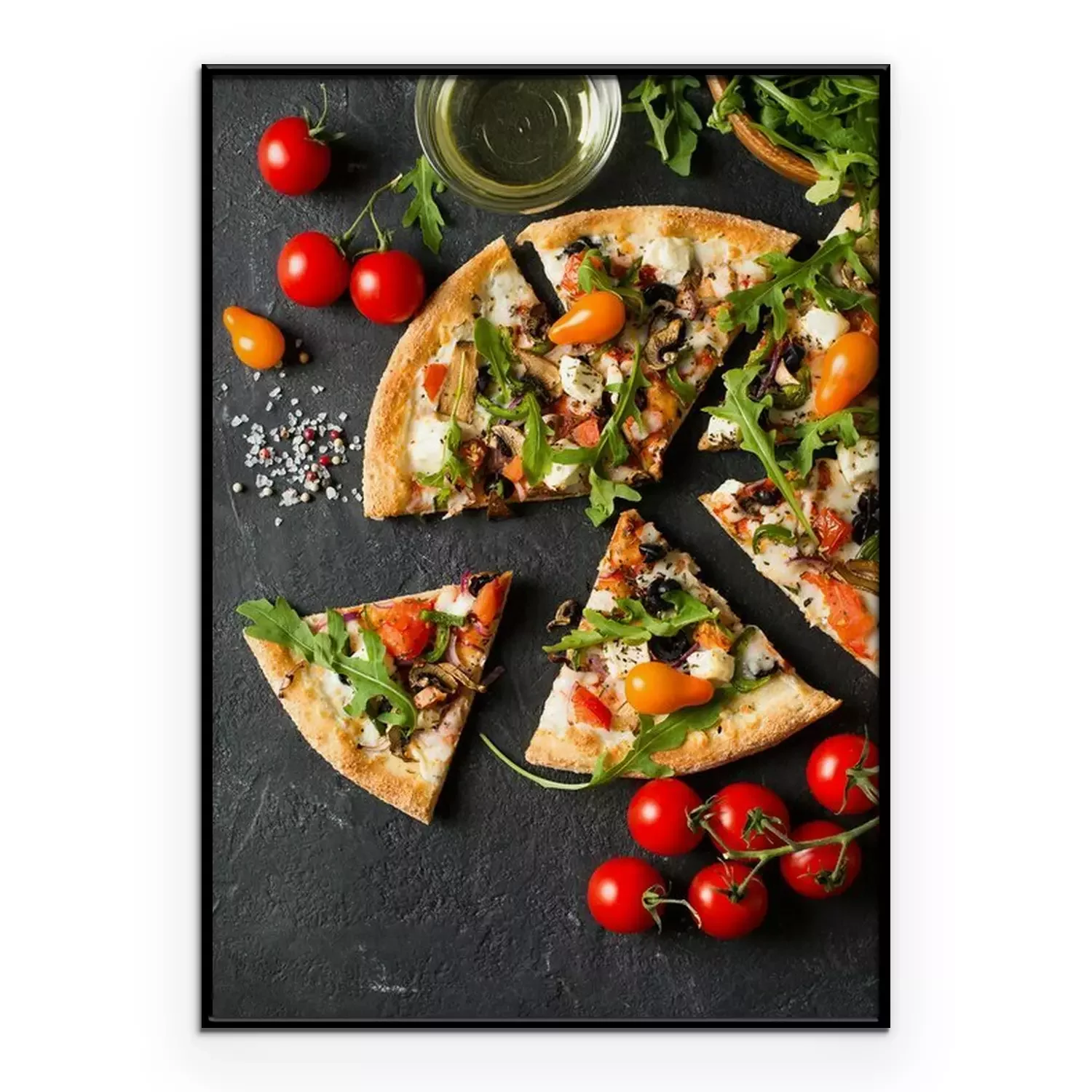 Poster Vegetable italian pizza with tomatos on black background