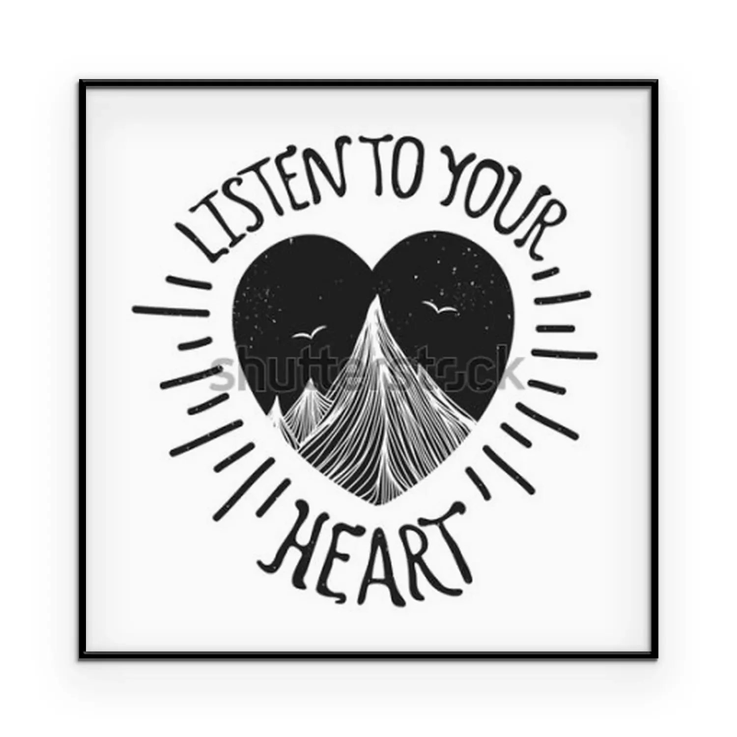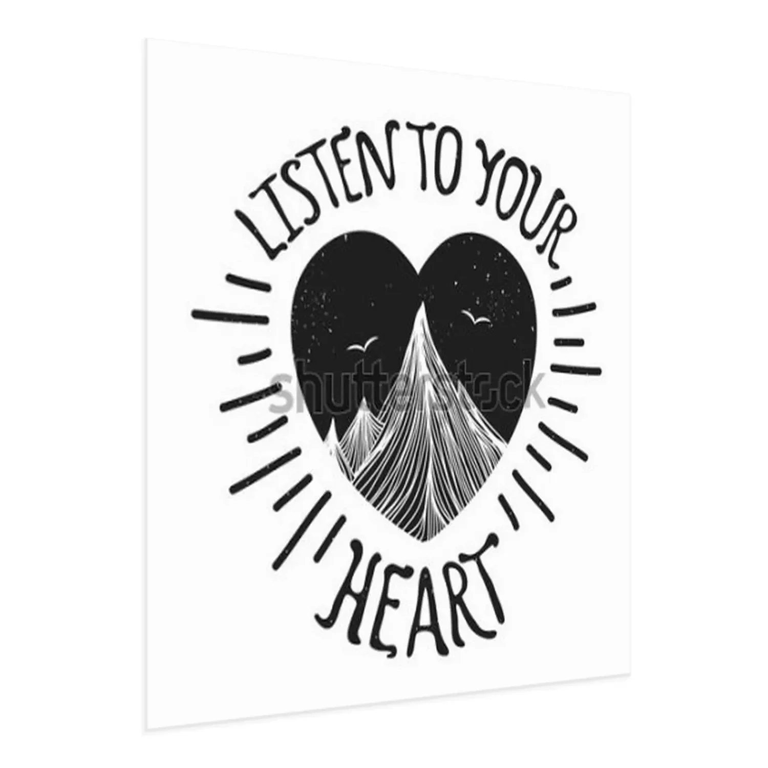 Poster Vektorillustration mit Bergen innerhalb des Herzens. Hören Sie auf Ihr Herz - Zitat. Motivation und Inspiration Typografie Poster mit Text. Grußkartenentwurf, T-Shirt Druck, Einklebebuchkunst