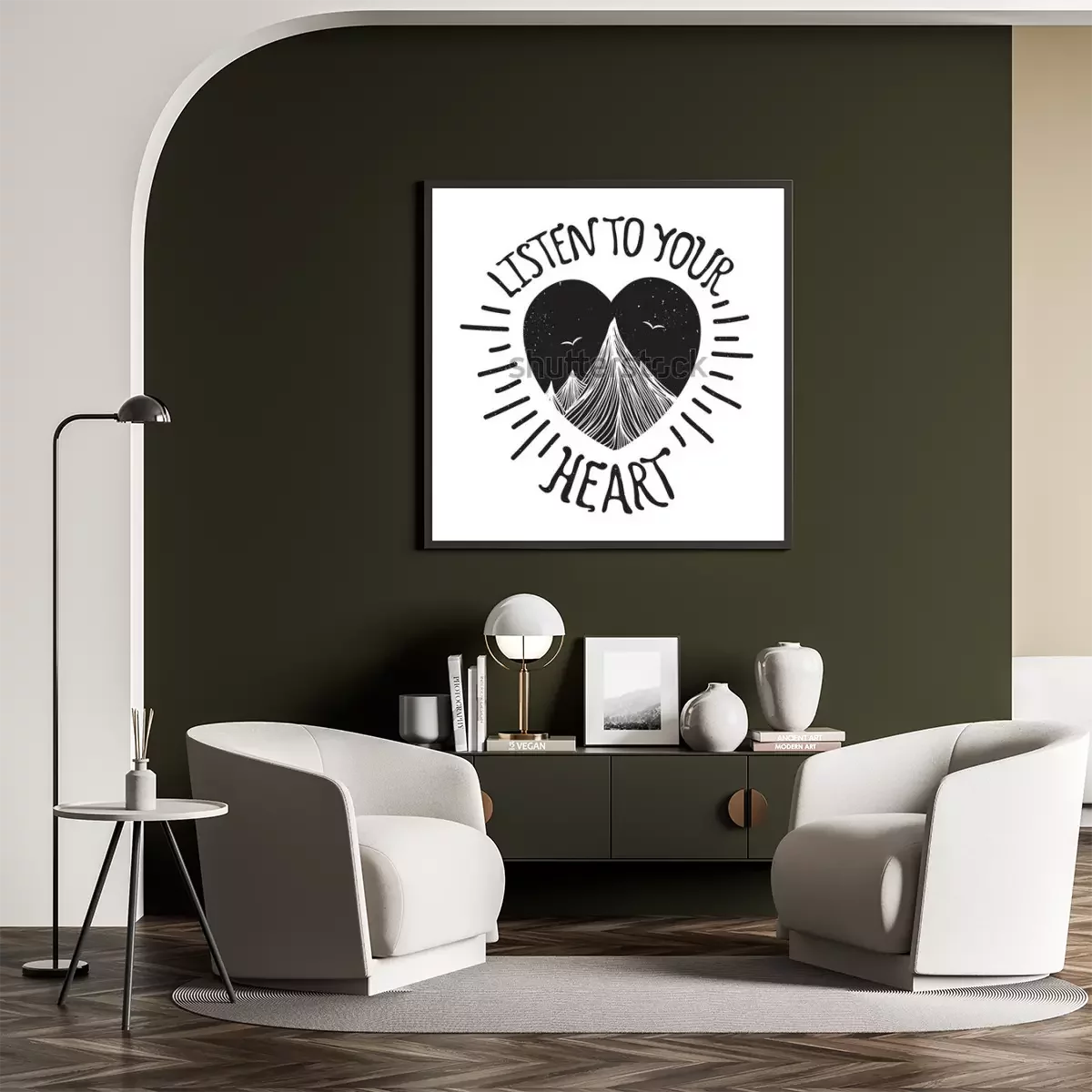 Poster: Vektorillustration mit Bergen innerhalb des Herzens. Hören Sie auf Ihr Herz - Zitat. Motivation und Inspiration Typografie Poster mit Text. Grußkartenentwurf, T-Shirt Druck, Einklebebuchkunst