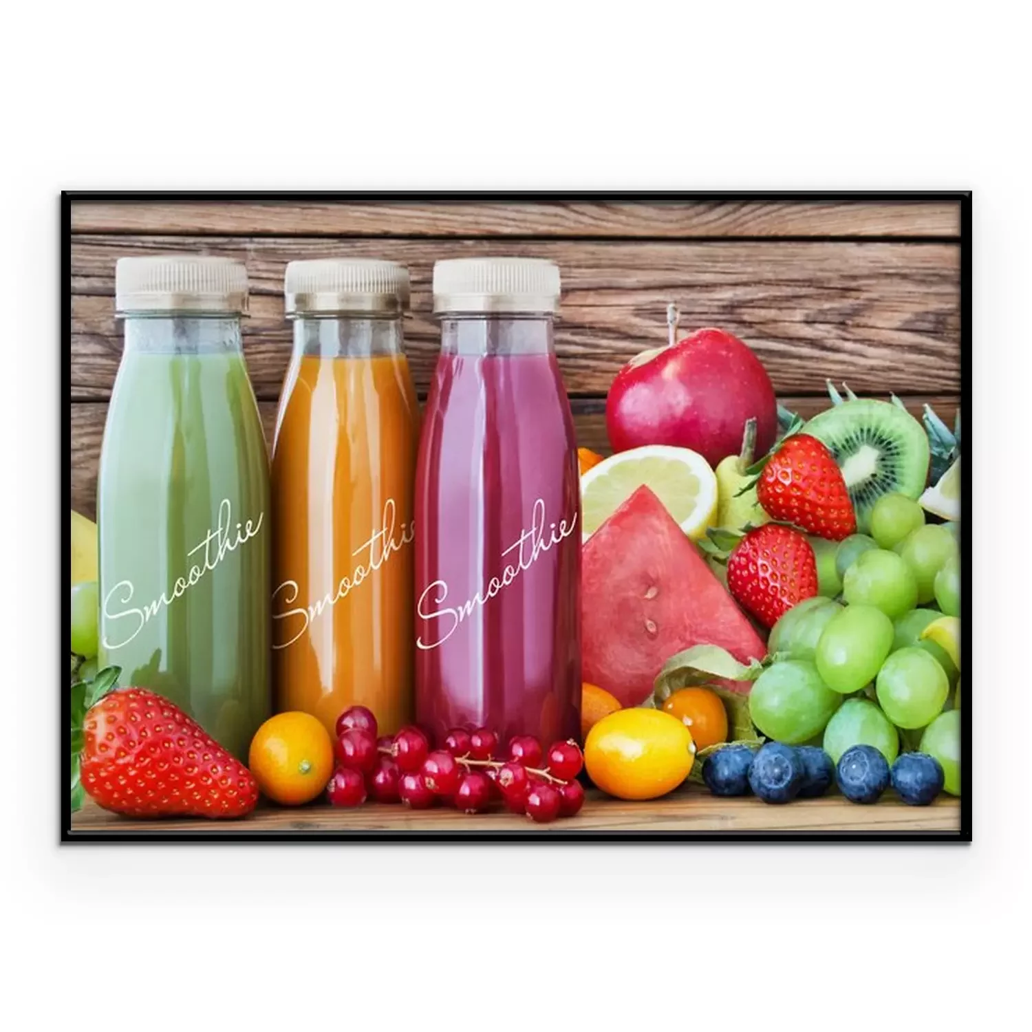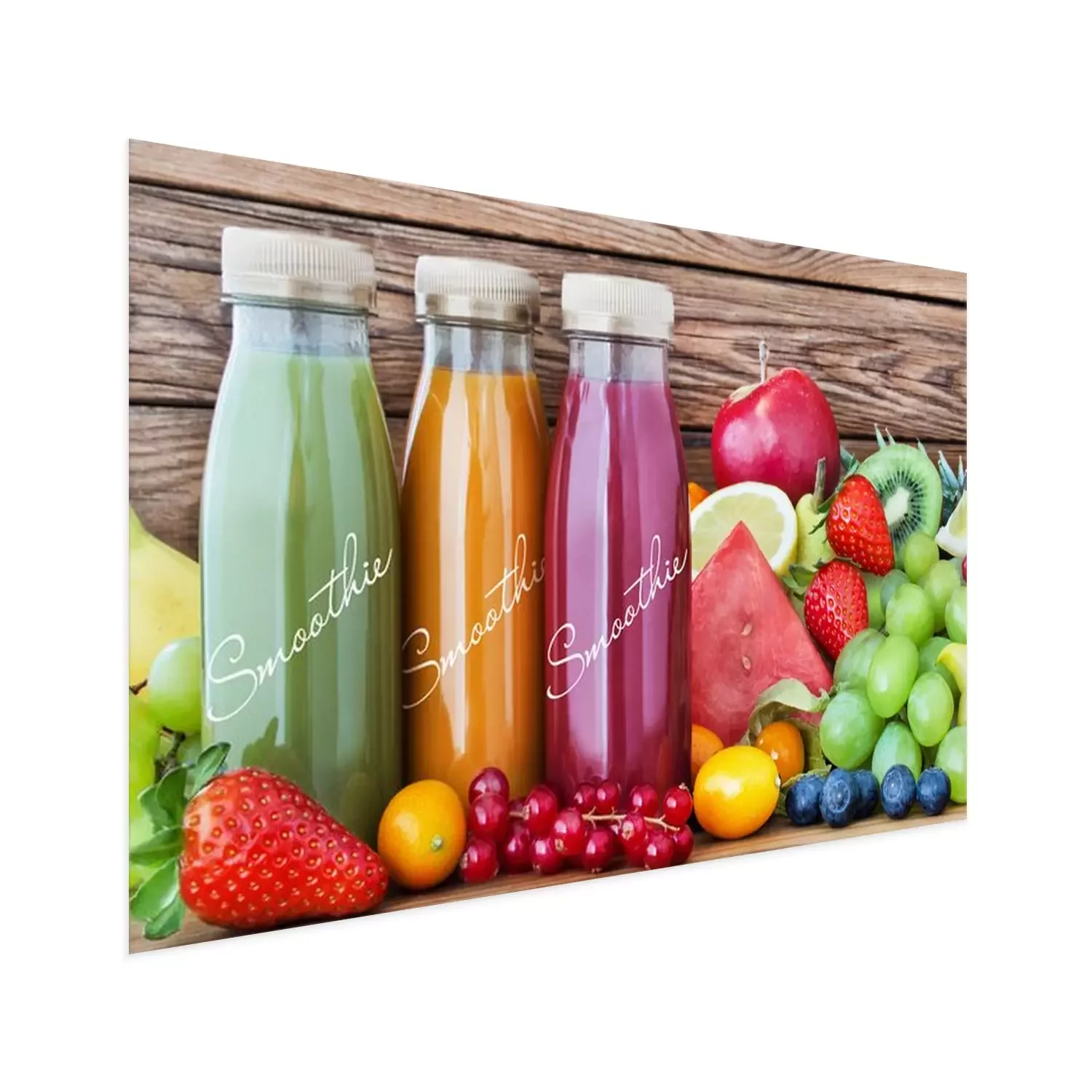 Poster: Verschiedenfarbige Smoothies vor dem Hintergrund der Früchte