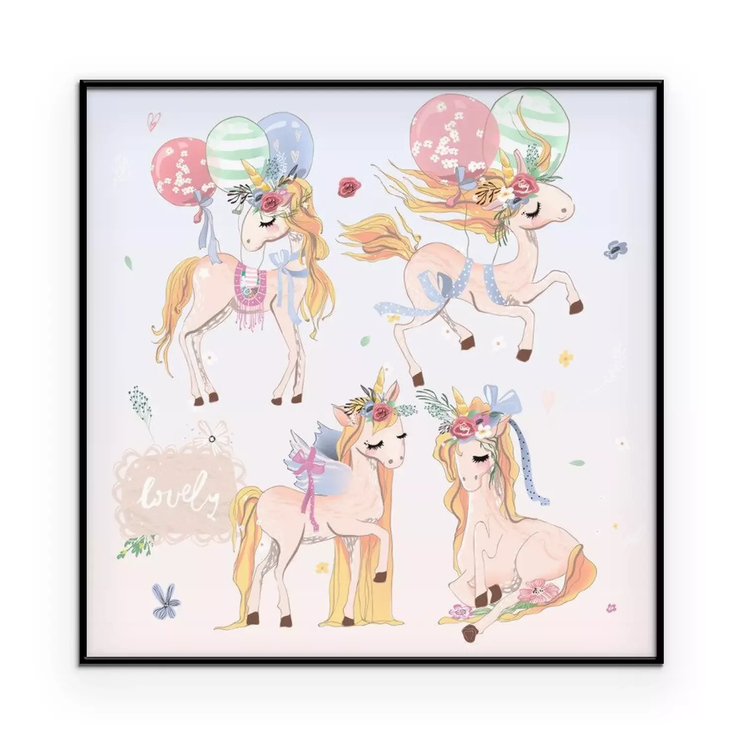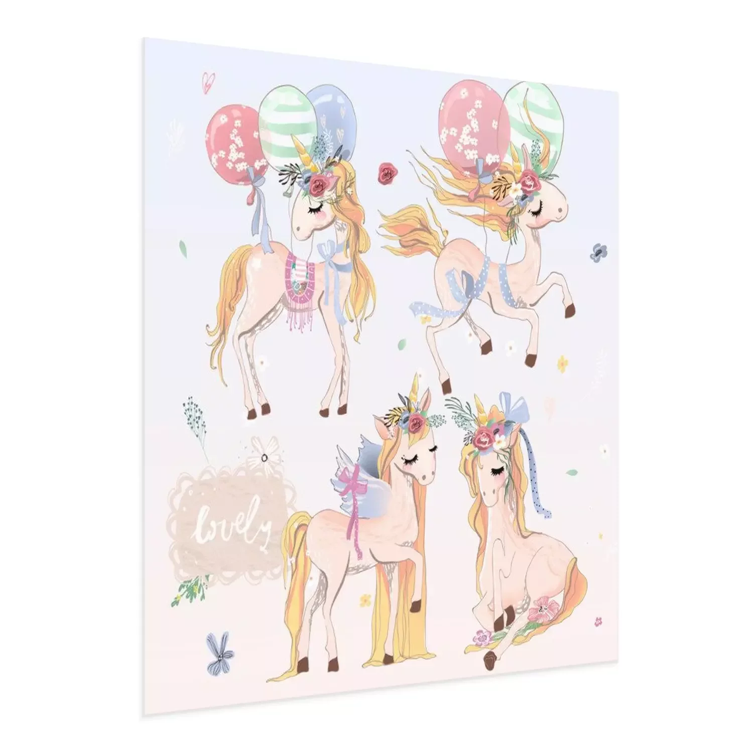 Poster: Vier Einhörner in verschiedenen Posen und Luftballons