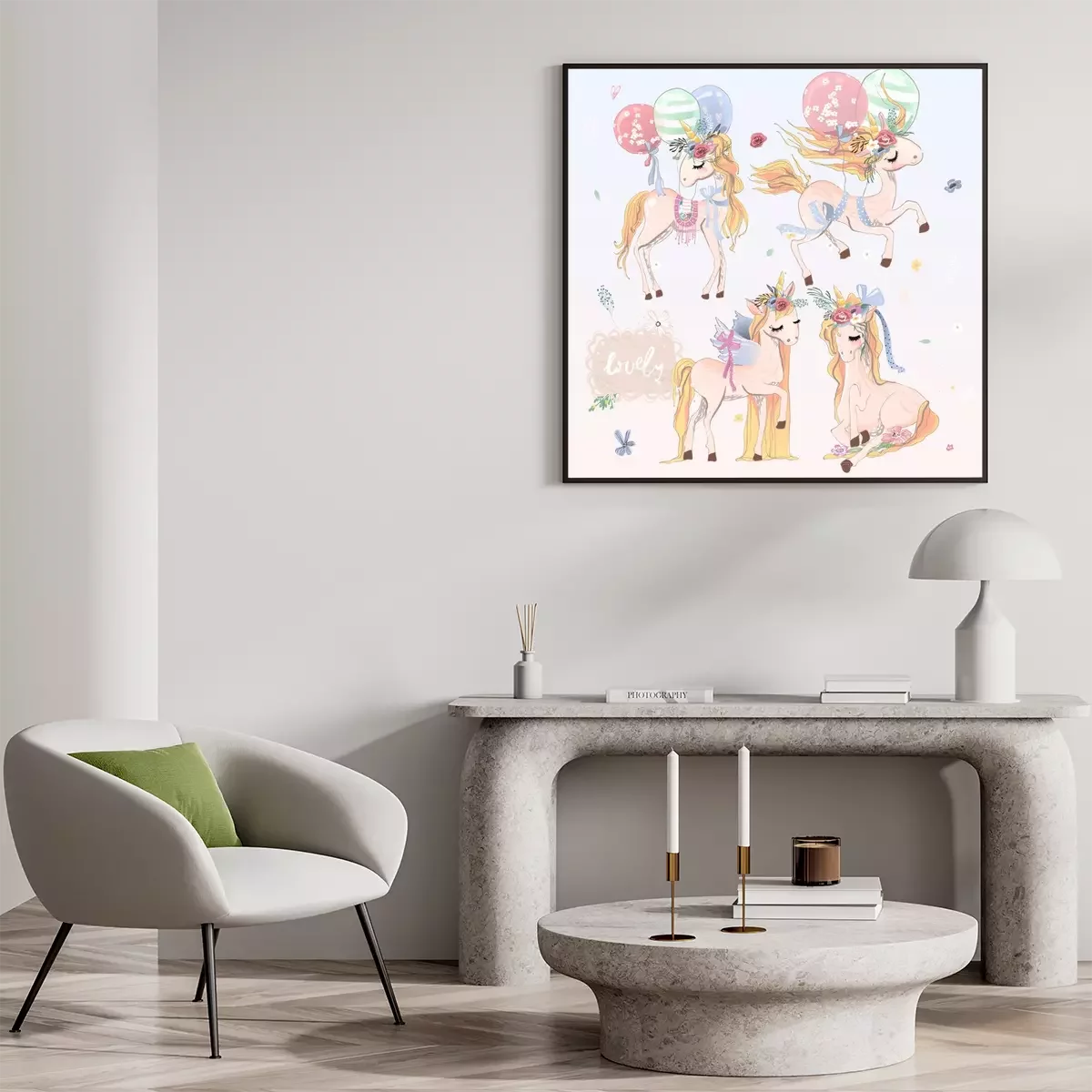 Poster Vier Einhörner in verschiedenen Posen und Luftballons