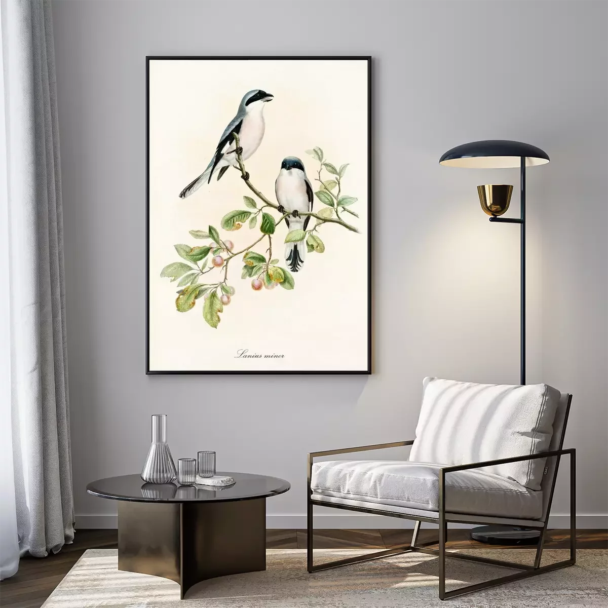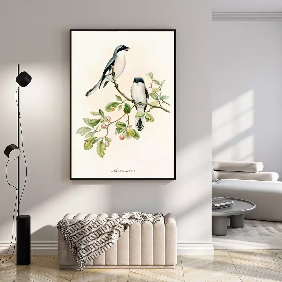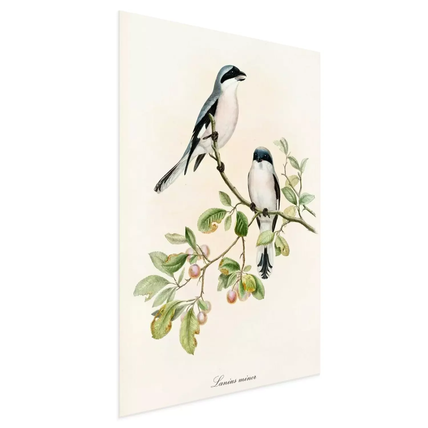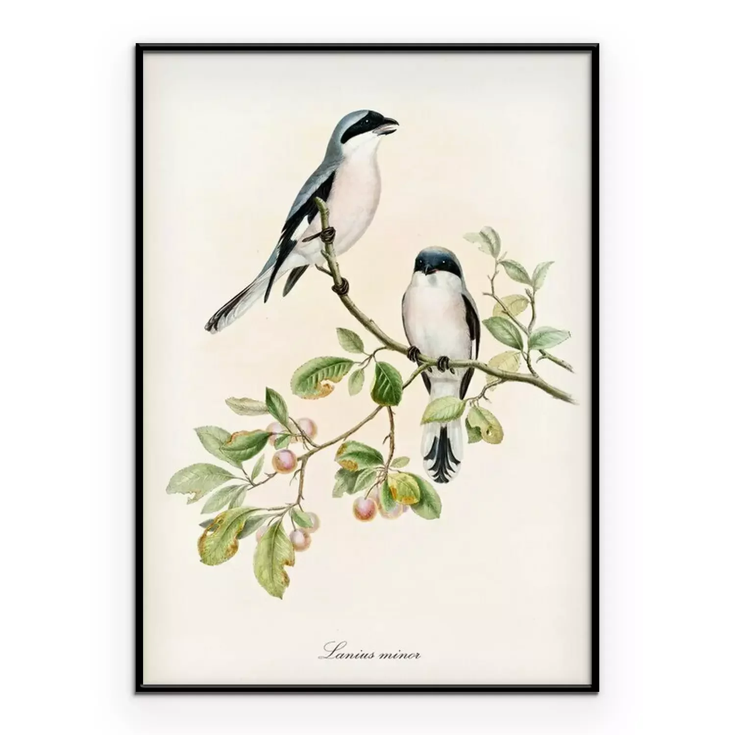 Zeichnung mit Vögeln, die auf mit Blumen bestreuten Zweigen sitzen
