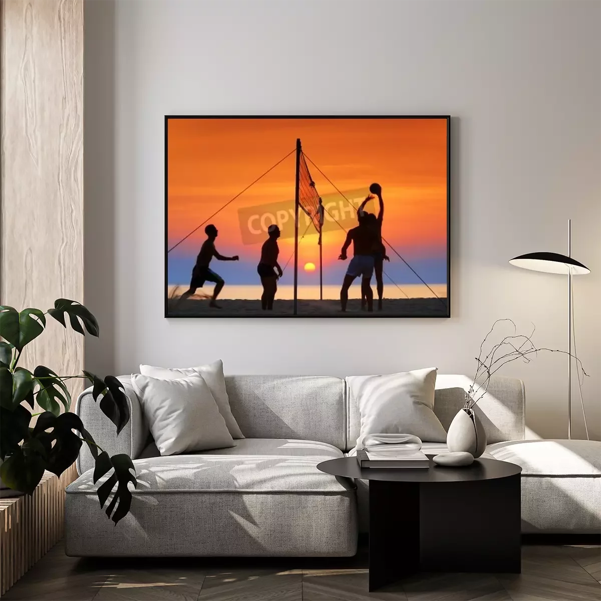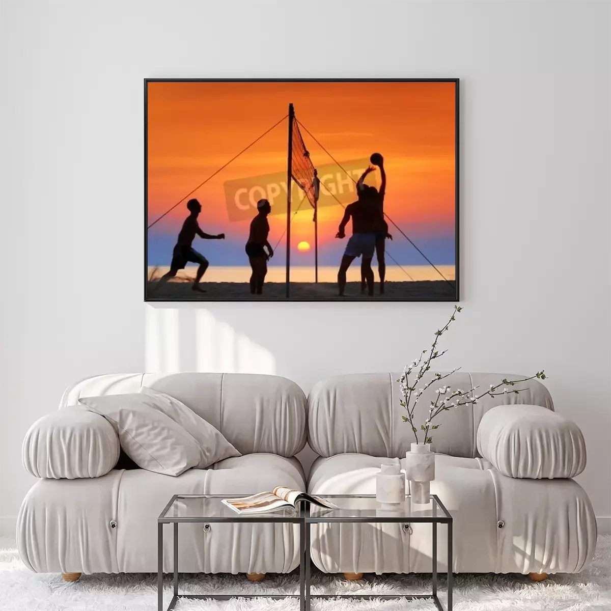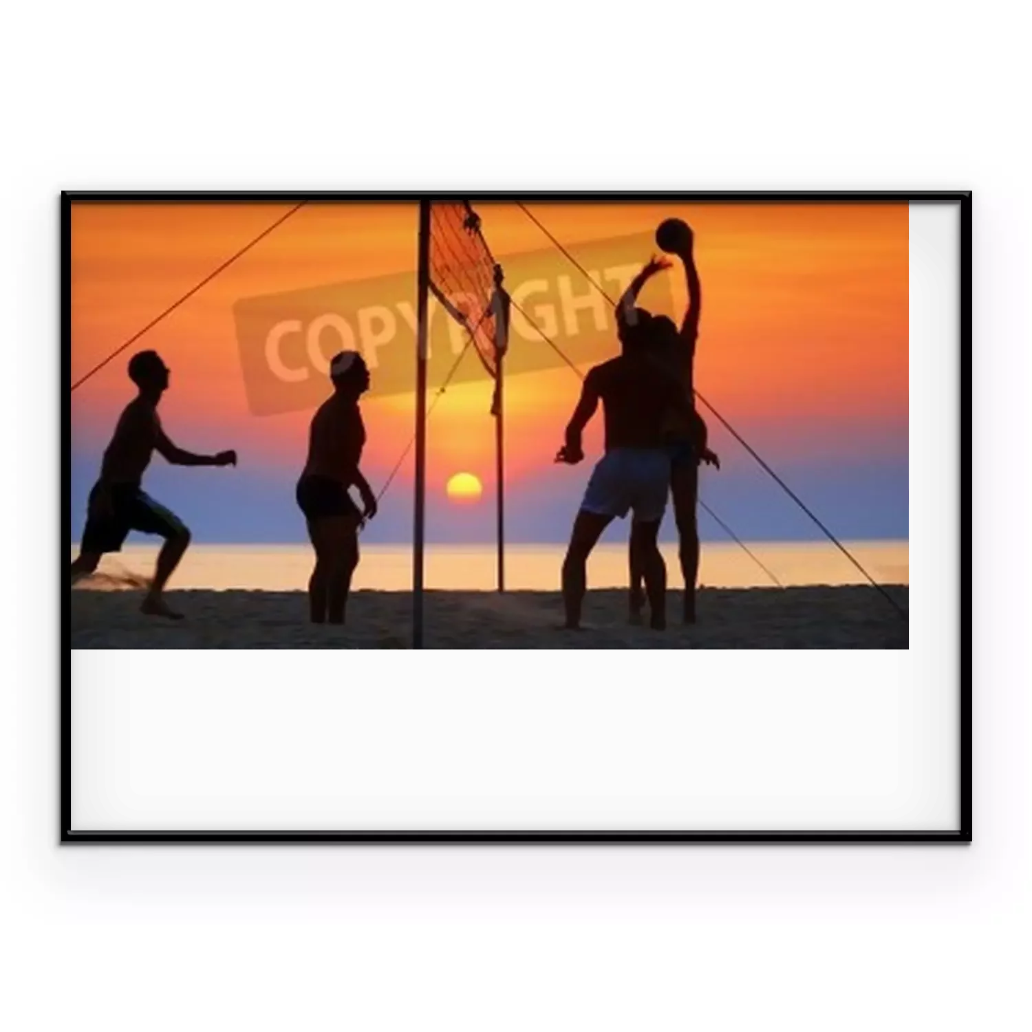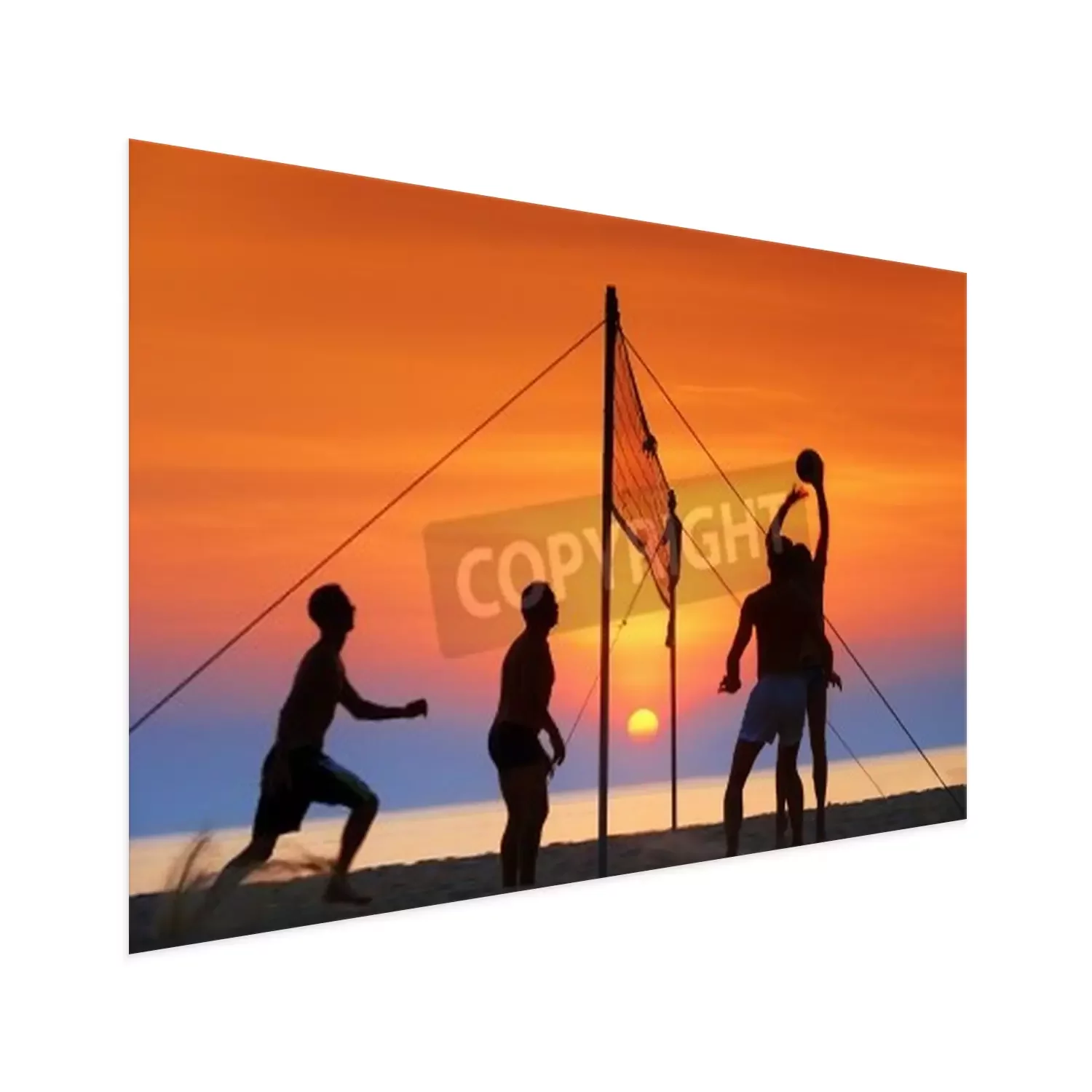 Poster: Volleyball am Strand Spiel bei Sonnenuntergang
