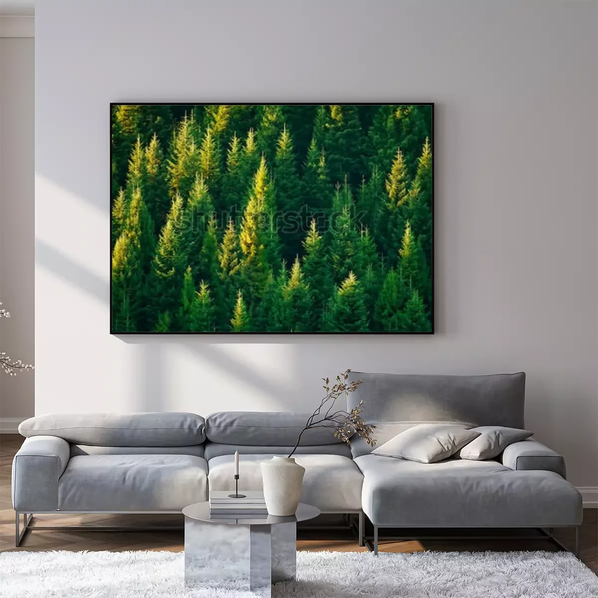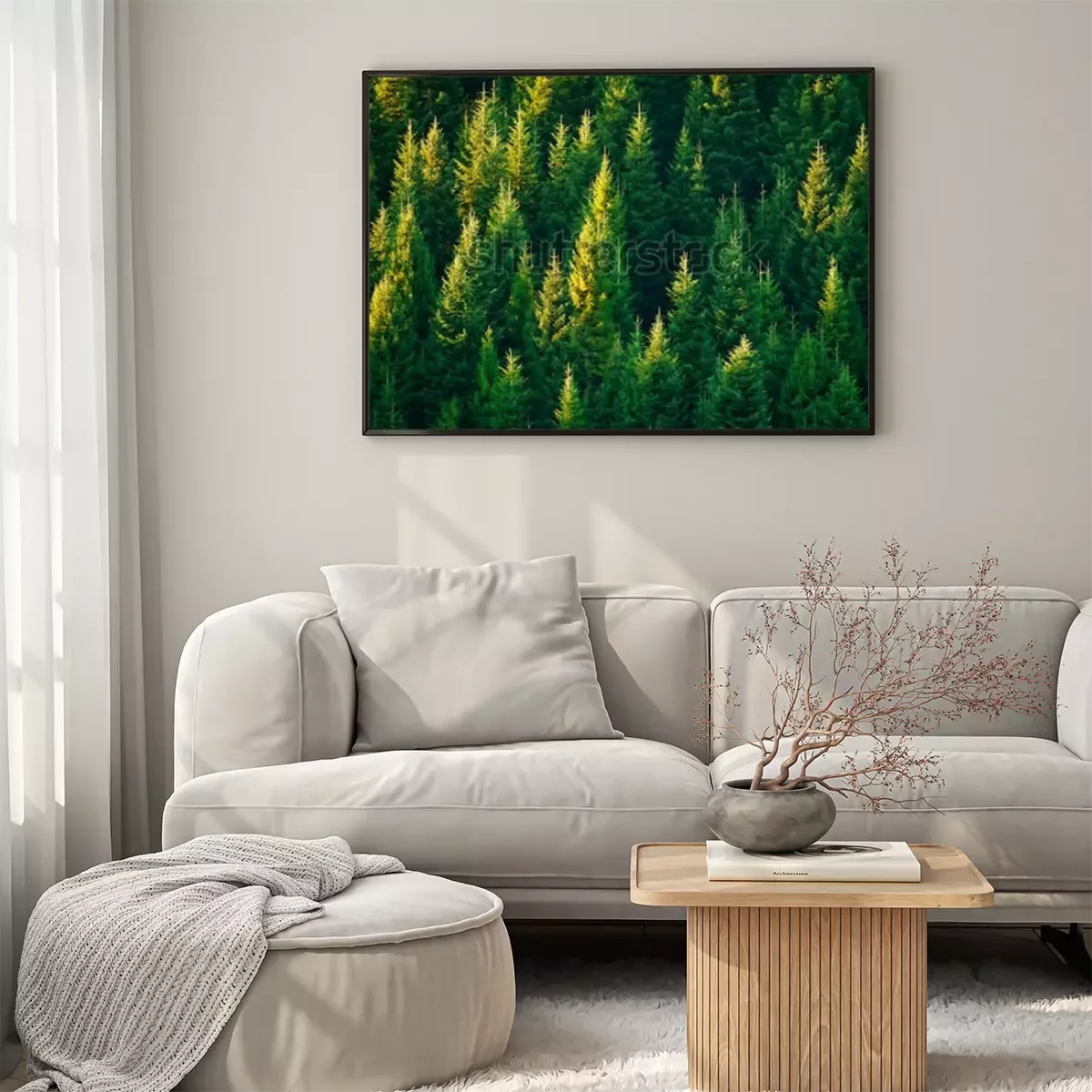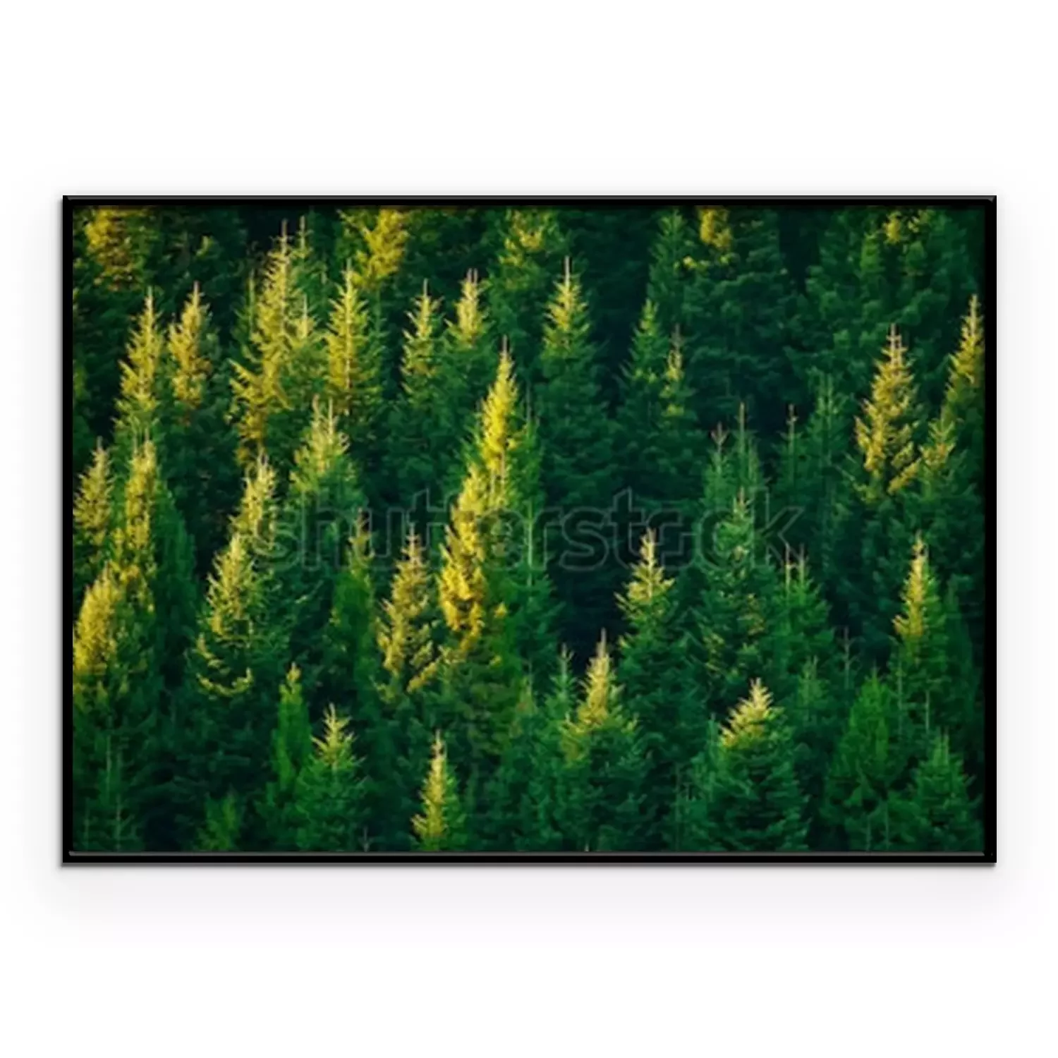 Poster: Von oben von Sonnenstrahlen beleuchteter Wald