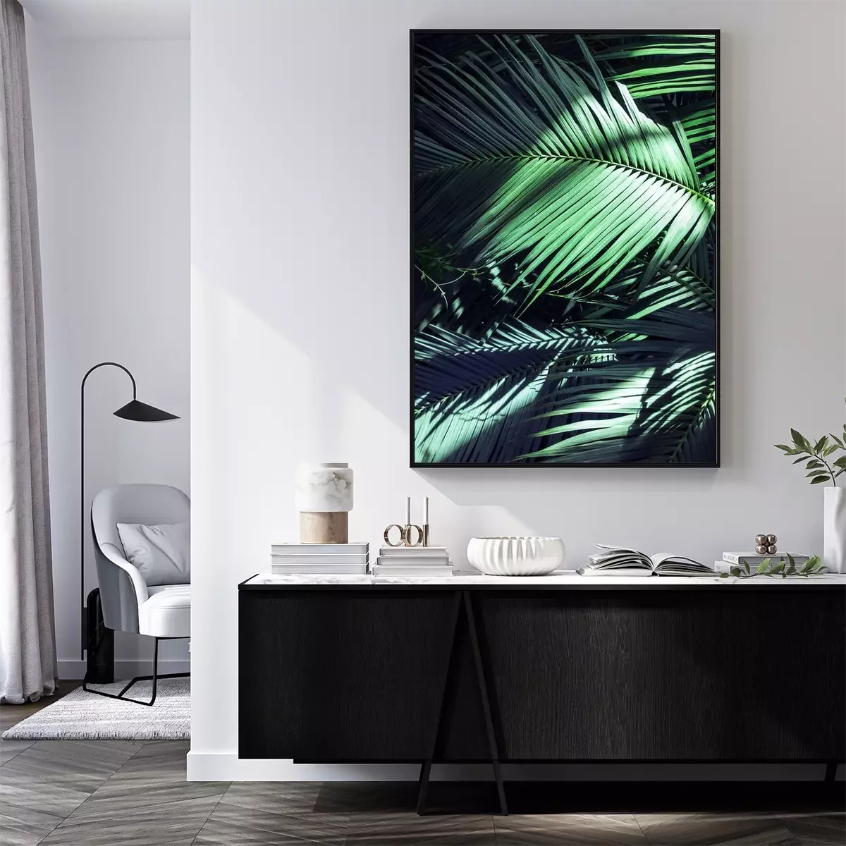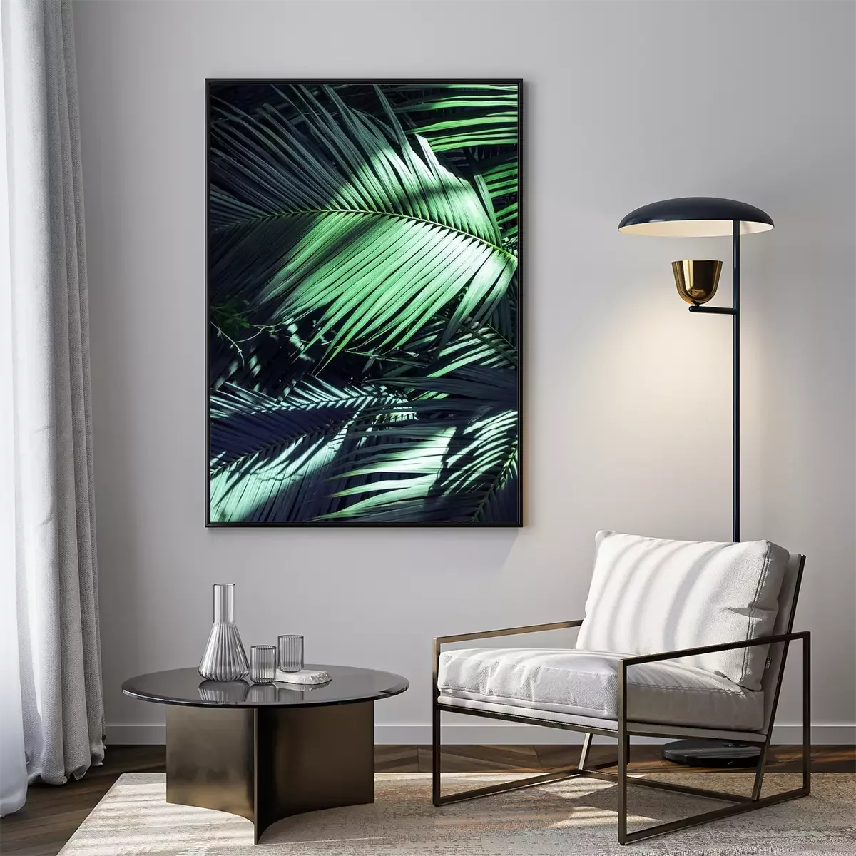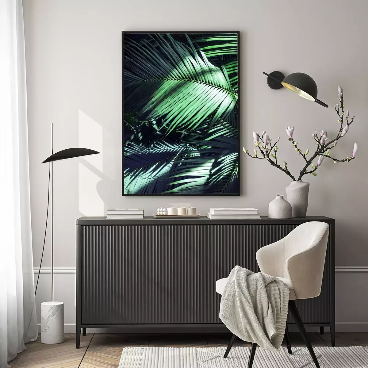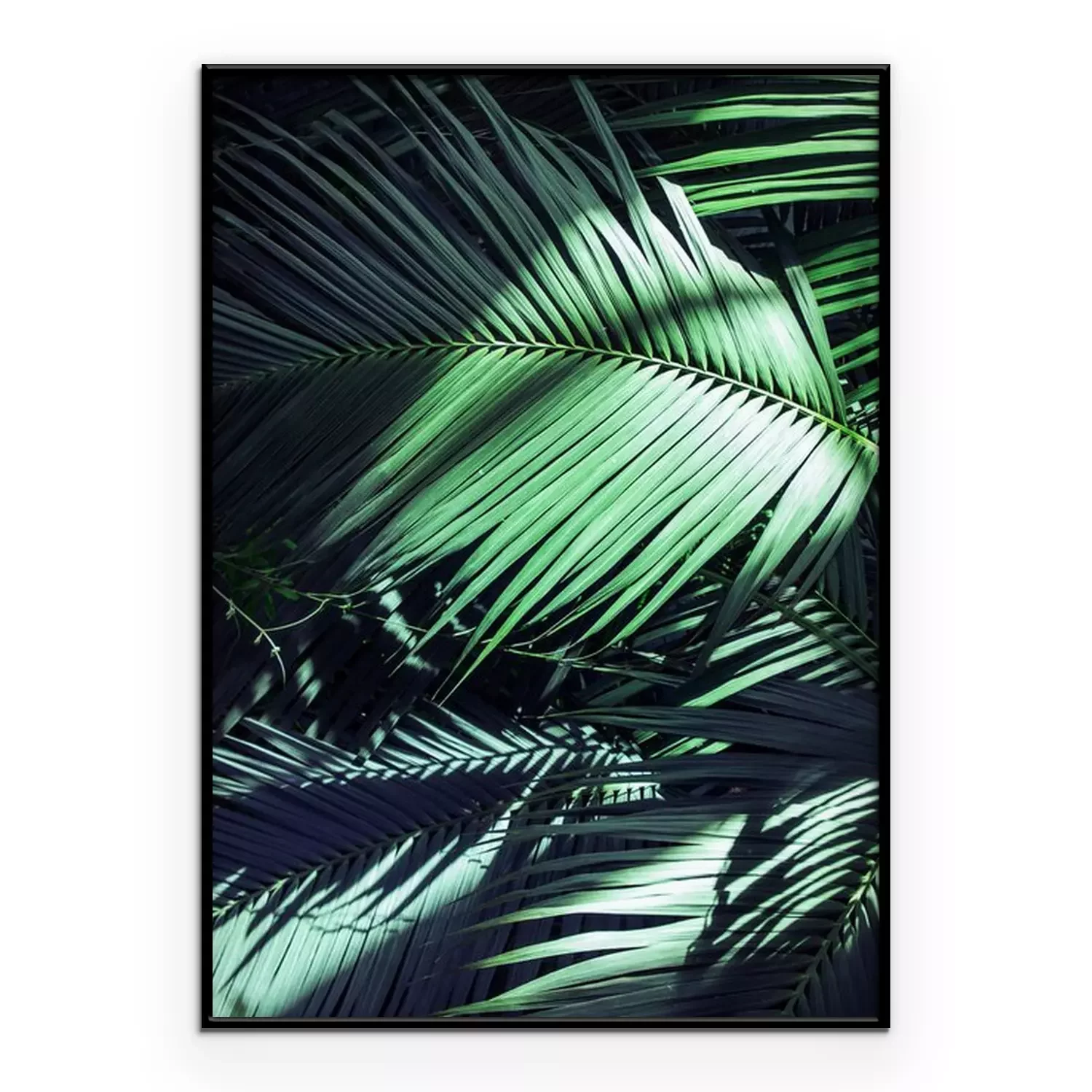 Poster: Von Sonnenstrahlen beleuchtete Palmenblätter